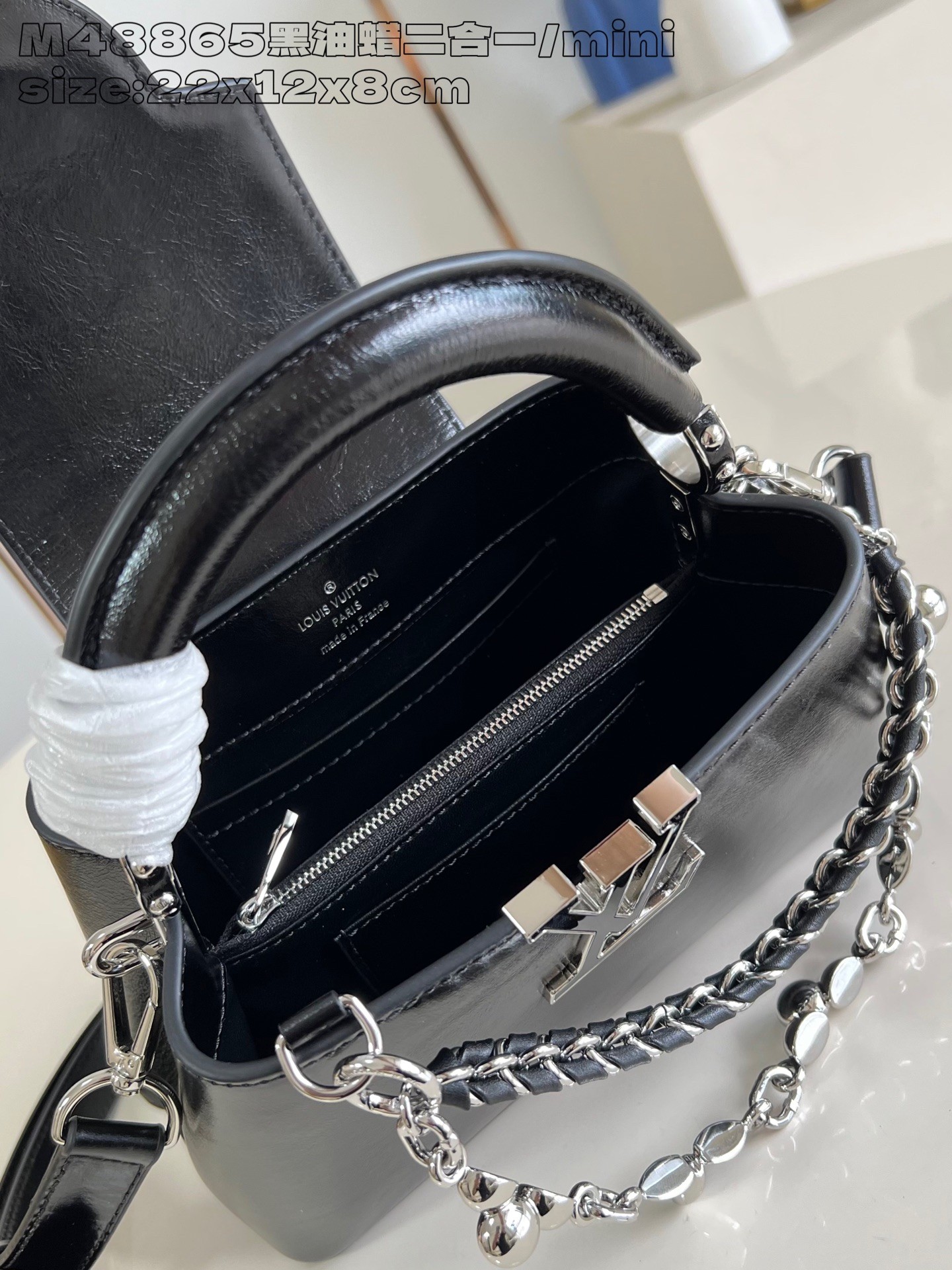The Louis Vuitton Capucines East-West Mini handbag embodies a blend of sophistication and contemporary design, drawing inspiration from Louis Vuitton's beauty line to create a statement piece. Its unique silhouette and exquisite detailing make it a must-have accessory for the discerning fashion enthusiast.
