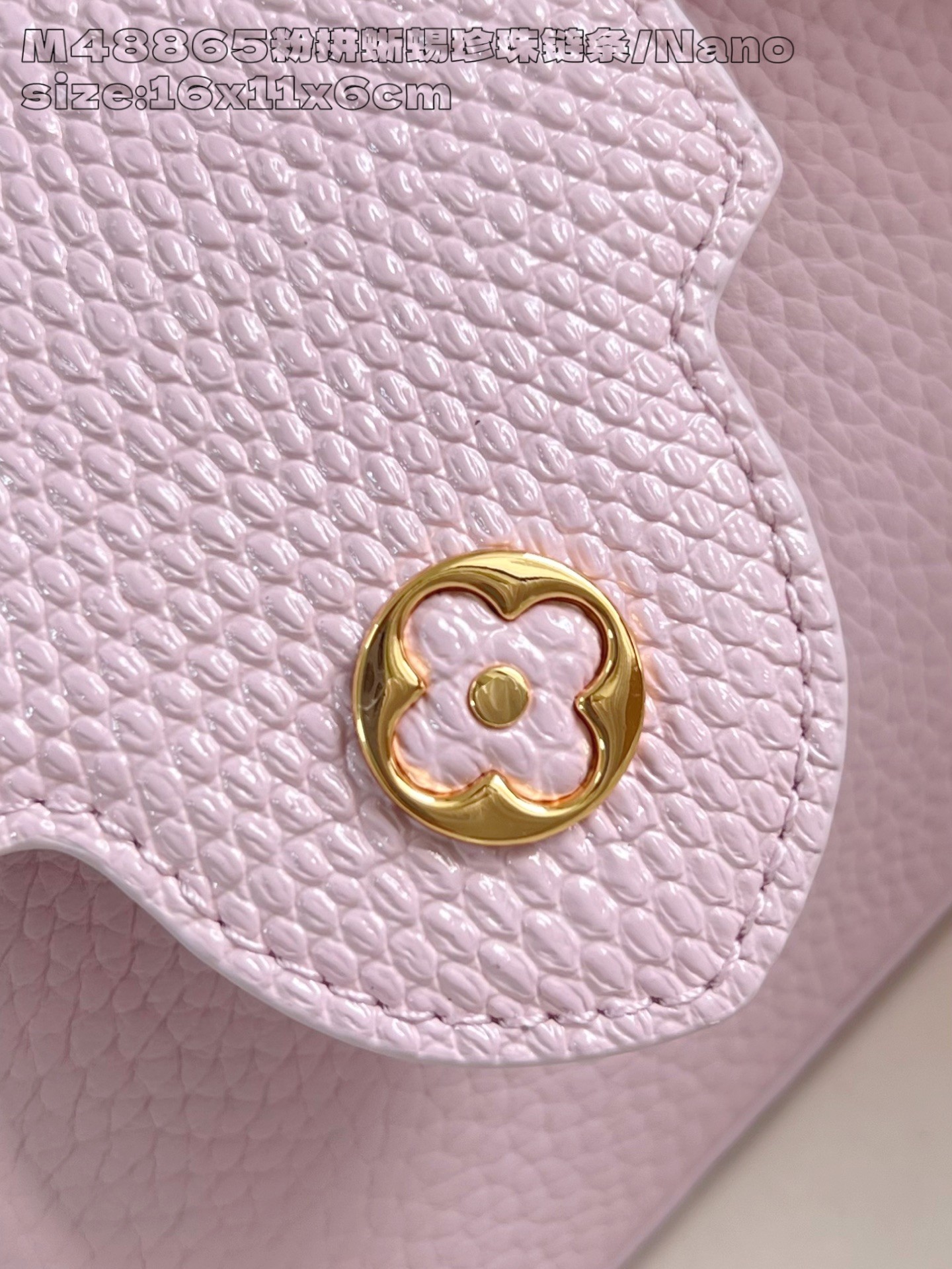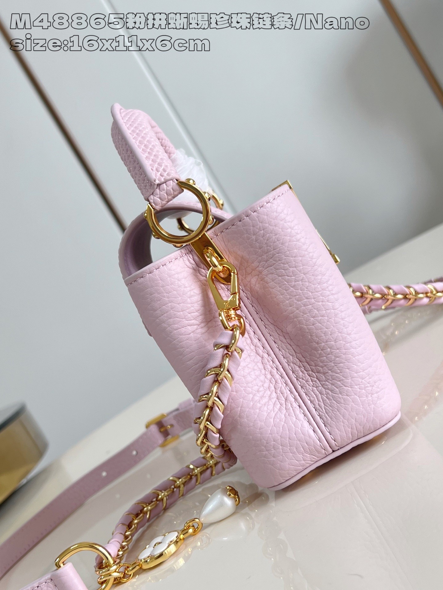 I am absolutely in love with my new Capucines Nano! The pink color is so delicate and pretty, and the lizard leather detailing adds a unique touch. It's the perfect size for carrying my essentials, and the chain strap is so chic.