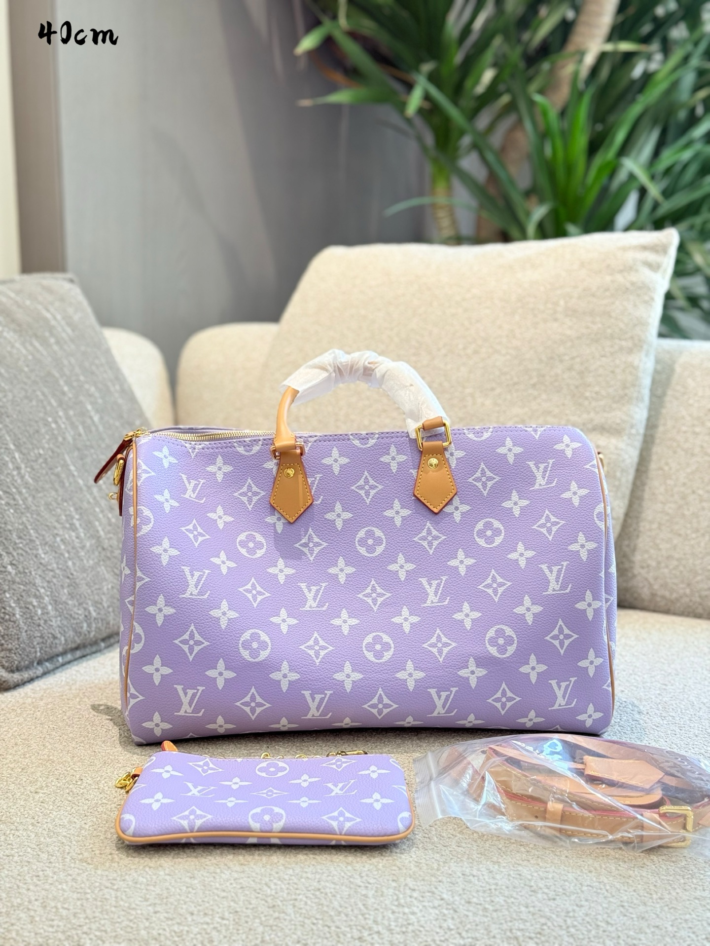 The Louis Vuitton Speedy Bandouliere 40 features a detachable strap, luggage tag, lock, keys, chain wallet, and bag support for shaping.