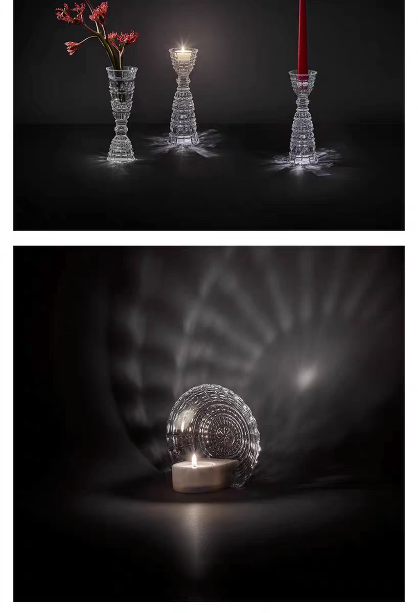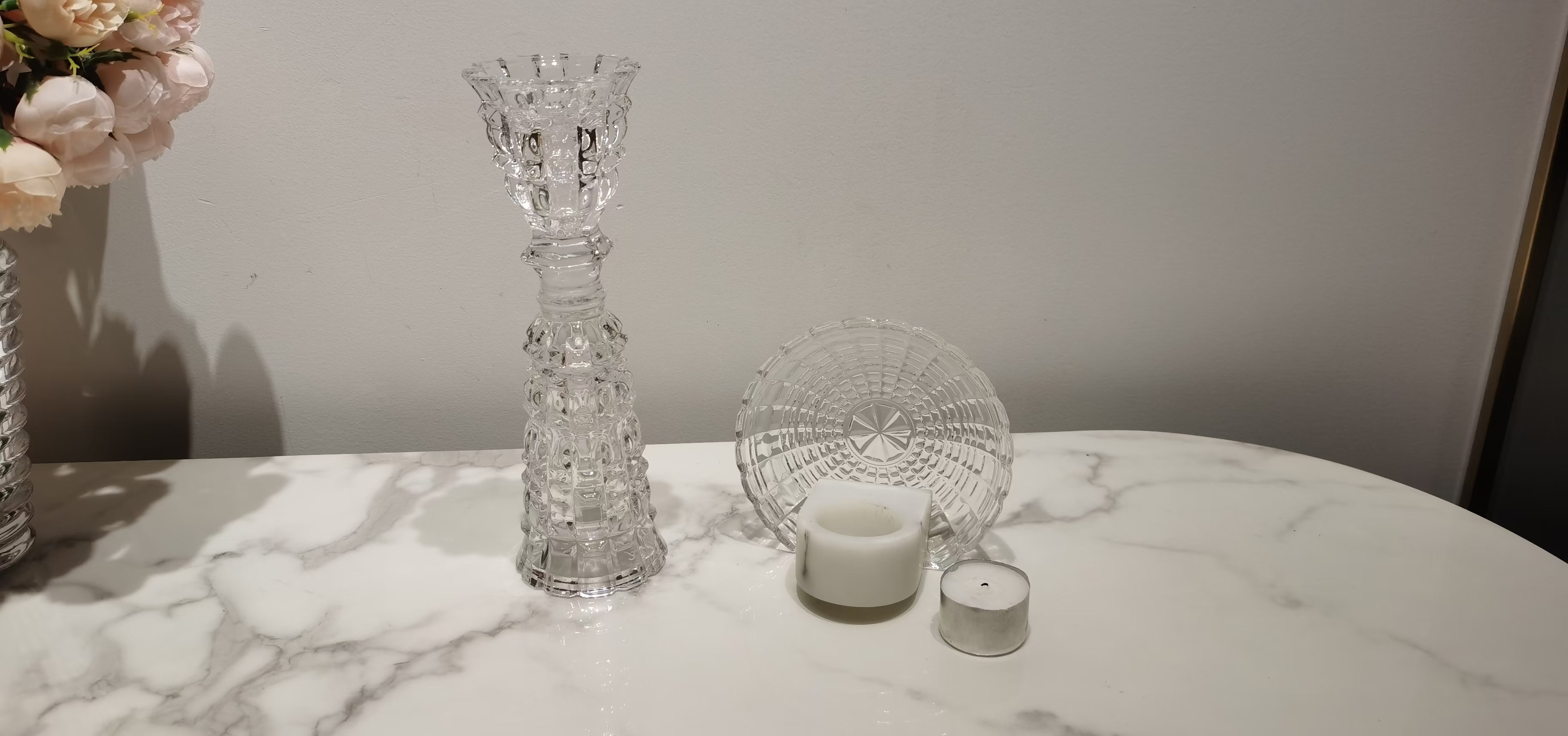 - Intricate Design: The candlestick features an elaborate pattern that beautifully refracts light, creating mesmerizing reflections.