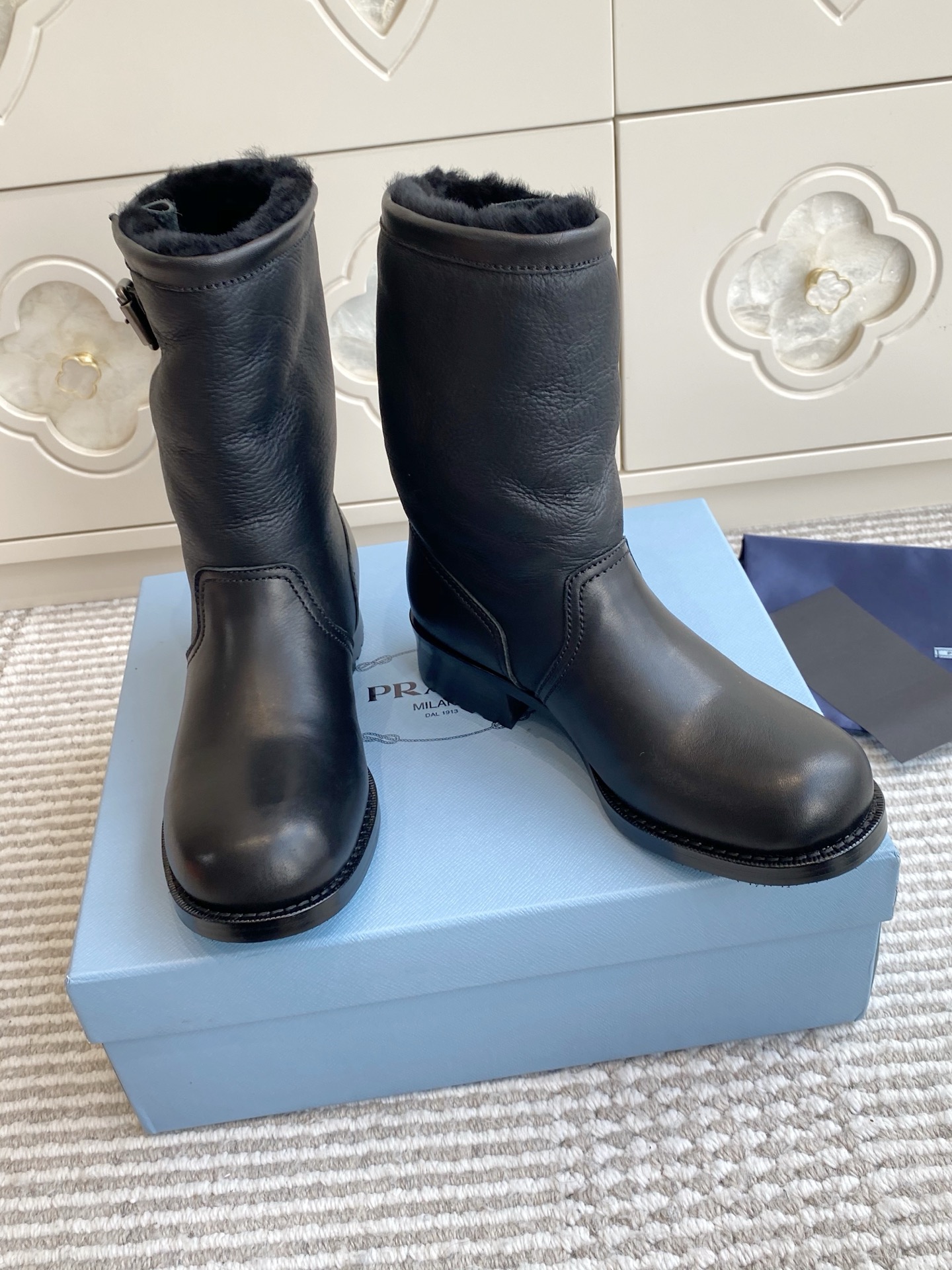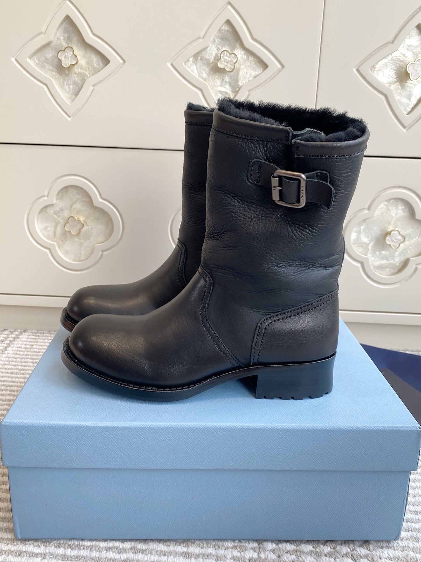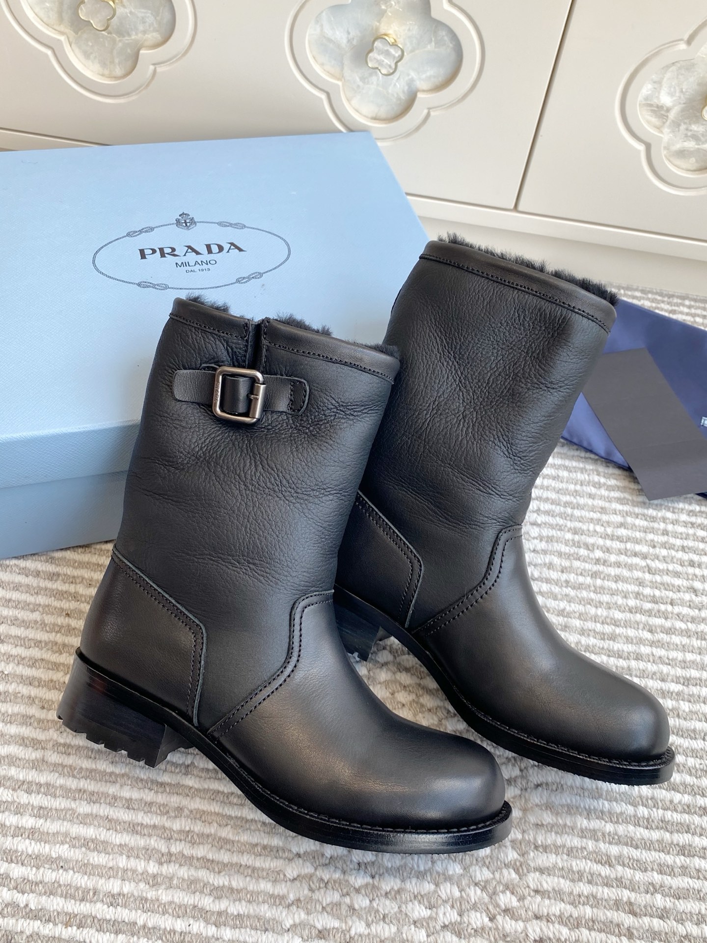 Tags: Fall Winter Boots, Leather Ankle Boots, Metal Buckle Boots, Prada Biker Boots, Short Motorcycle Boots, Wrinkled Leather Boots