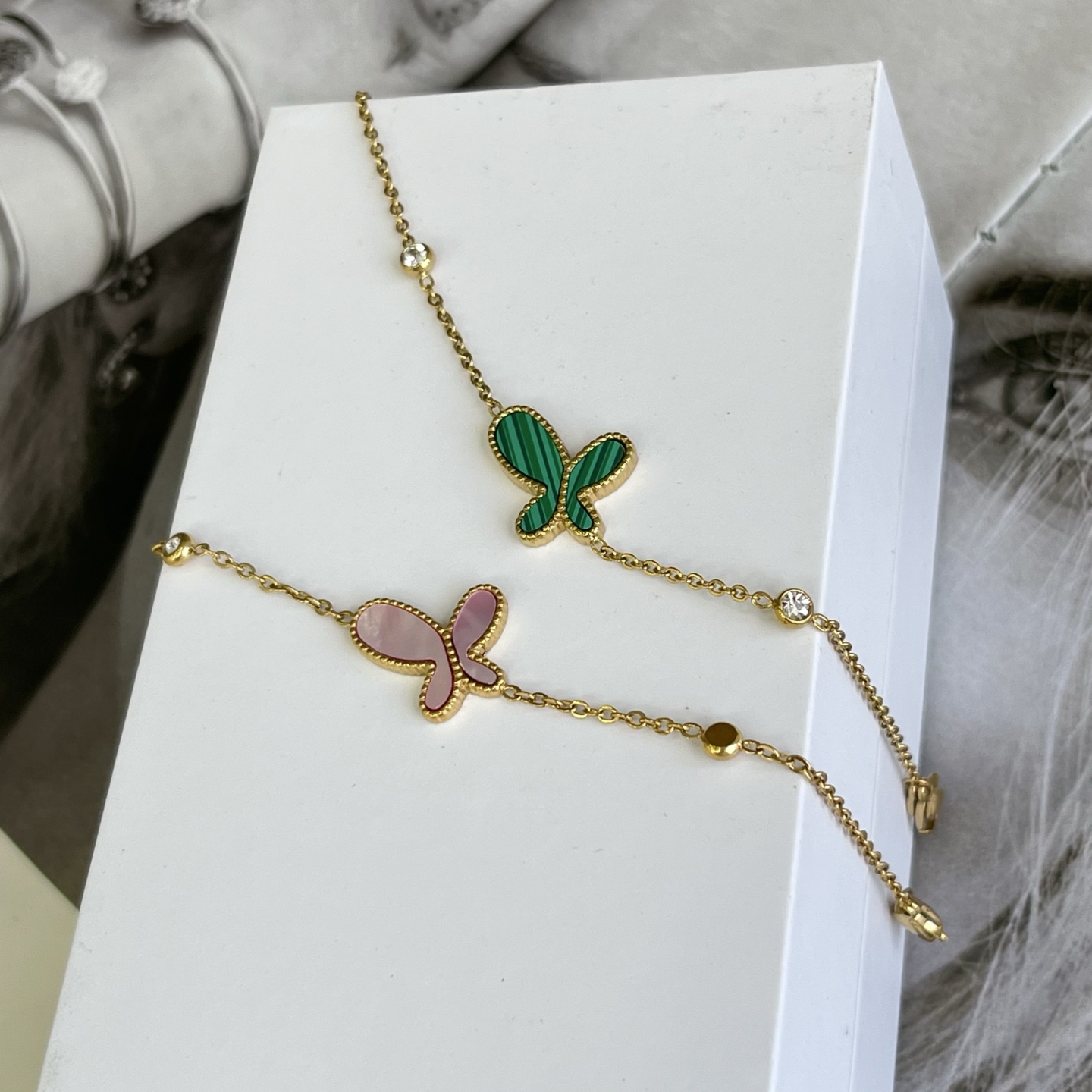 Tags: Butterfly Bracelet, Delicate Bracelet, Elegant Jewelry, Gold Chain Bracelet, Malachite Jewelry, Mother Of Pearl Bracelet