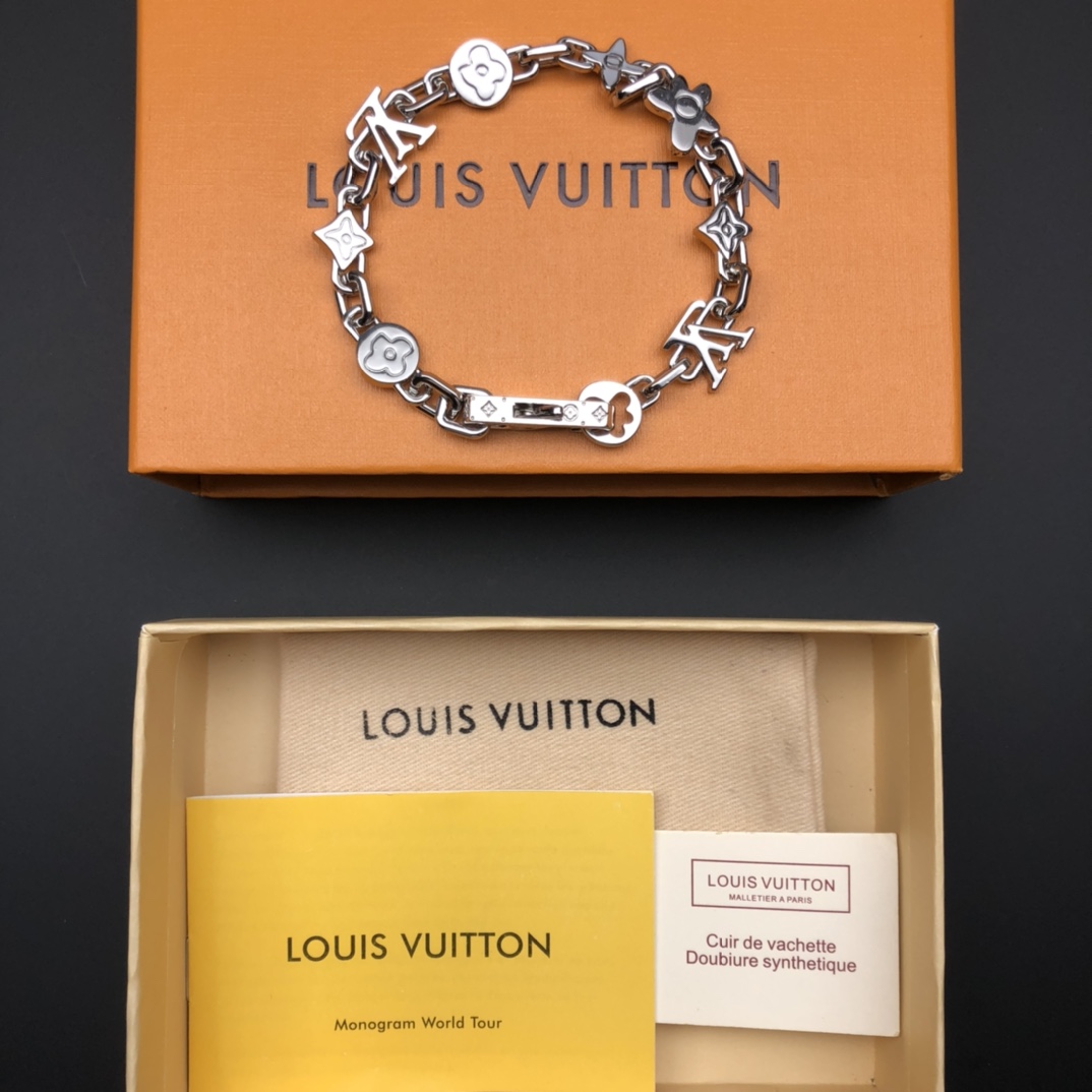 - Features iconic Louis Vuitton Monogram charms