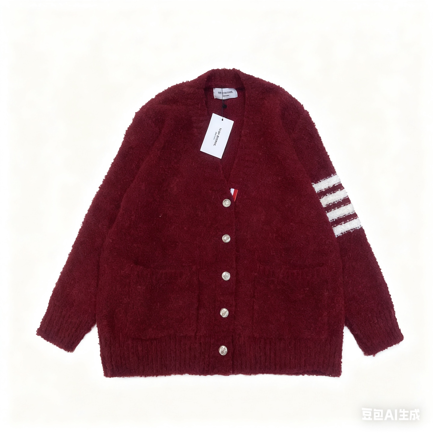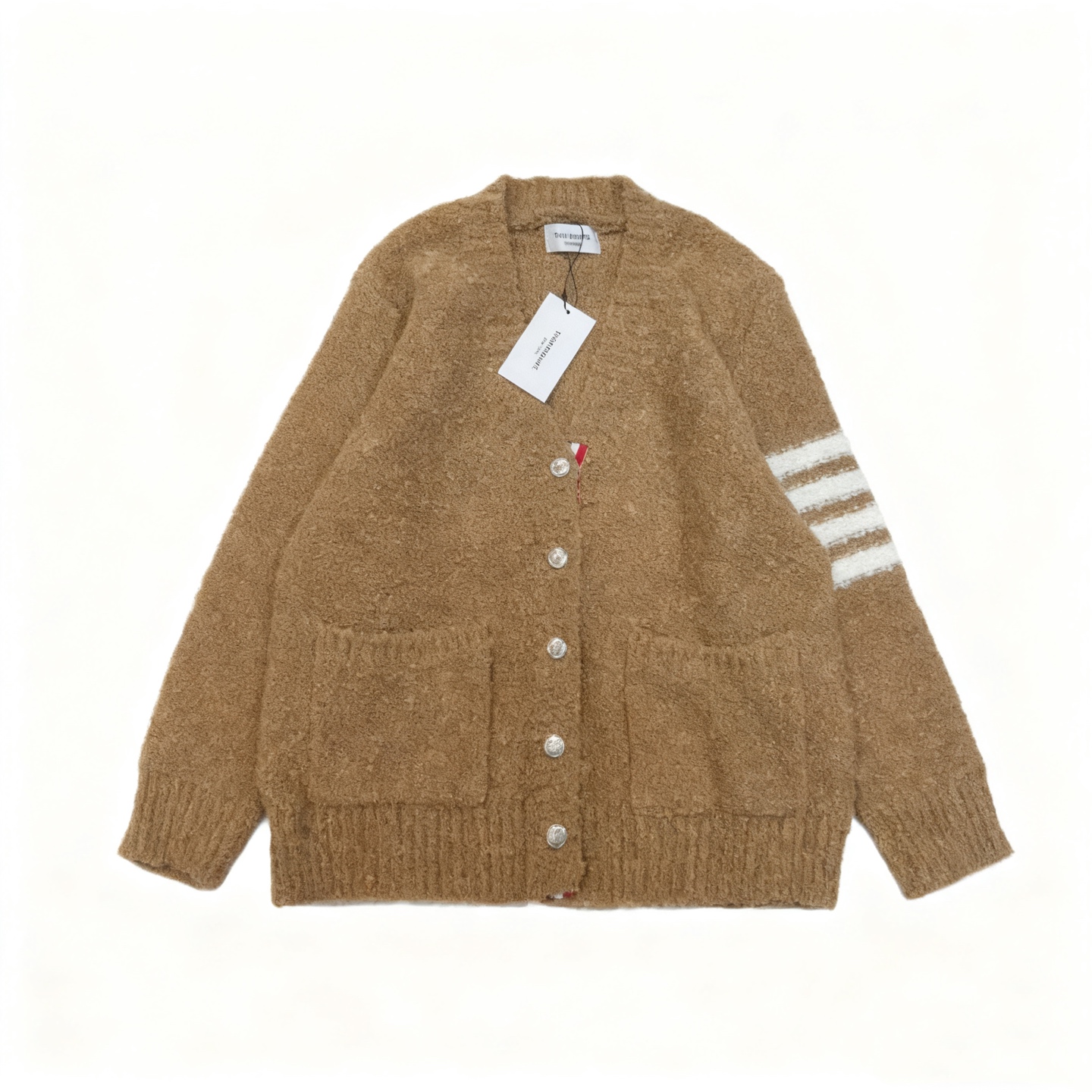 This Thom Browne cardigan is a blend of classic design and modern comfort, perfect for couples seeking a stylish and cozy outerwear option.