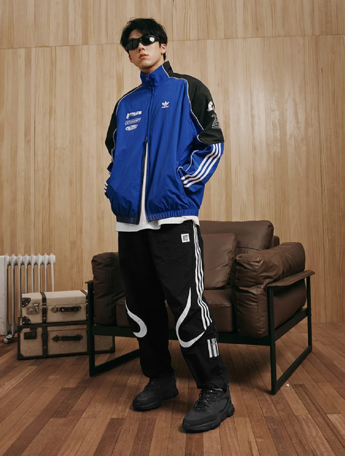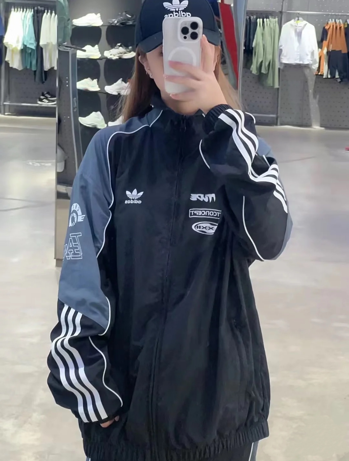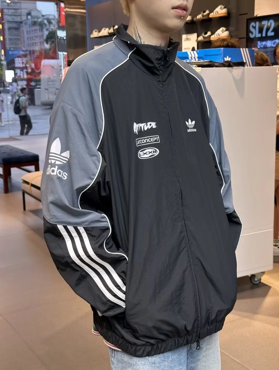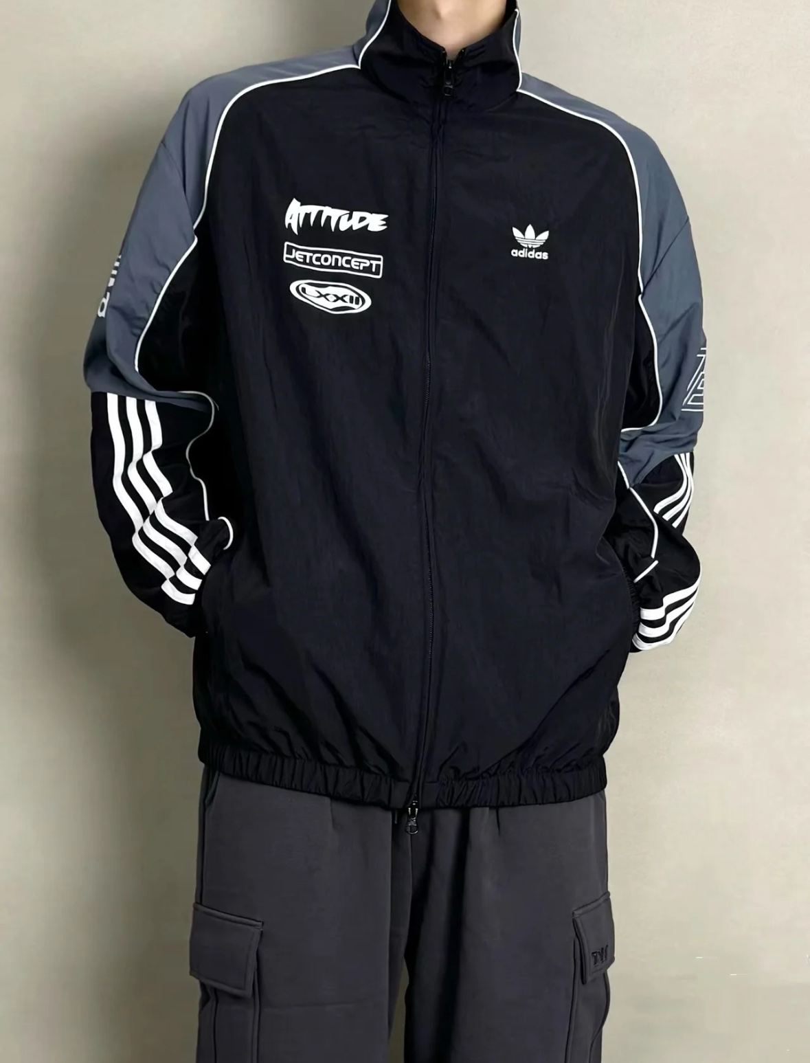 This Adidas windbreaker jacket is designed for those who appreciate motorsport aesthetics and comfortable everyday wear.