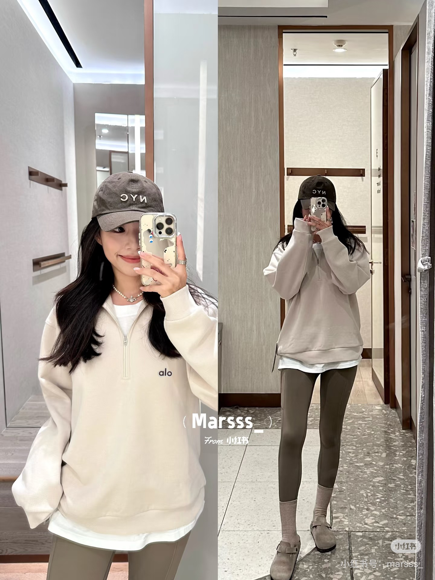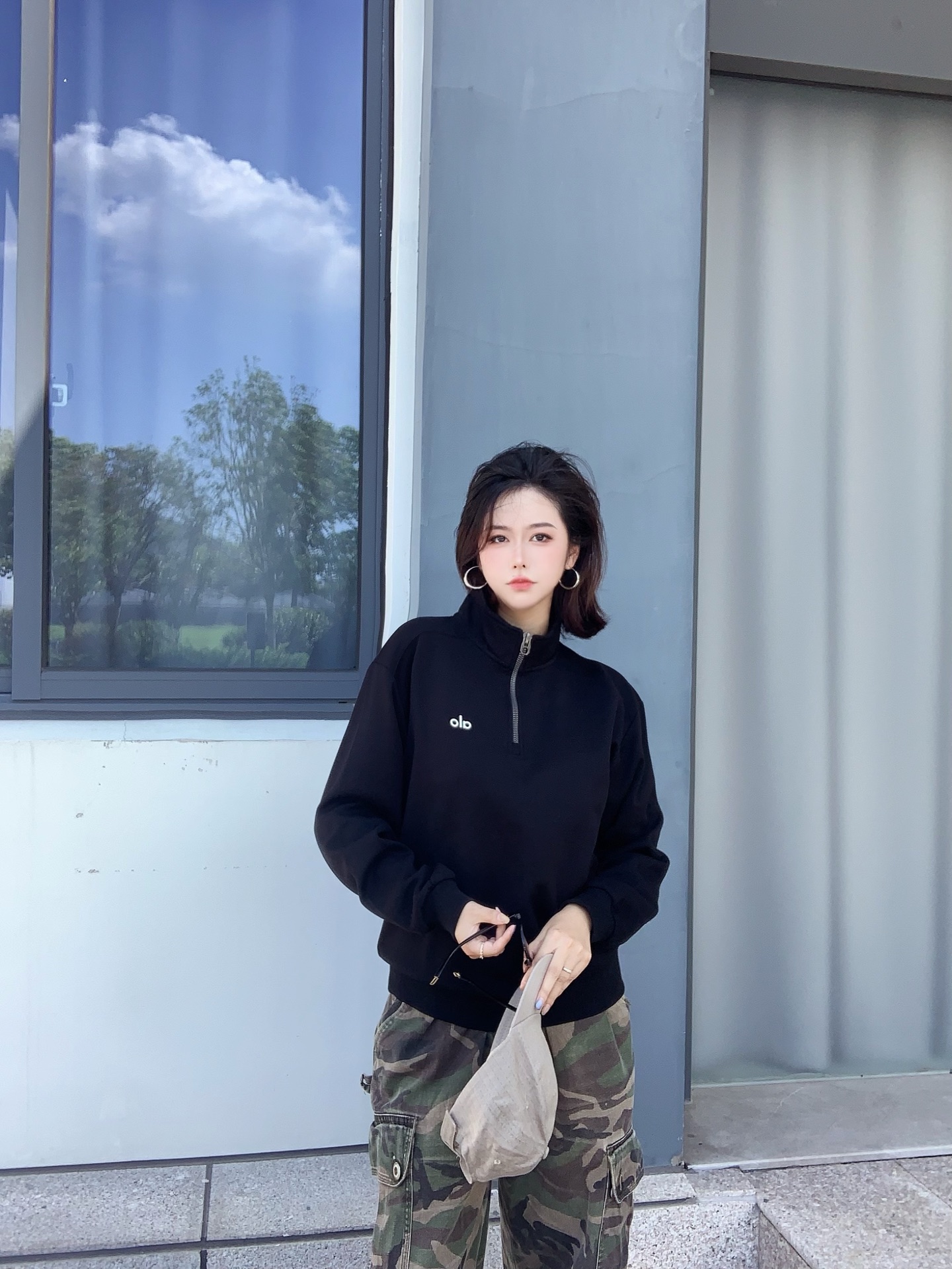 Unique Design: Features a retro half-zip style, Alo logo print, and metal detailing.