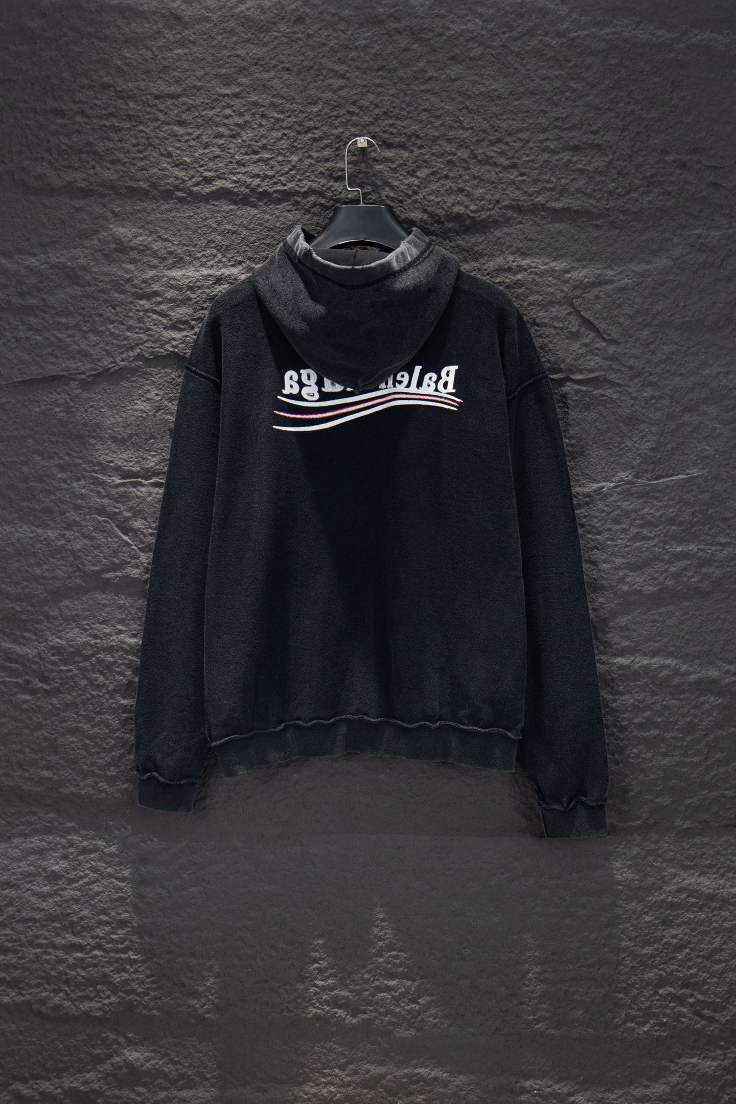 I'm obsessed with this Balenciaga hoodie! The washed black color is so cool and the distressed details give it a unique look. It's also very comfortable to wear.