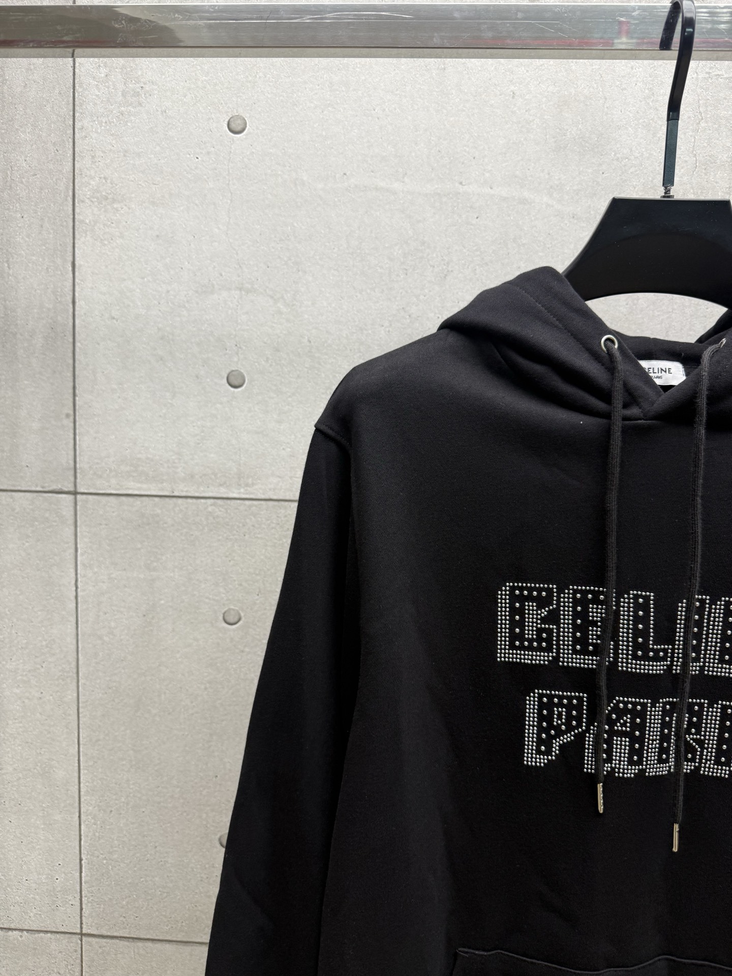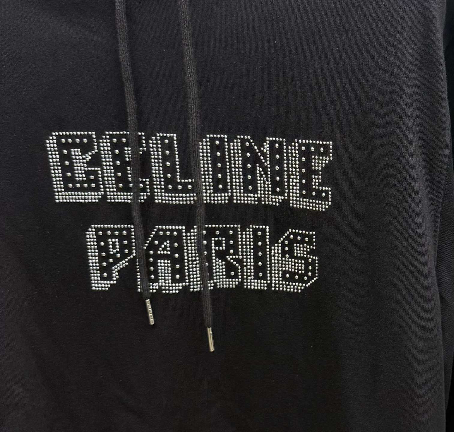 Elevate your casual style with this Celine hoodie featuring rhinestone embellishments. Crafted from premium materials for ultimate comfort and a chic look.