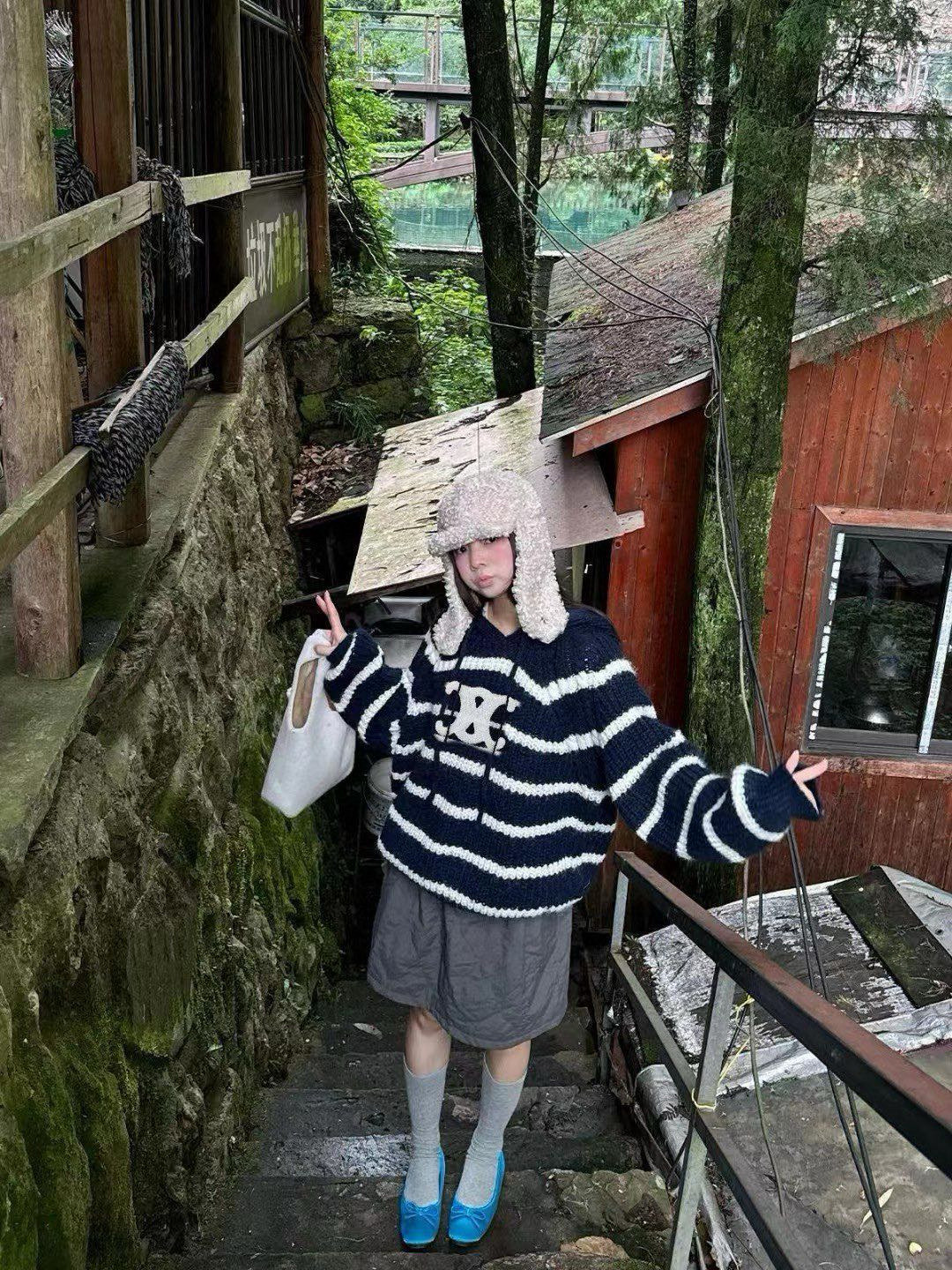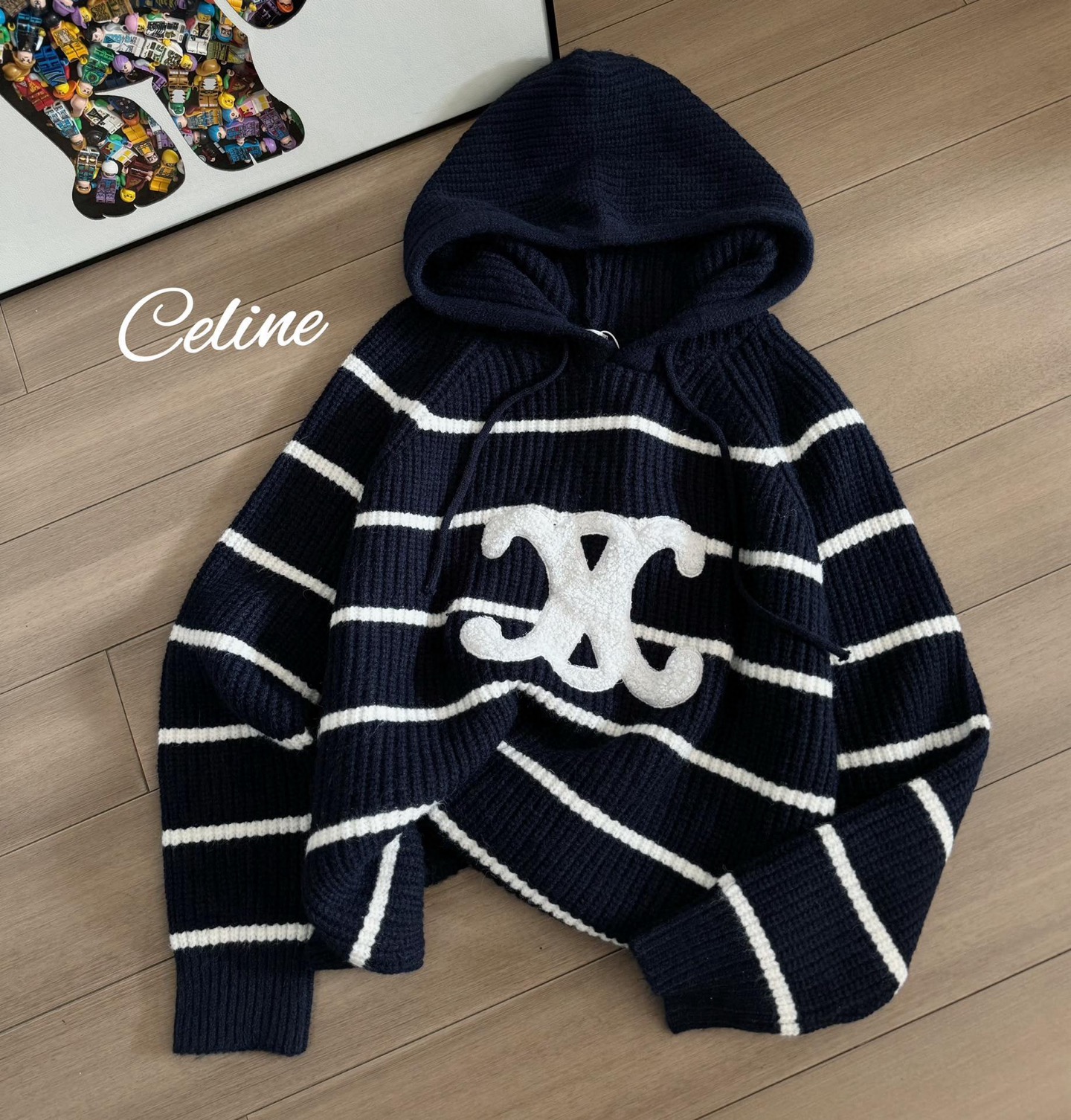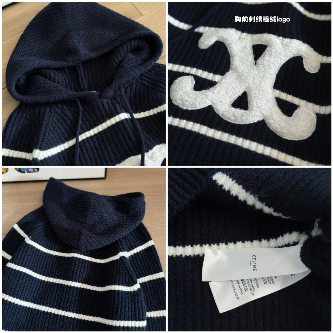 This Celine-inspired striped knit hoodie offers a blend of comfort and style, perfect for the transitional seasons. Its unique design and cozy feel make it a standout piece in any wardrobe.