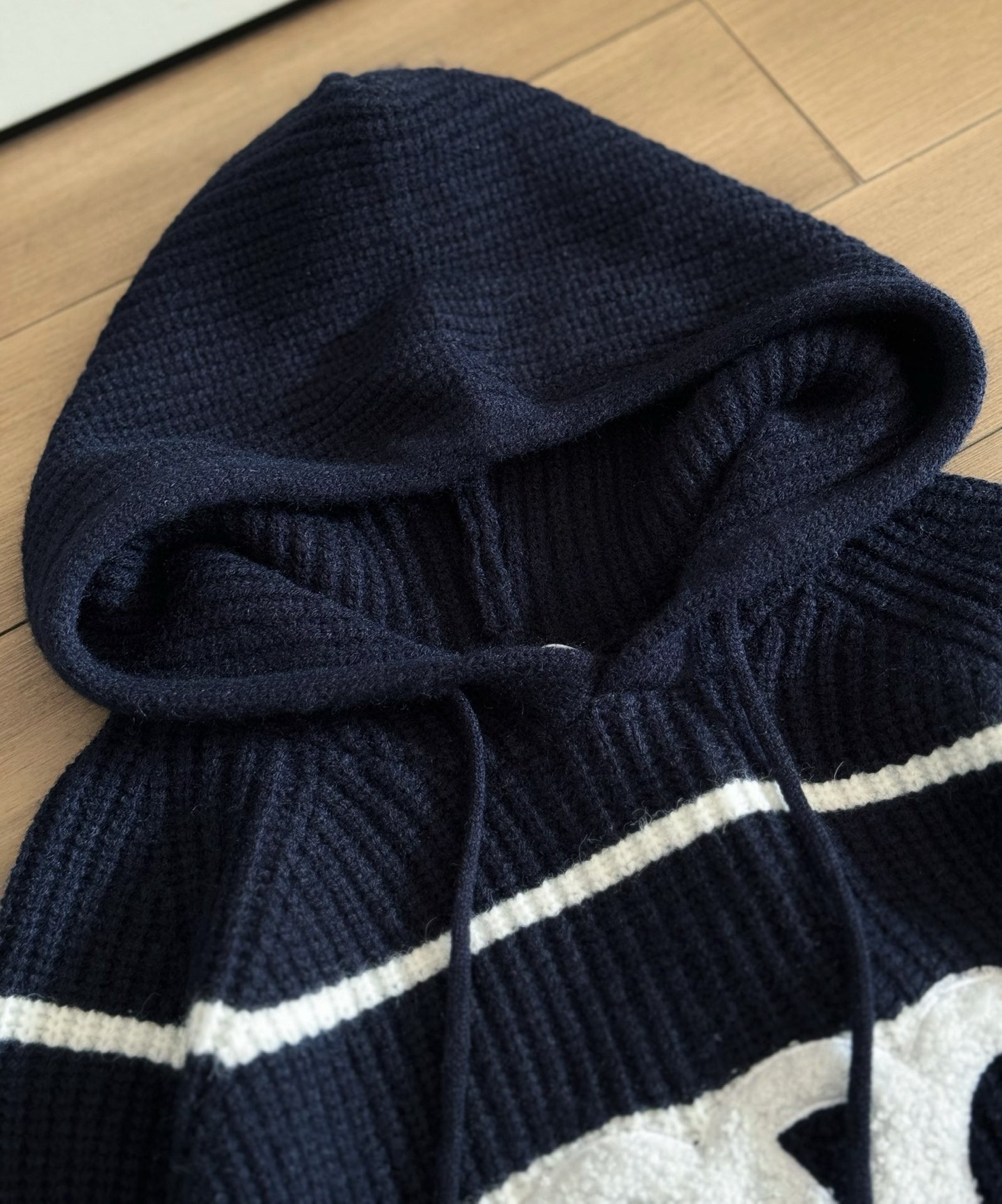 Celine Striped Wool Blend Knit Hoodie, Navy and White, Oversized Fit