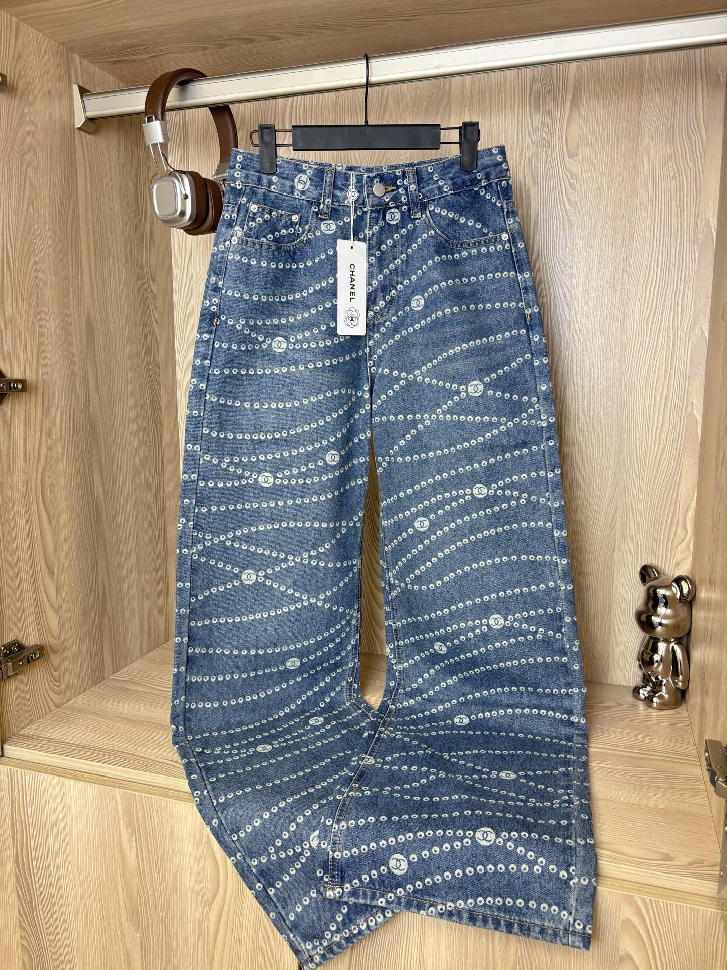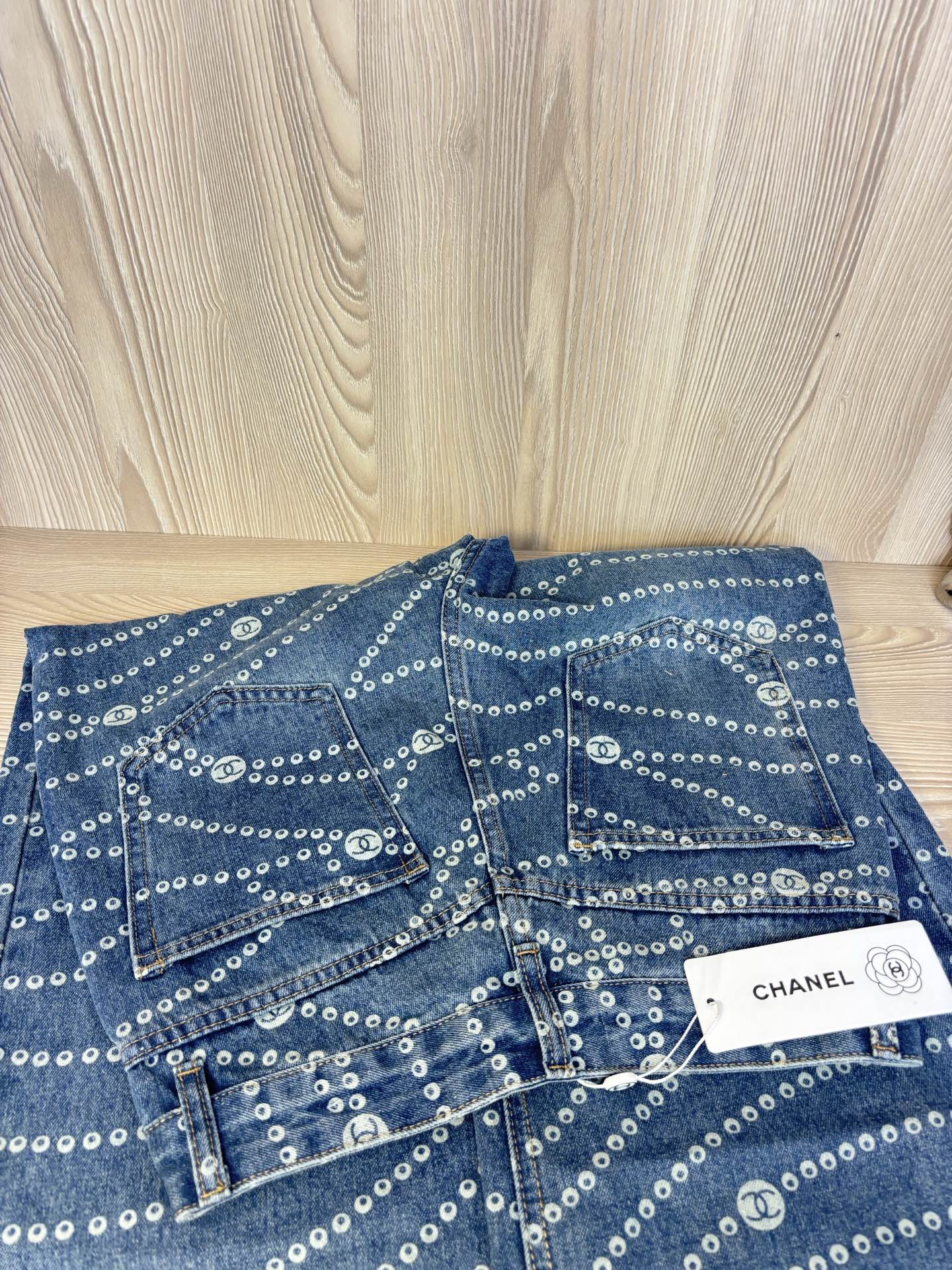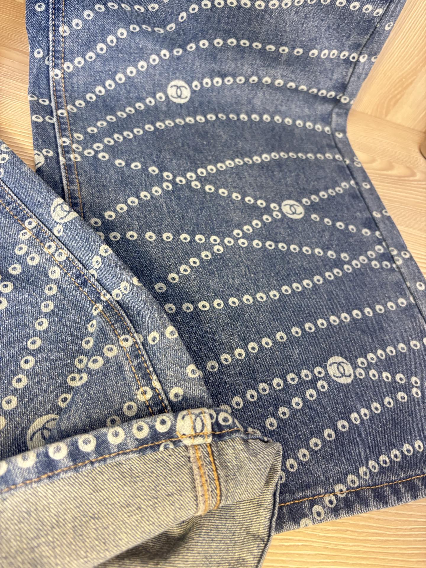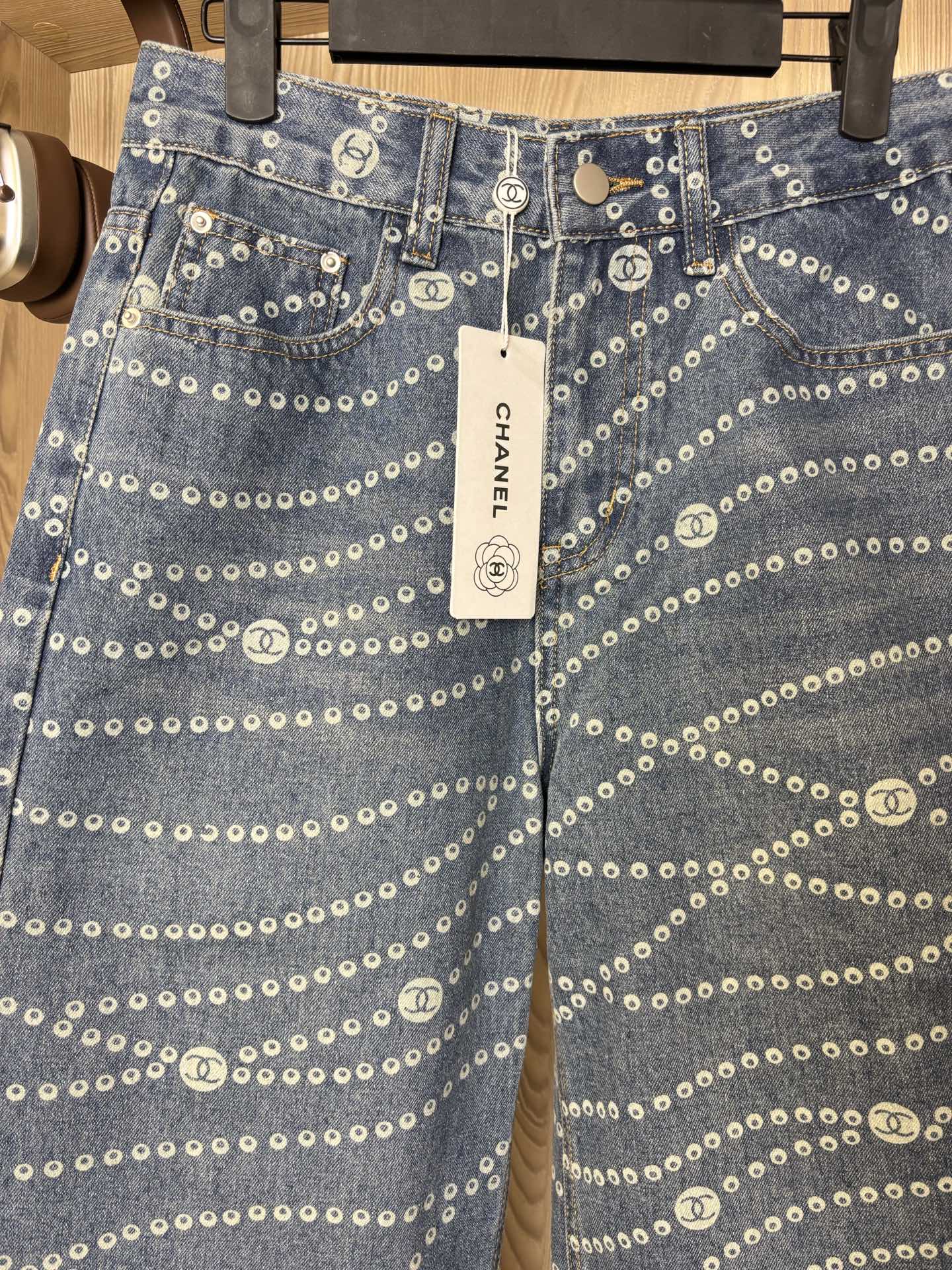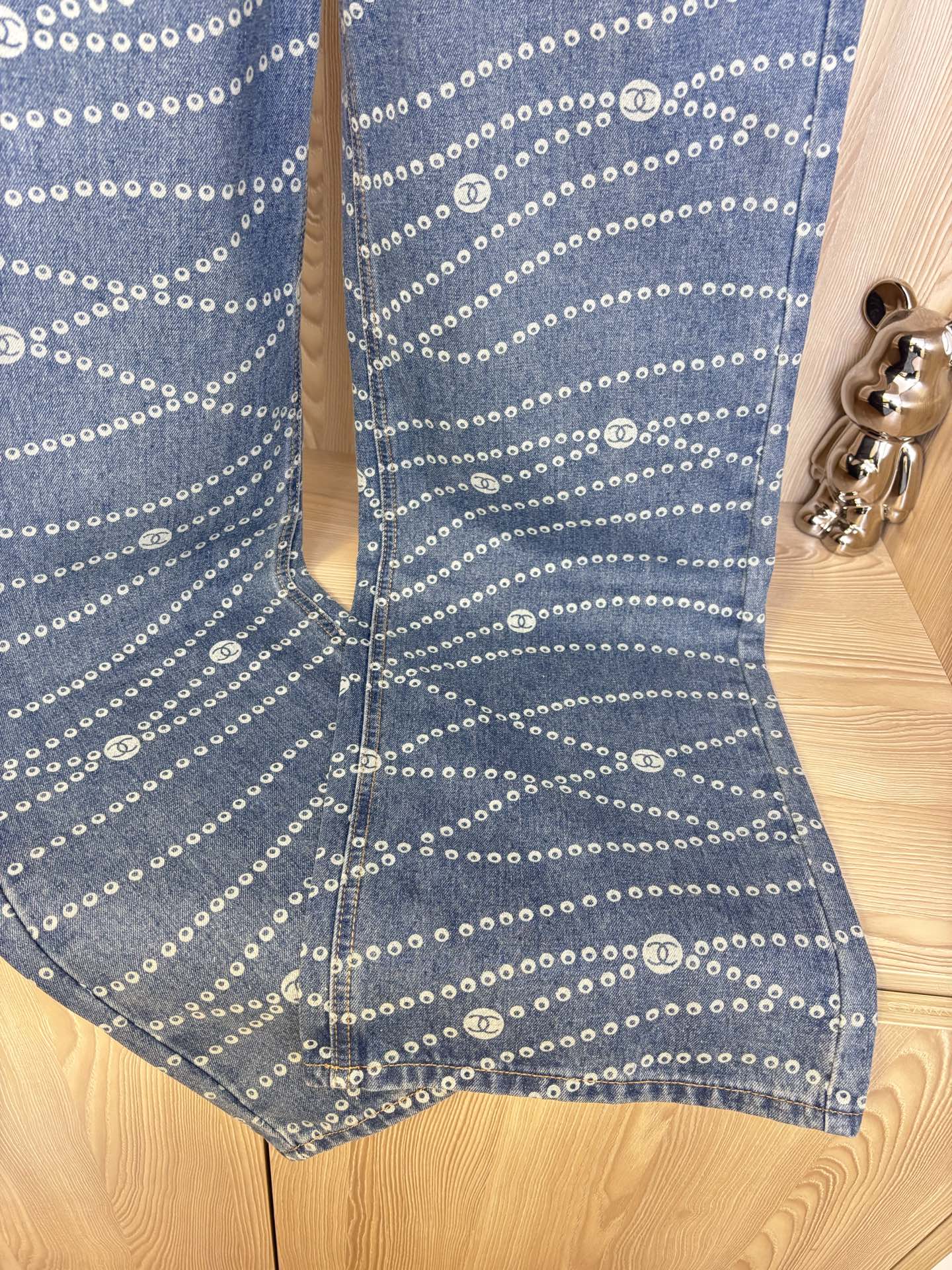 Elevate your style with these Chanel wide-leg jeans featuring a laser pearl chain print. Comfortable, stylish, and perfect for any season. Shop now!
