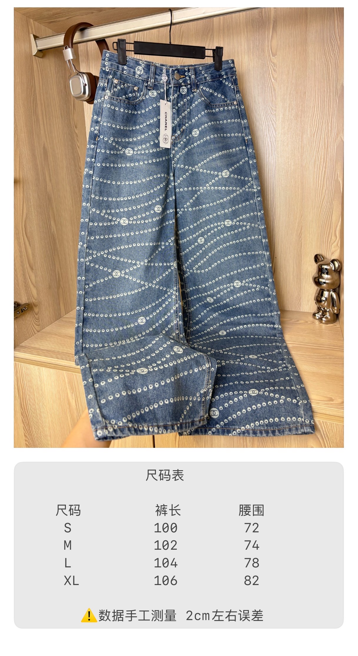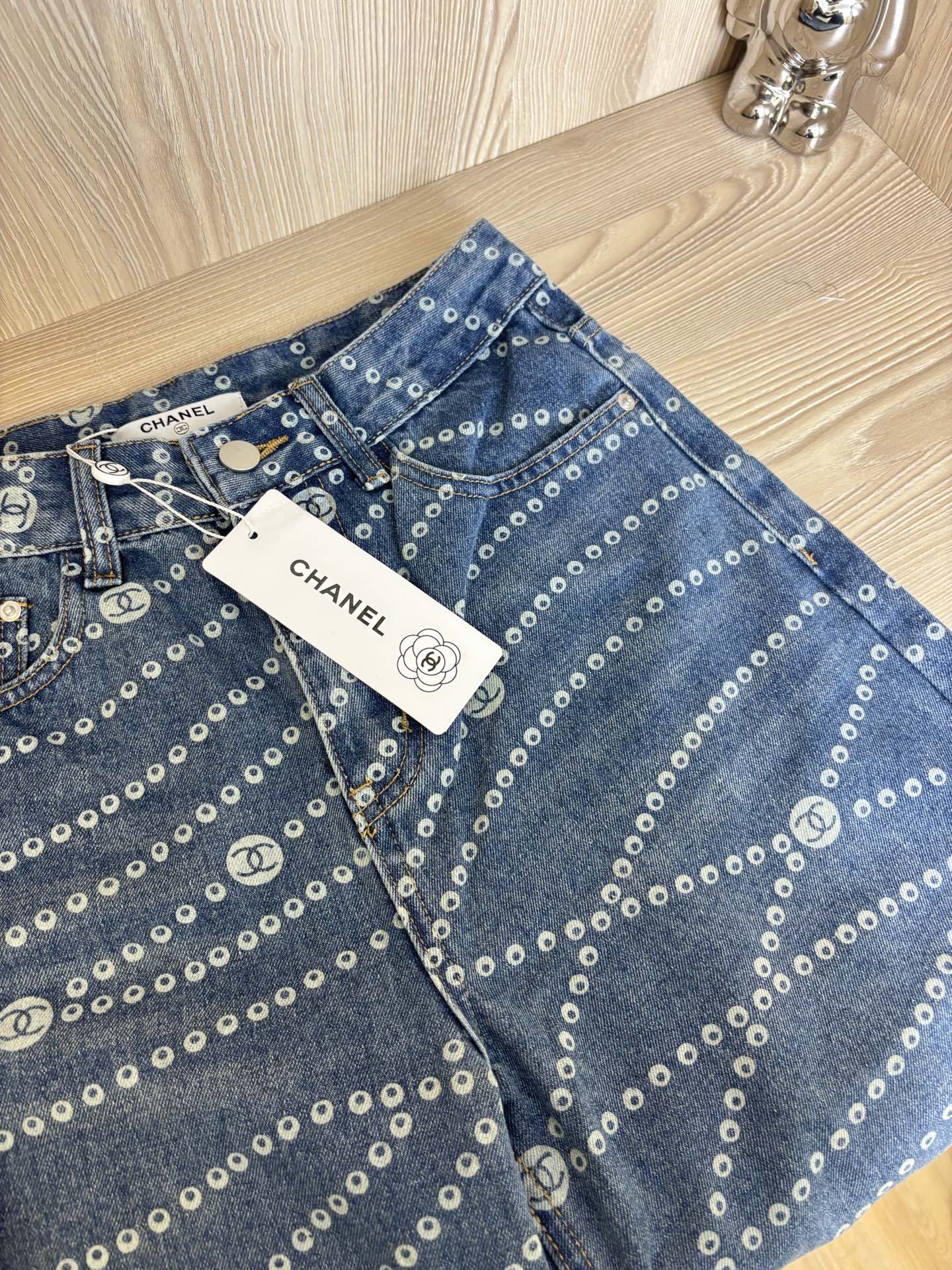 These Chanel wide-leg jeans are a must-have for fashion enthusiasts. Inspired by celebrity styles, these jeans feature a unique laser pearl chain print that adds a touch of luxury to your wardrobe.