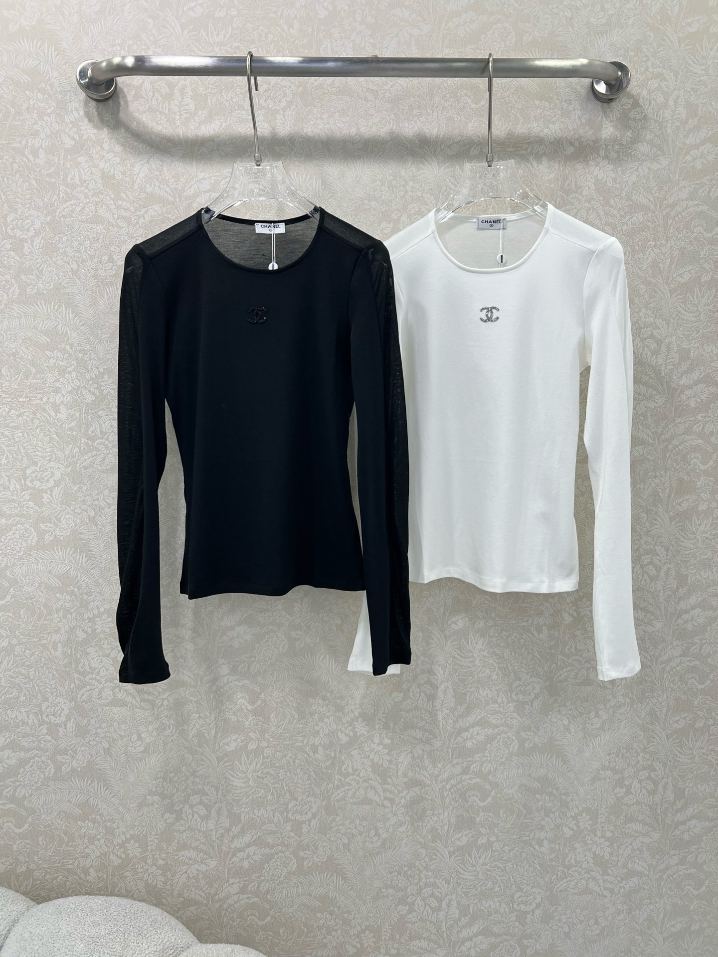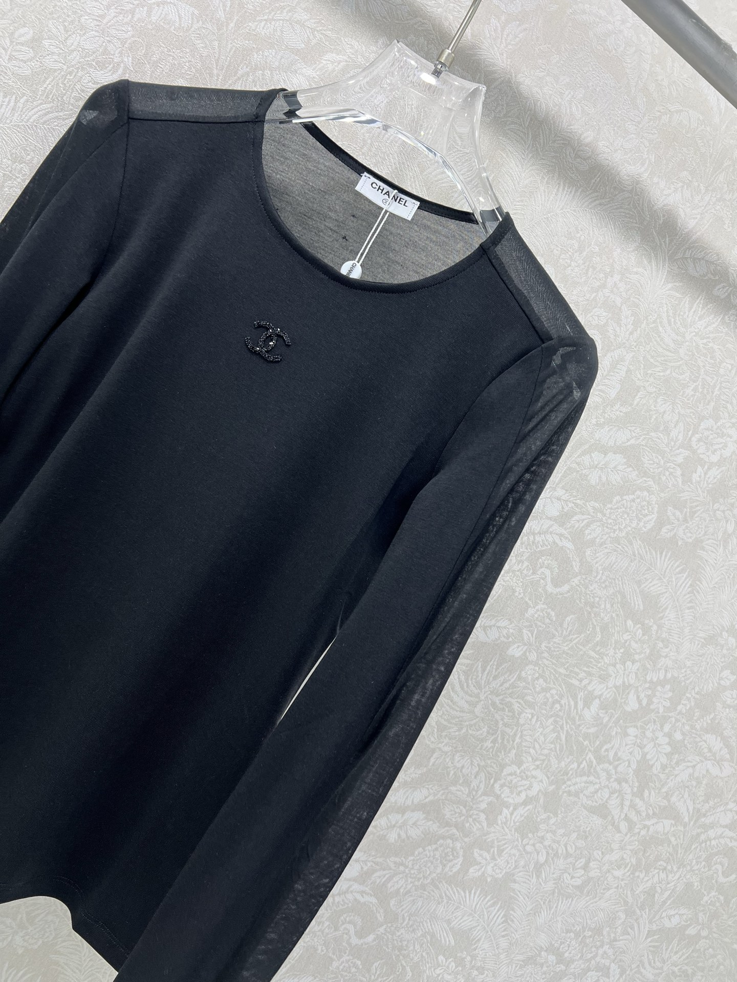 Elevate your style with this chic Chanel long sleeve tee. Features a slim fit, lightweight fabric, and iconic logo detail. Perfect for layering!