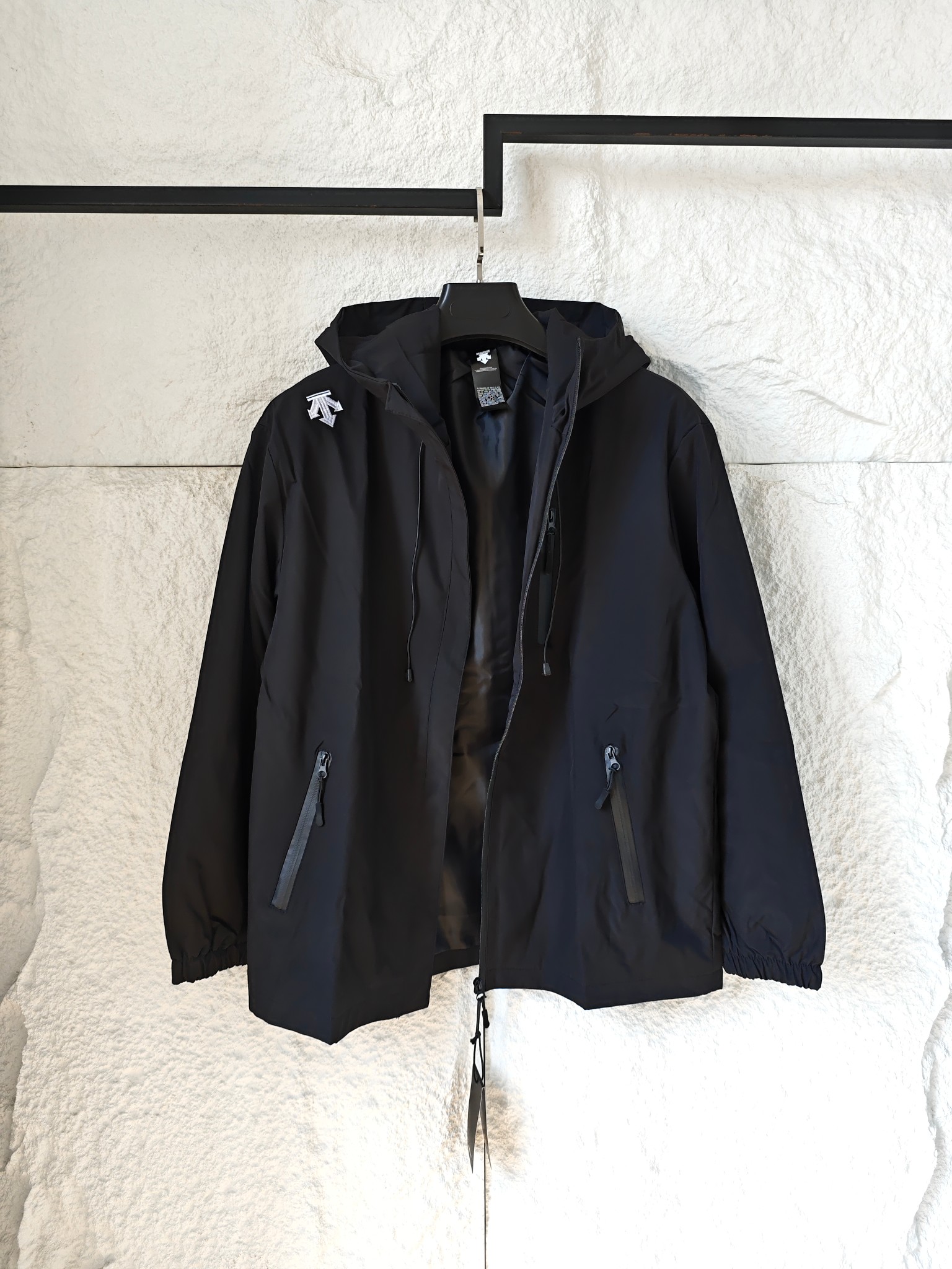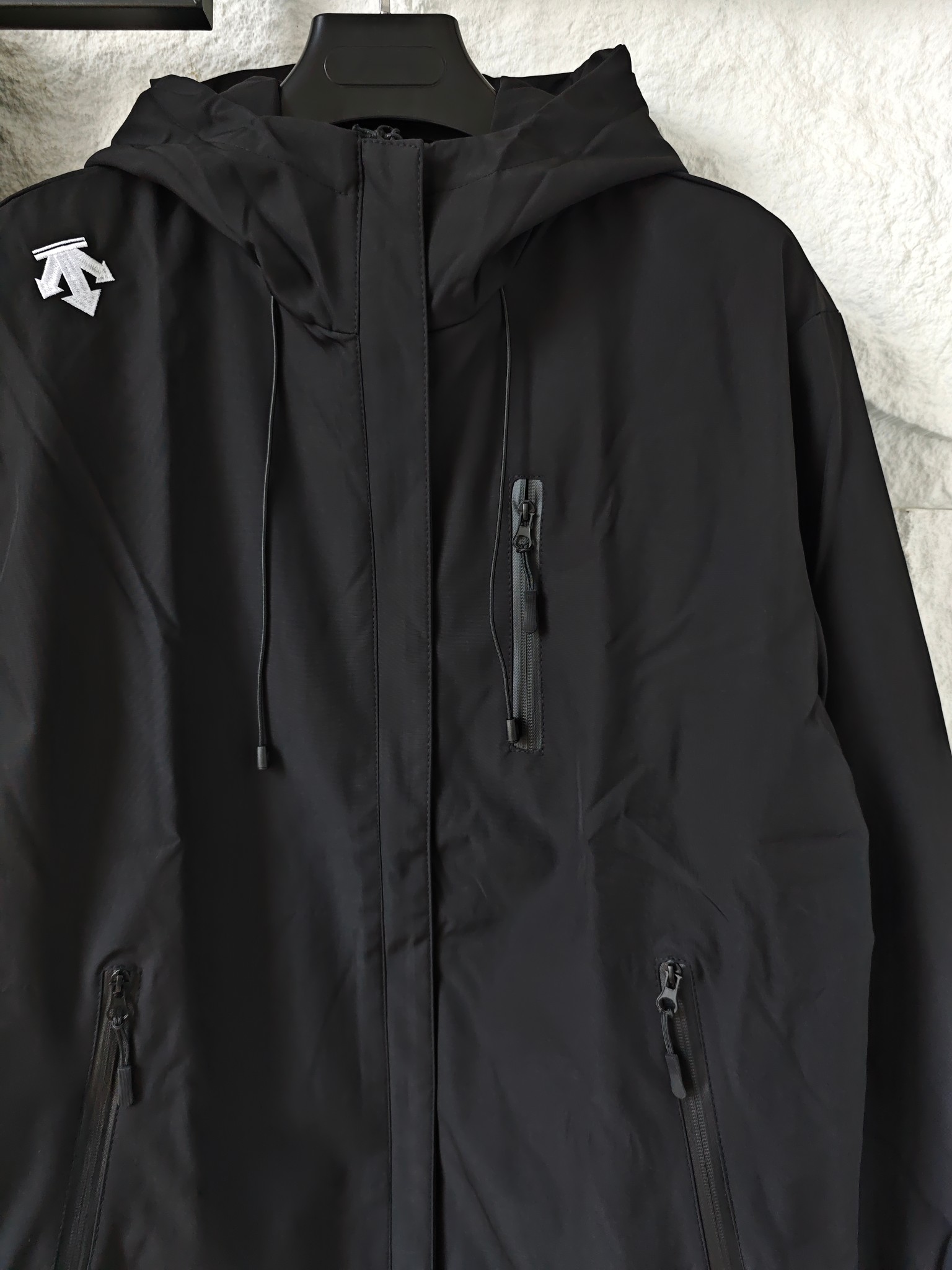 Stay stylish and protected with this Descente hooded jacket. Featuring multiple zipper pockets, comfortable fabric, and a versatile black color.