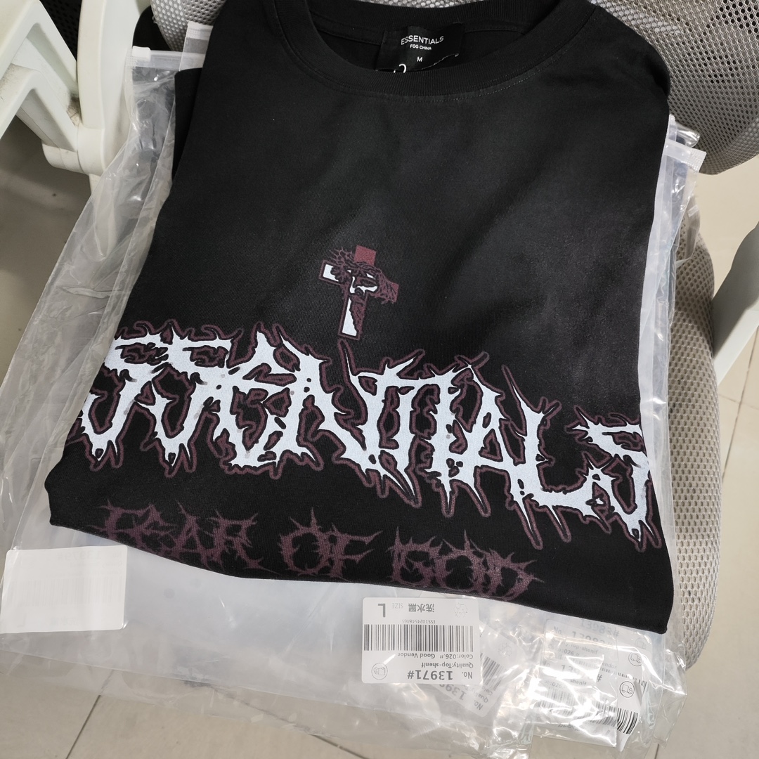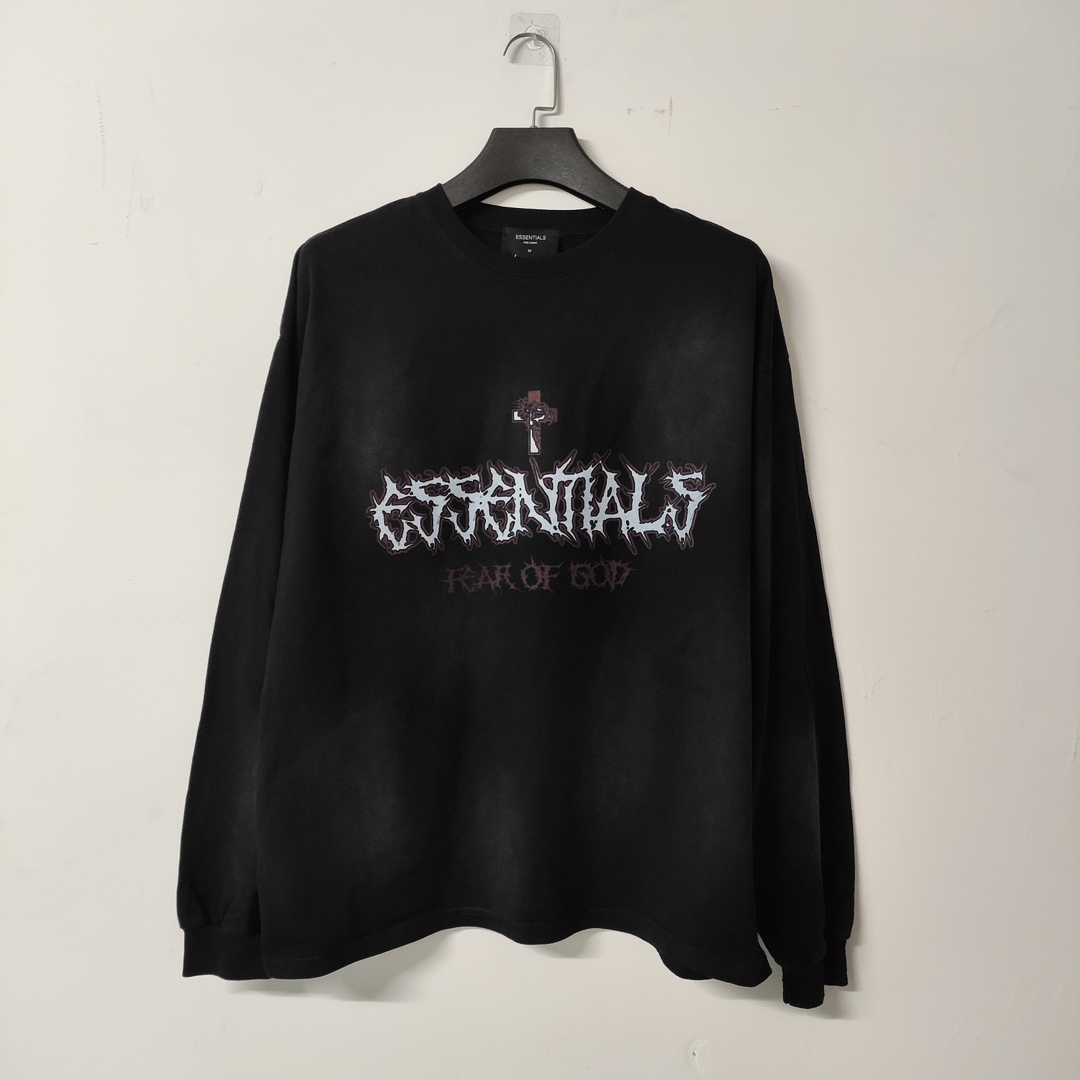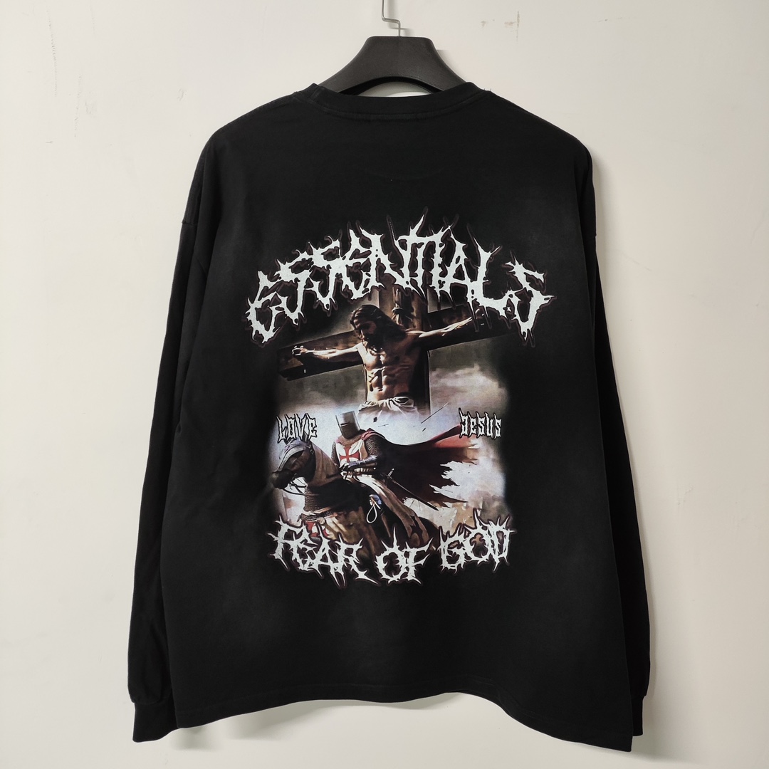 This Essentials Fear Of God long sleeve T-shirt combines high-street fashion with a vintage aesthetic. The washed black color and unique Jesus graphic make it a standout piece.