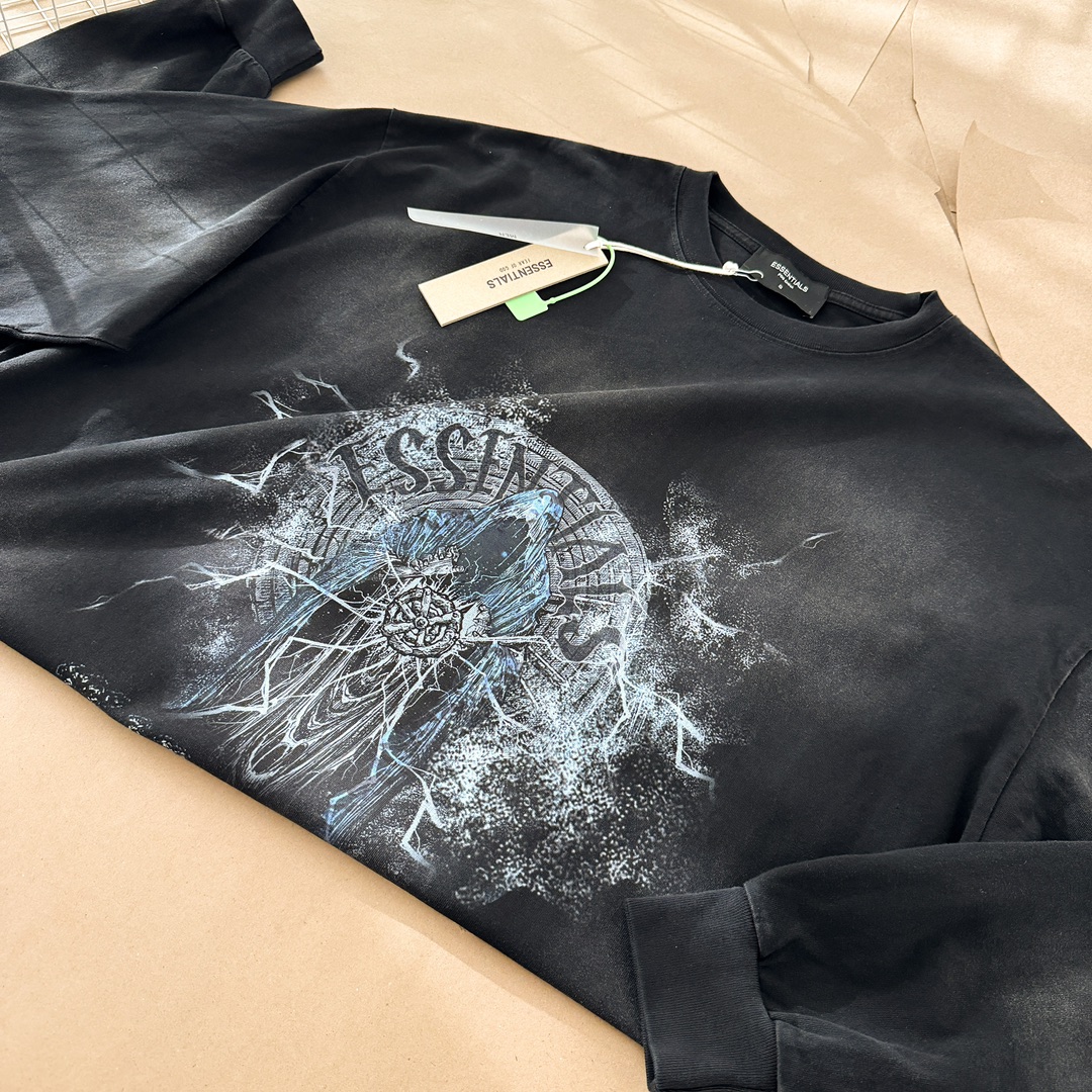 This Fear of God Essentials long sleeve T-shirt is designed for both style and comfort. With its vintage wash and unique graphic, it's a standout piece for any wardrobe.