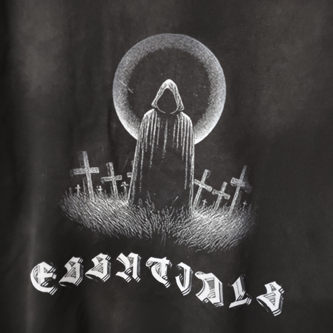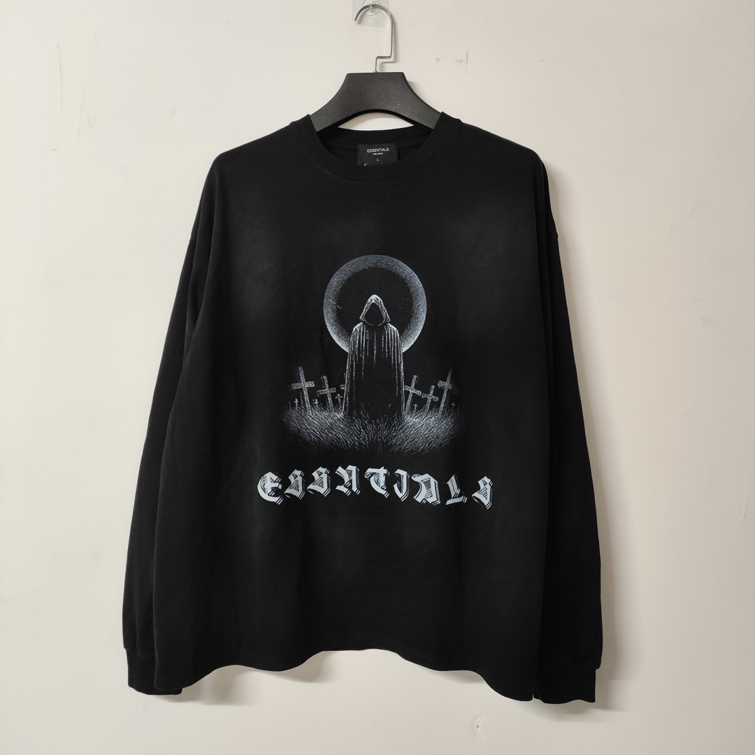 Elevate your streetwear with this FEAR OF GOD ESSENTIALS long sleeve T-shirt. Features a dark series design with a cross tombstone graphic.