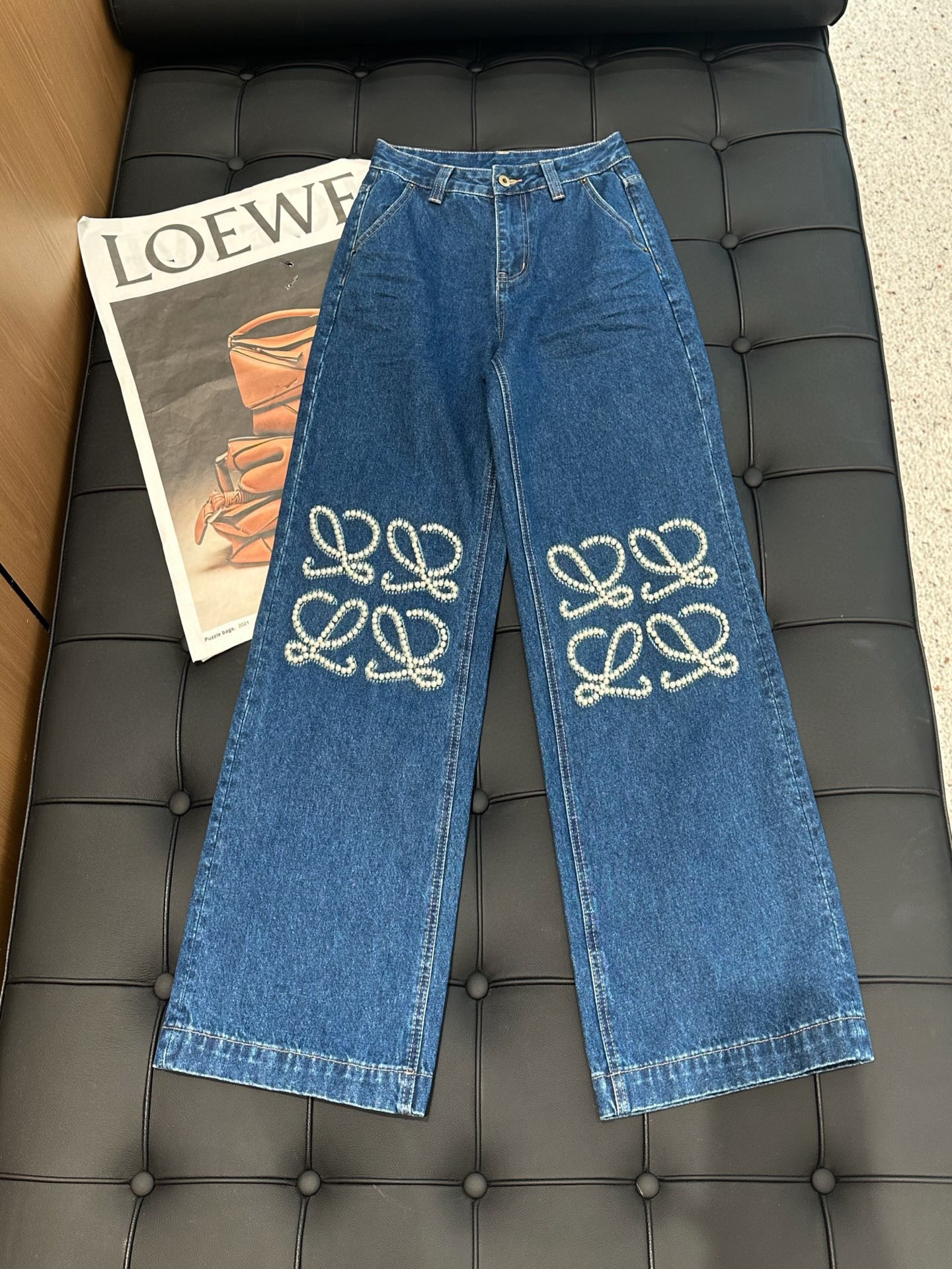 Elevate your style with these Loewe pearl-embellished wide-leg jeans. Crafted from premium cotton denim, featuring a flattering straight-leg cut that enhances the waistline.