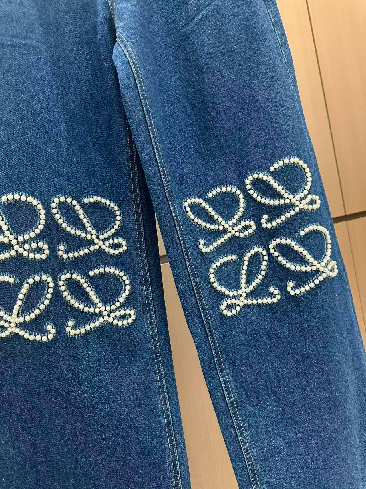 These pearl-adorned wide-leg jeans offer a blend of comfort and high-end style, perfect for those looking to make a statement.