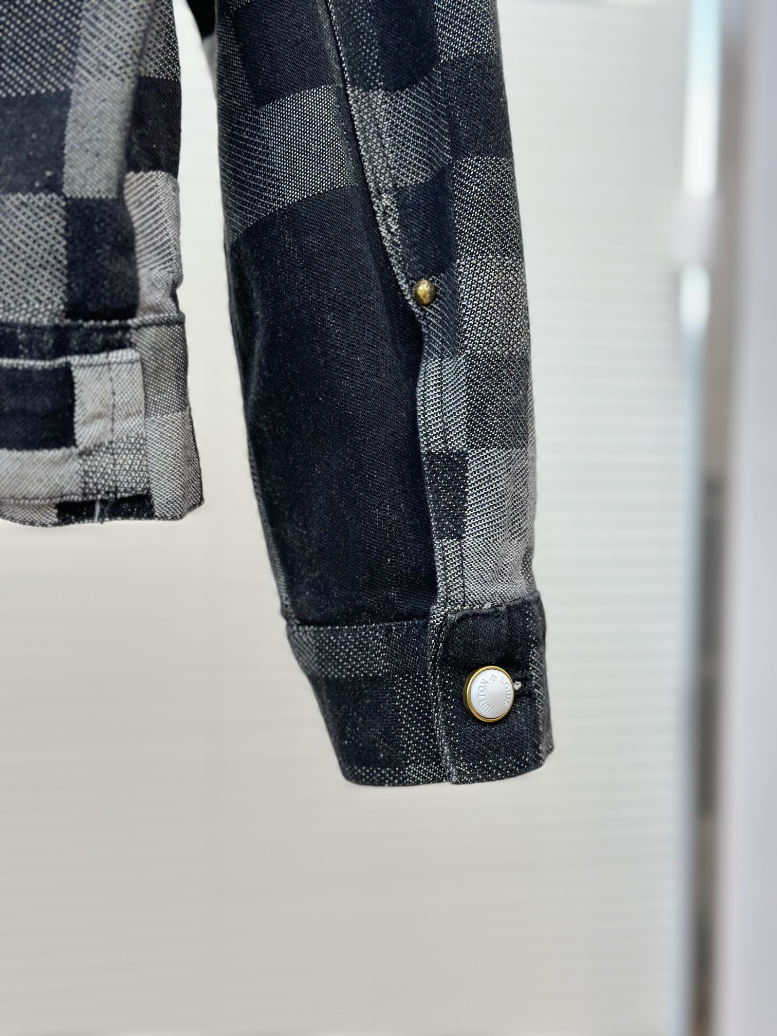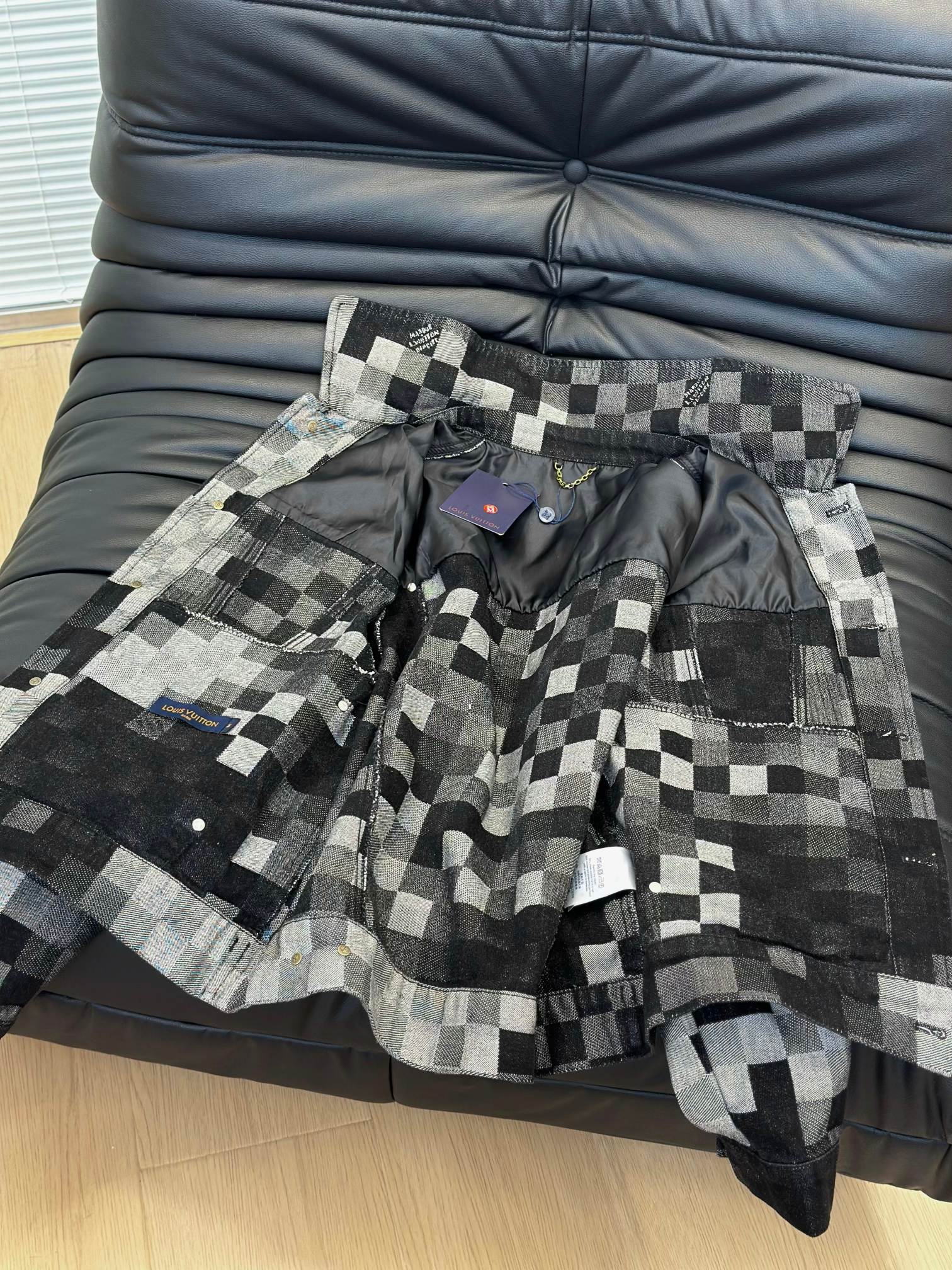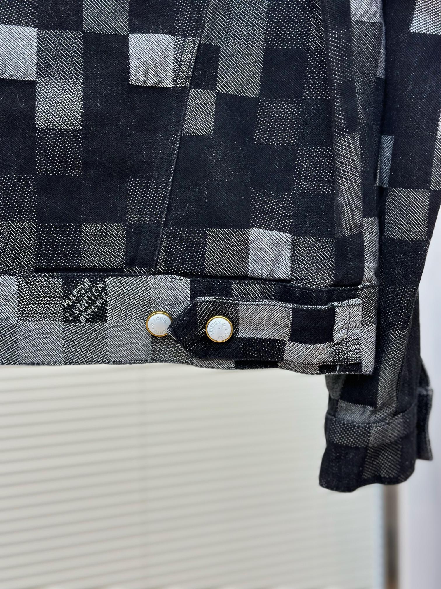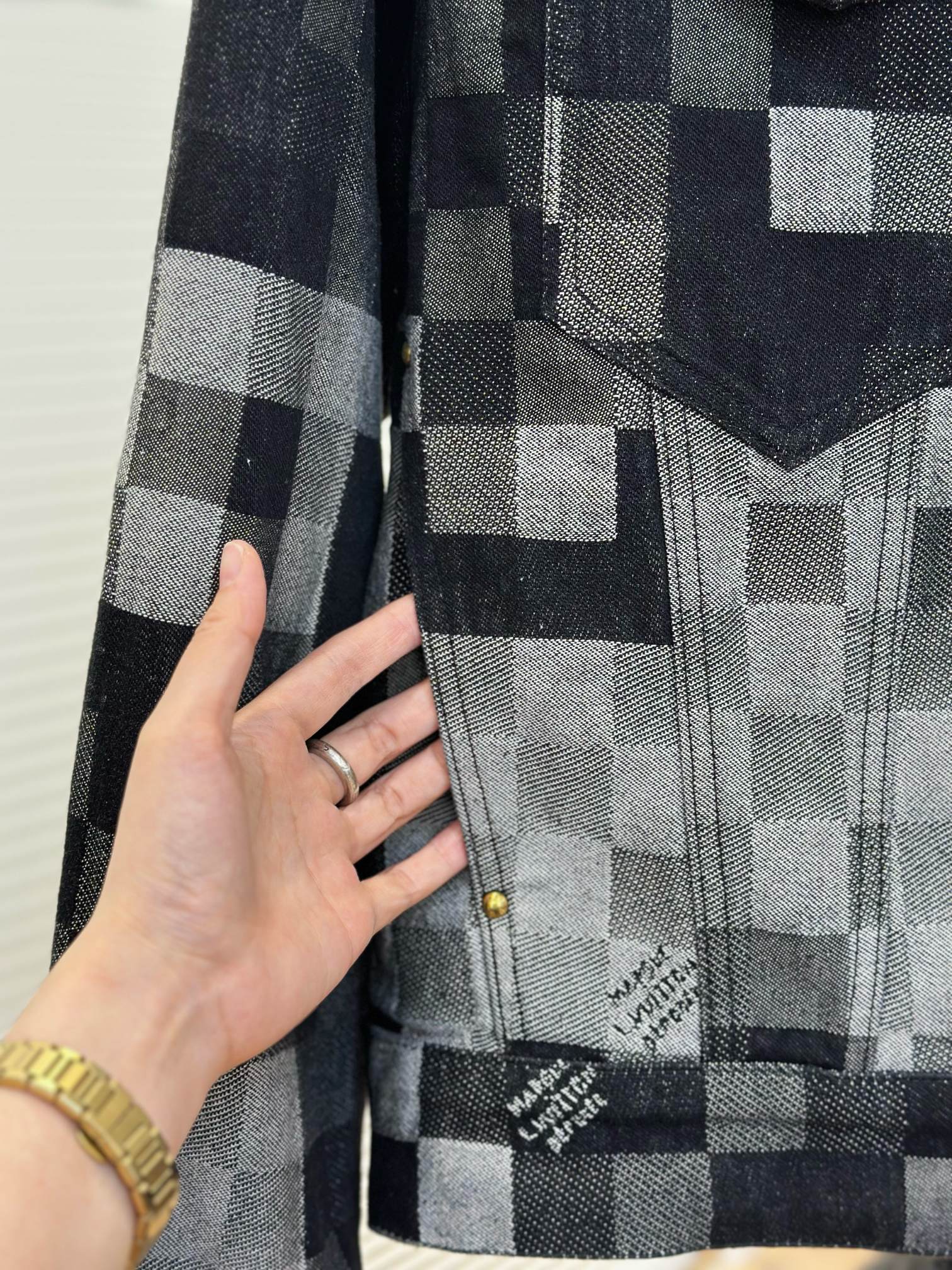Elevate your style with this Louis Vuitton denim jacket featuring a unique mosaic checkered pattern. A perfect blend of luxury and style.