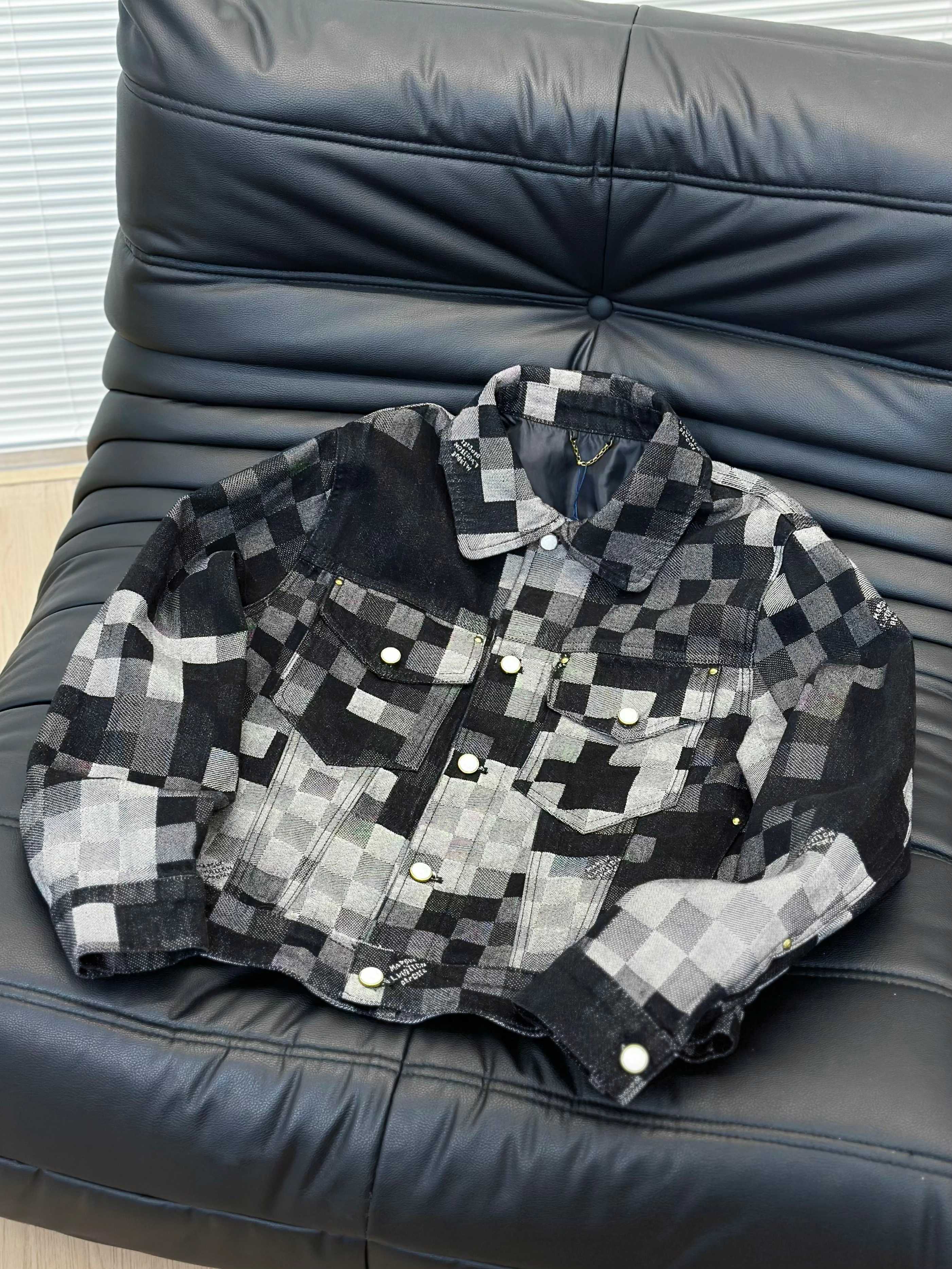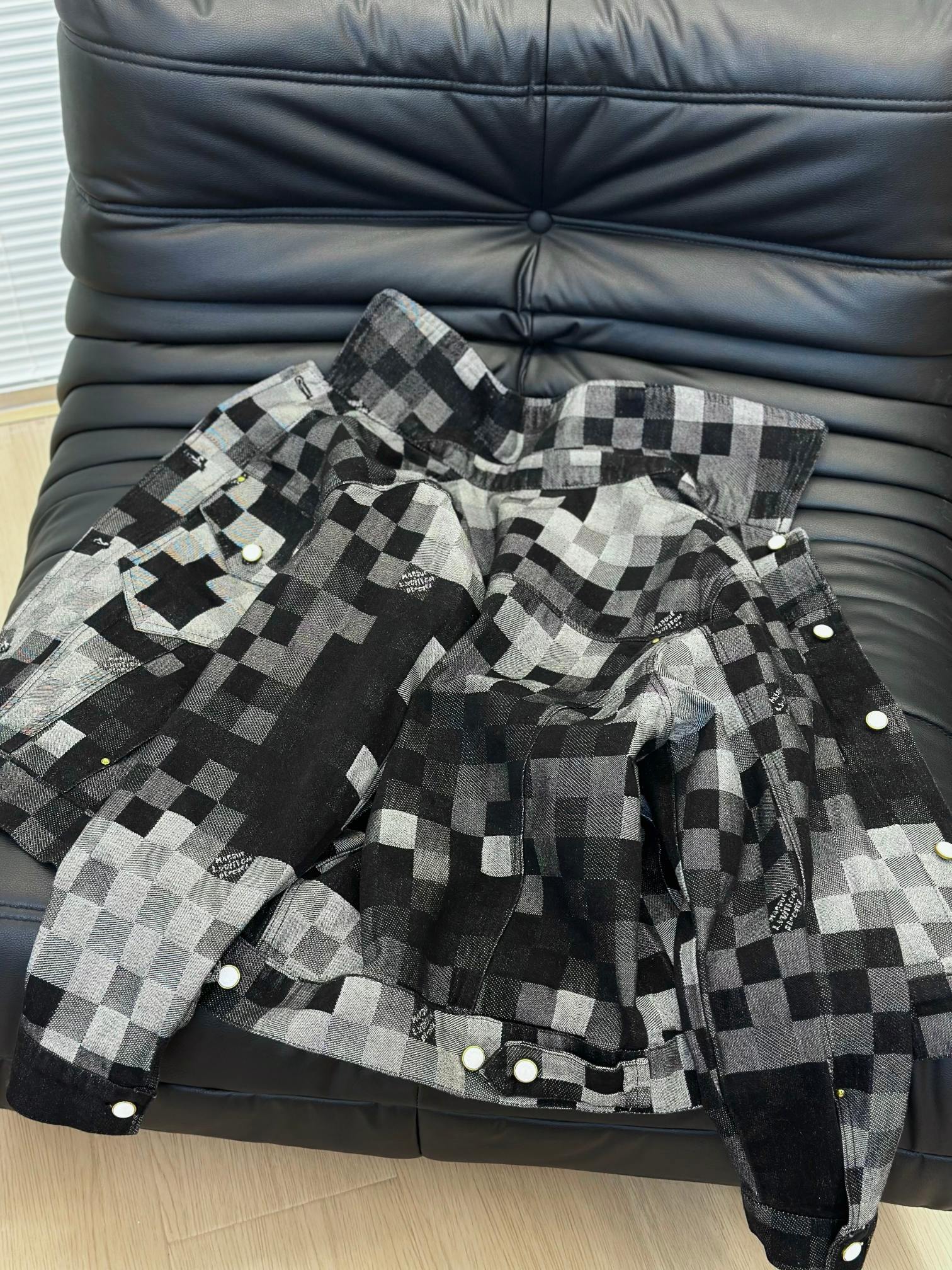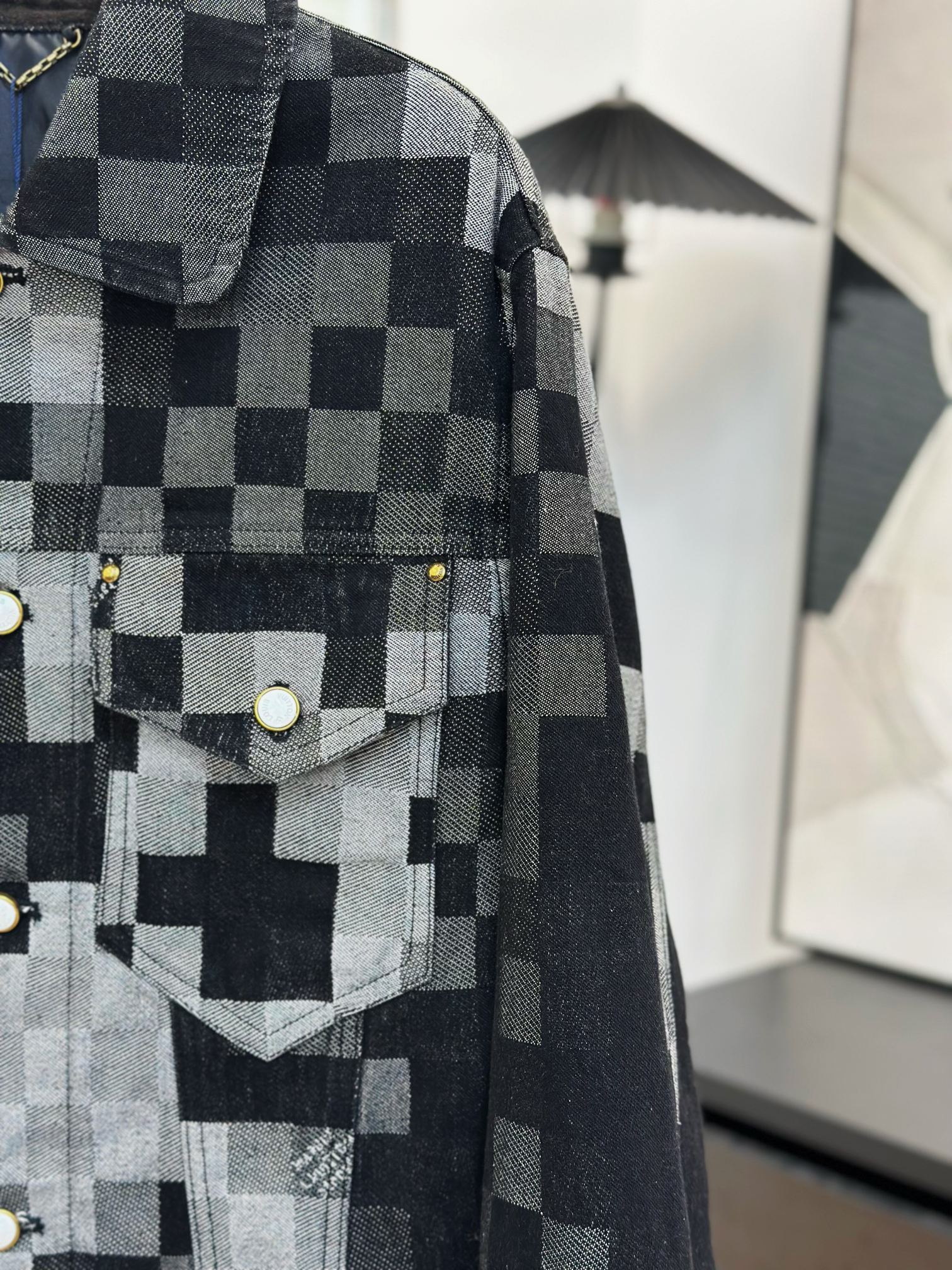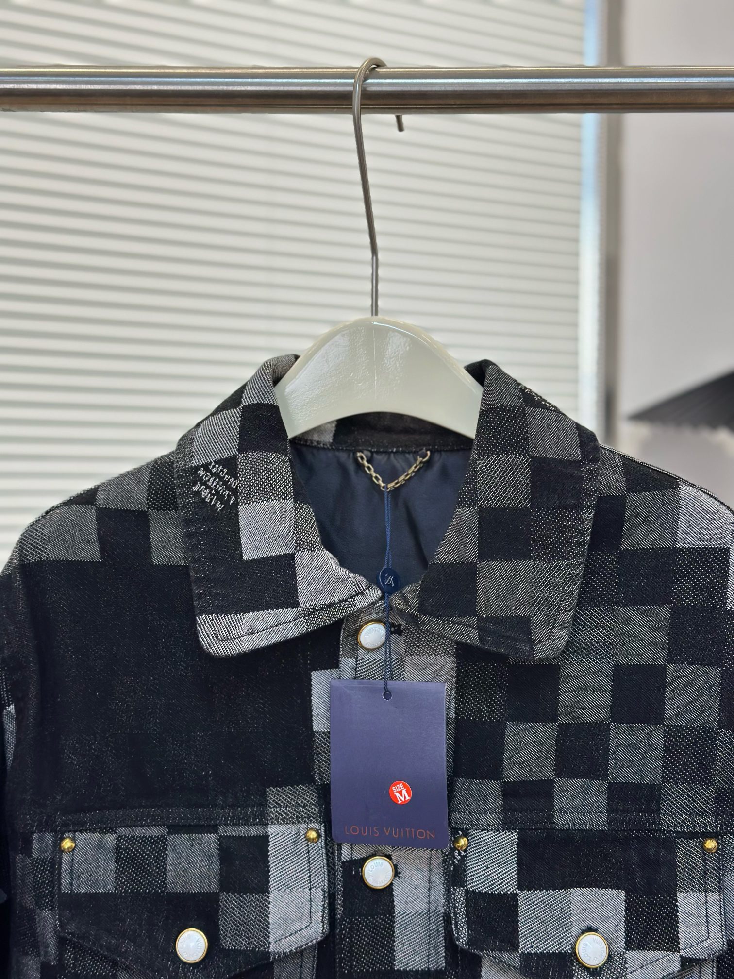 Elevate your style with this Louis Vuitton denim jacket featuring a unique mosaic checkered pattern. A perfect blend of luxury and style.
