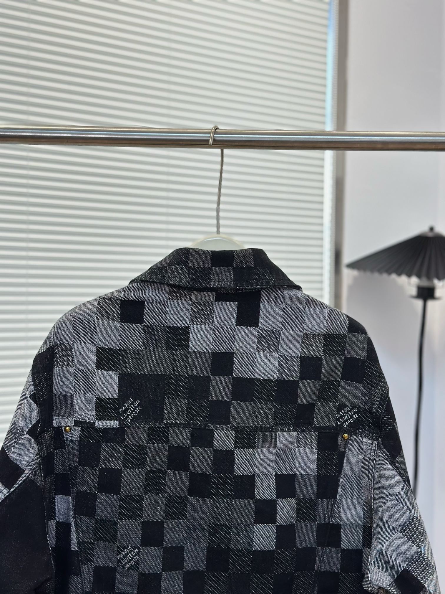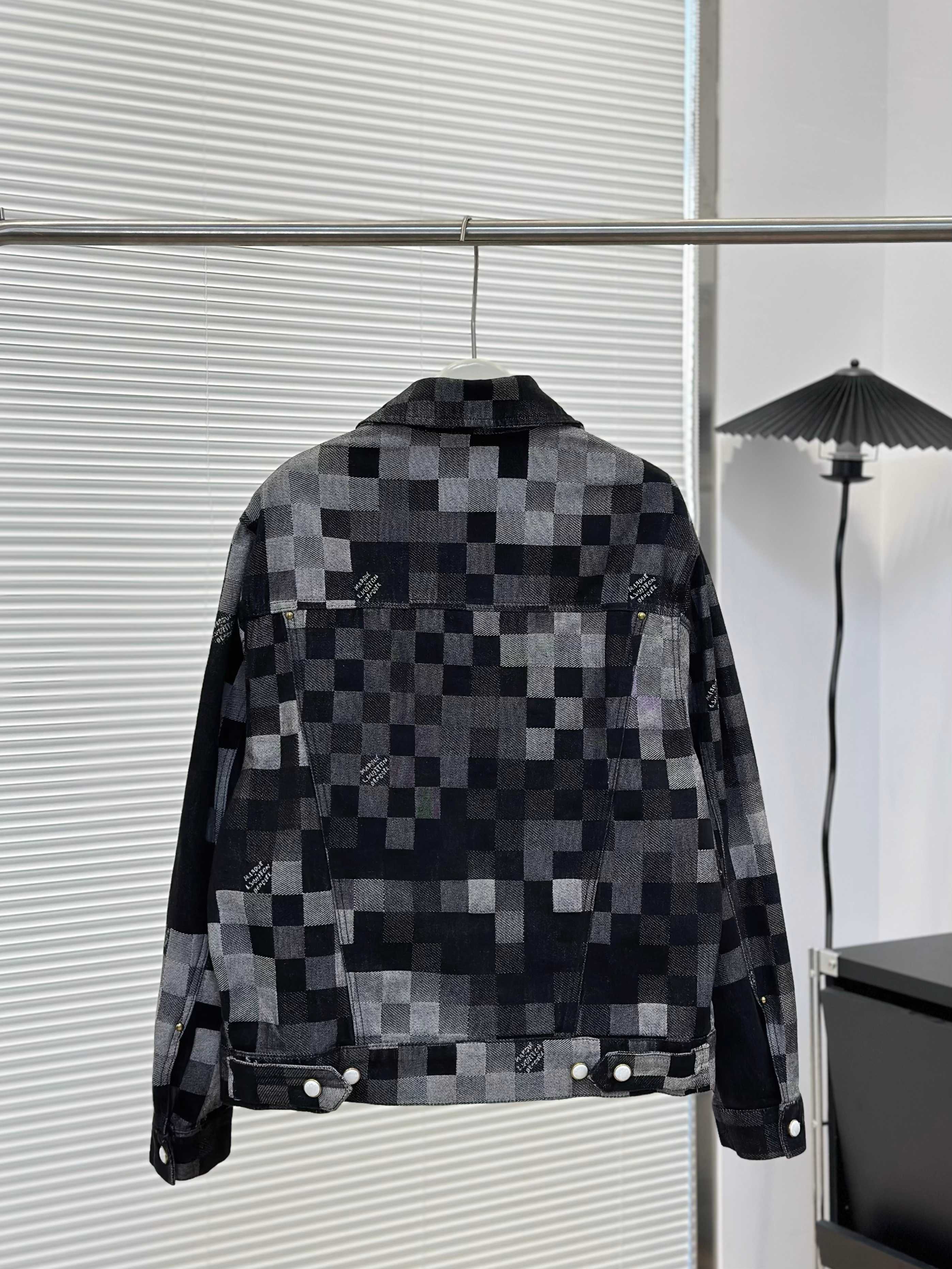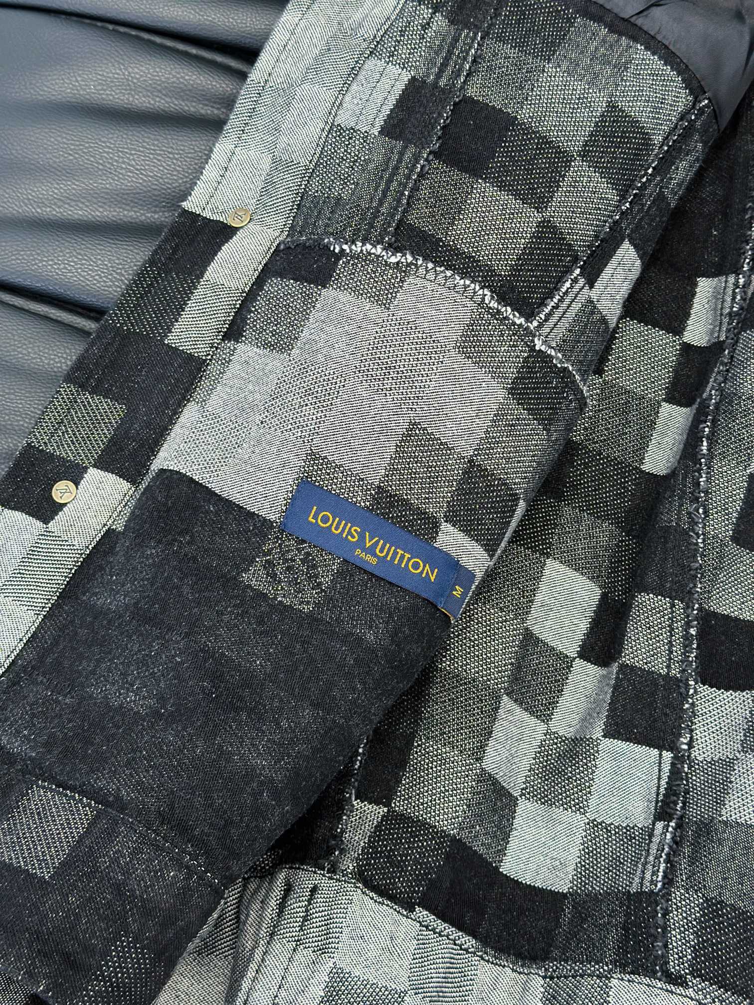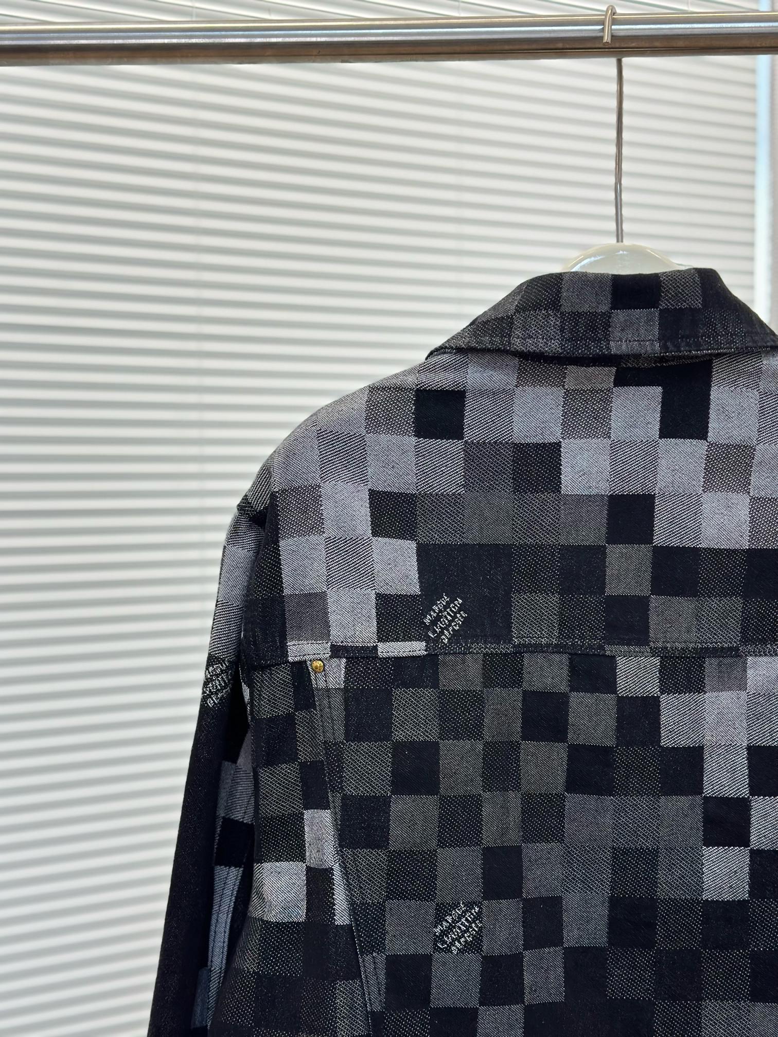Elevate your style with this Louis Vuitton denim jacket featuring a unique mosaic checkered pattern. A perfect blend of luxury and style.