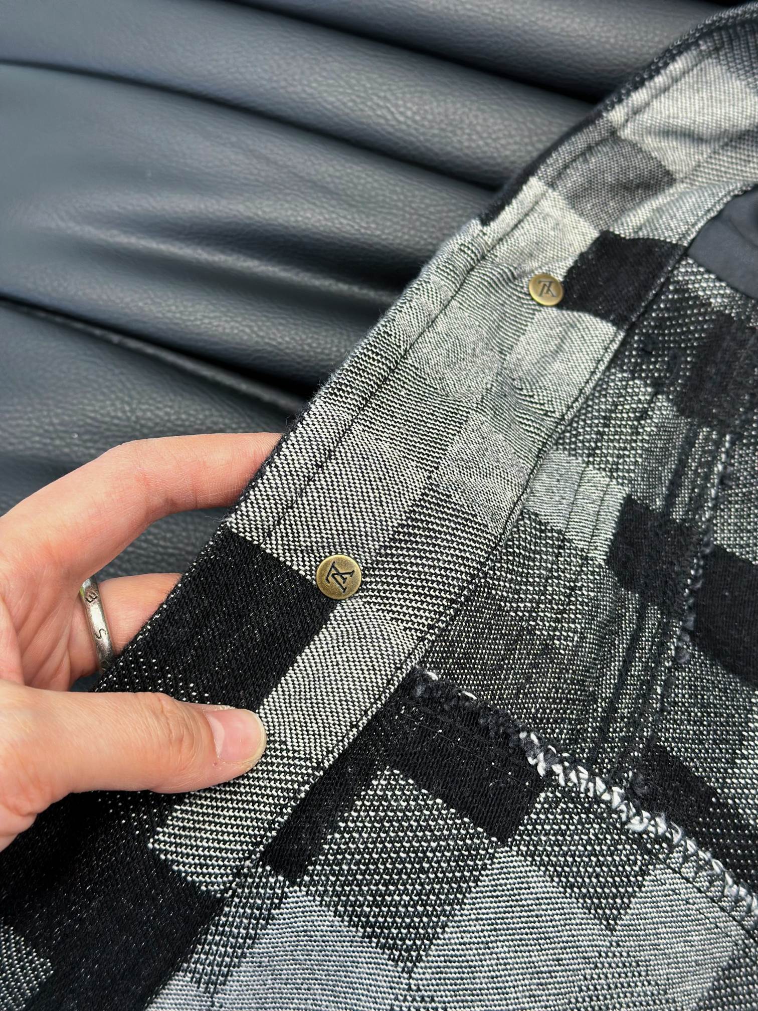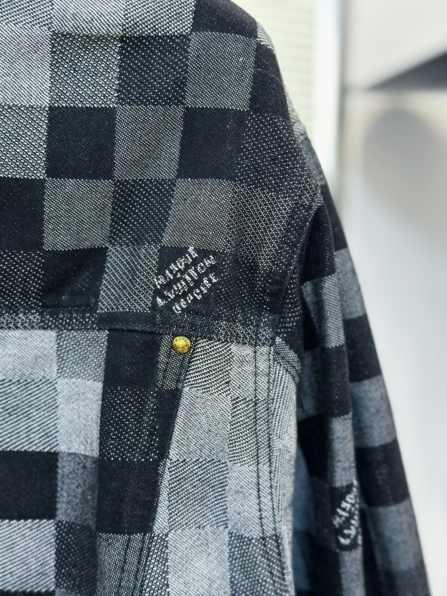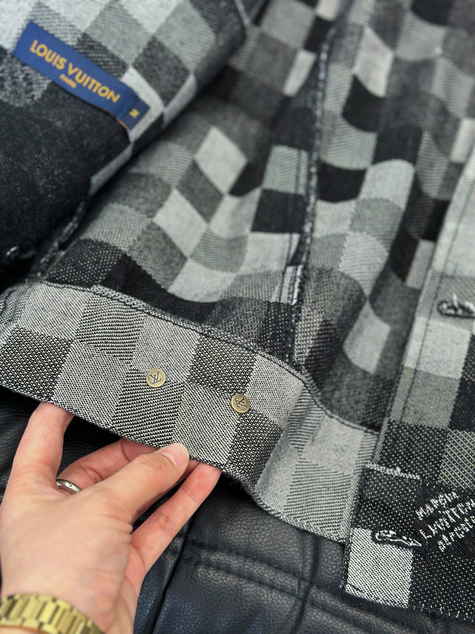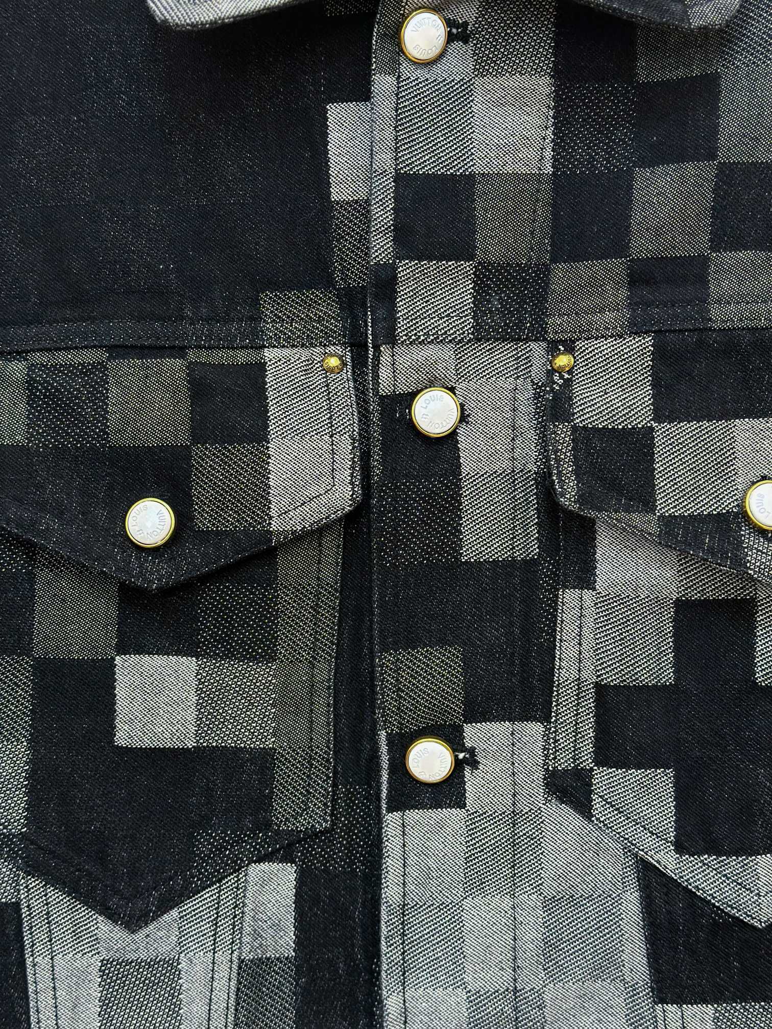 Elevate your style with this Louis Vuitton denim jacket featuring a unique mosaic checkered pattern. A perfect blend of luxury and style.