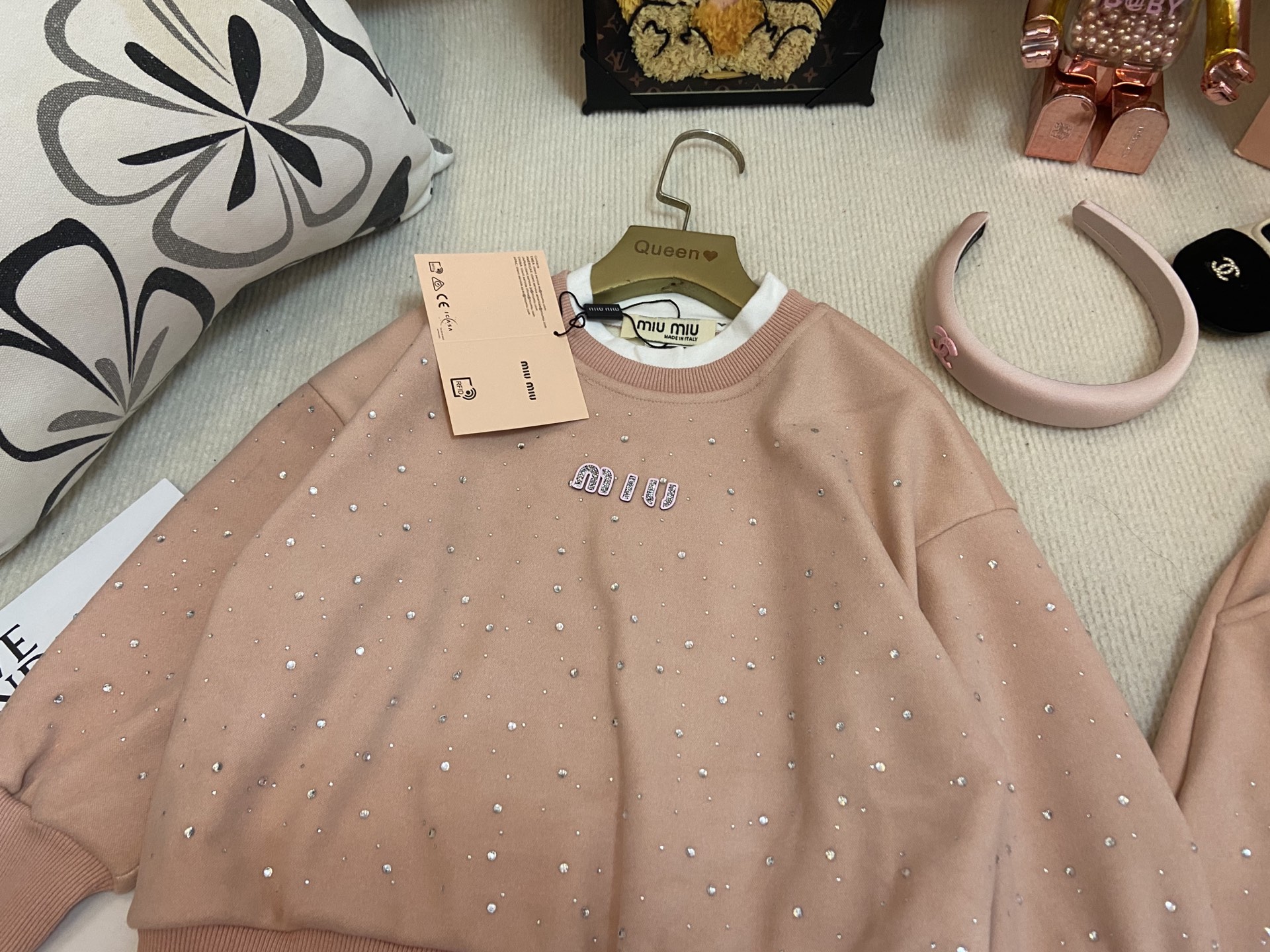 Stay cozy and stylish with this Miu Miu inspired tracksuit set. Perfect for a casual day out or lounging at home, this set features sparkling rhinestone accents.