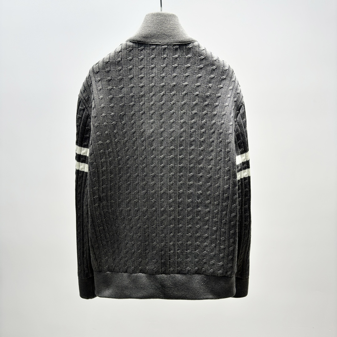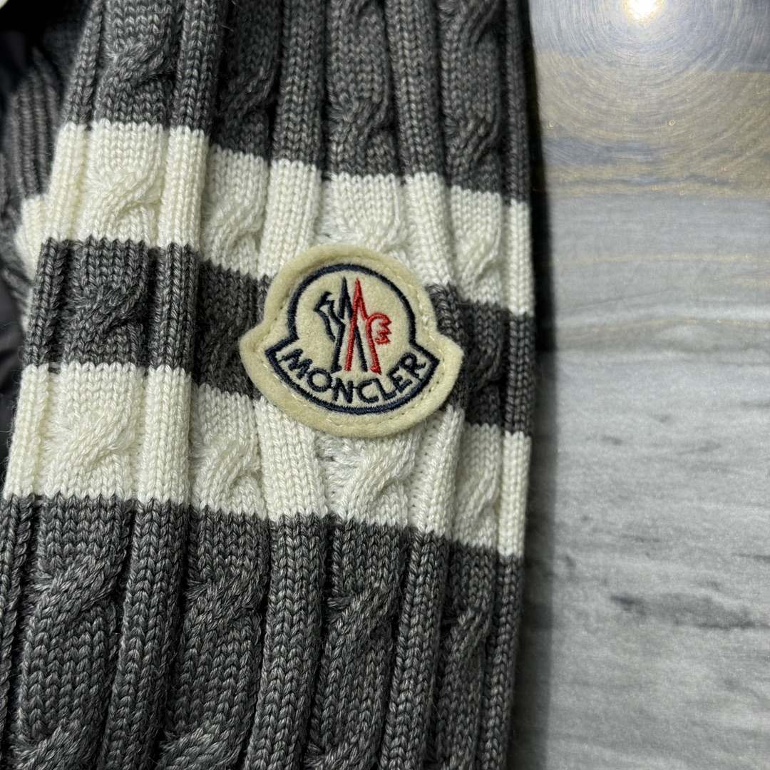 Stay warm and stylish in this Moncler jacket. Features a stand collar, striped wool sleeves, and a quilted body for ultimate comfort.