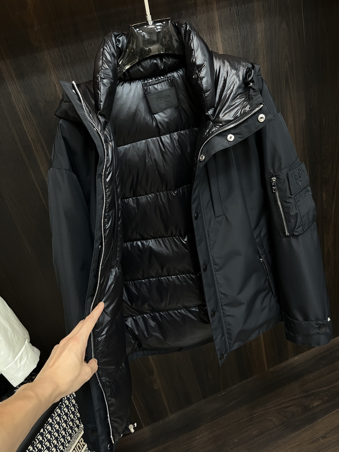 This Prada hooded down jacket is a must-have for the modern man. It combines high-end fashion with practical design, making it perfect for everyday wear.