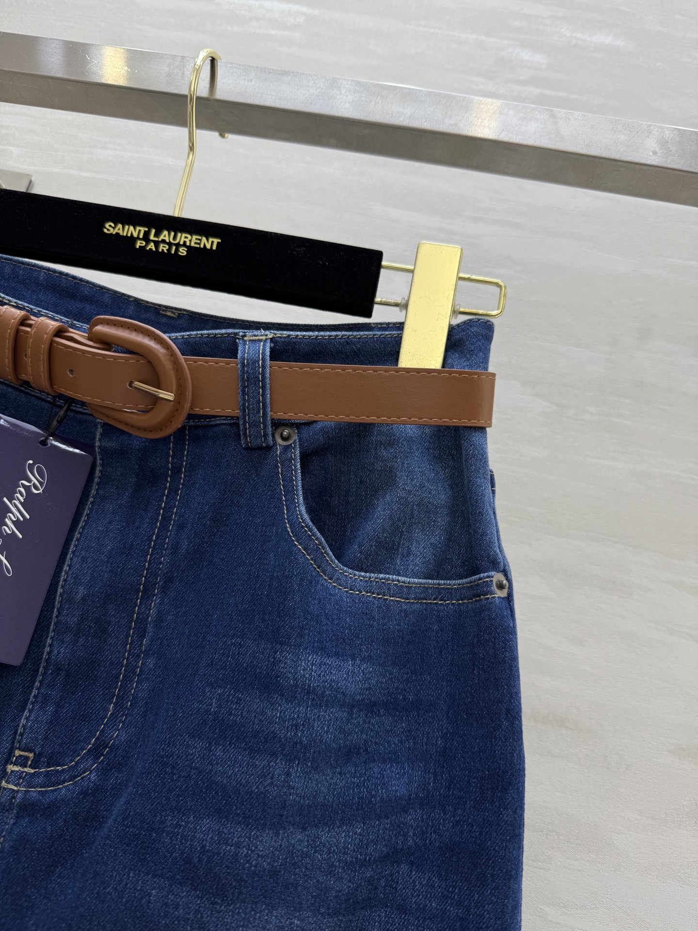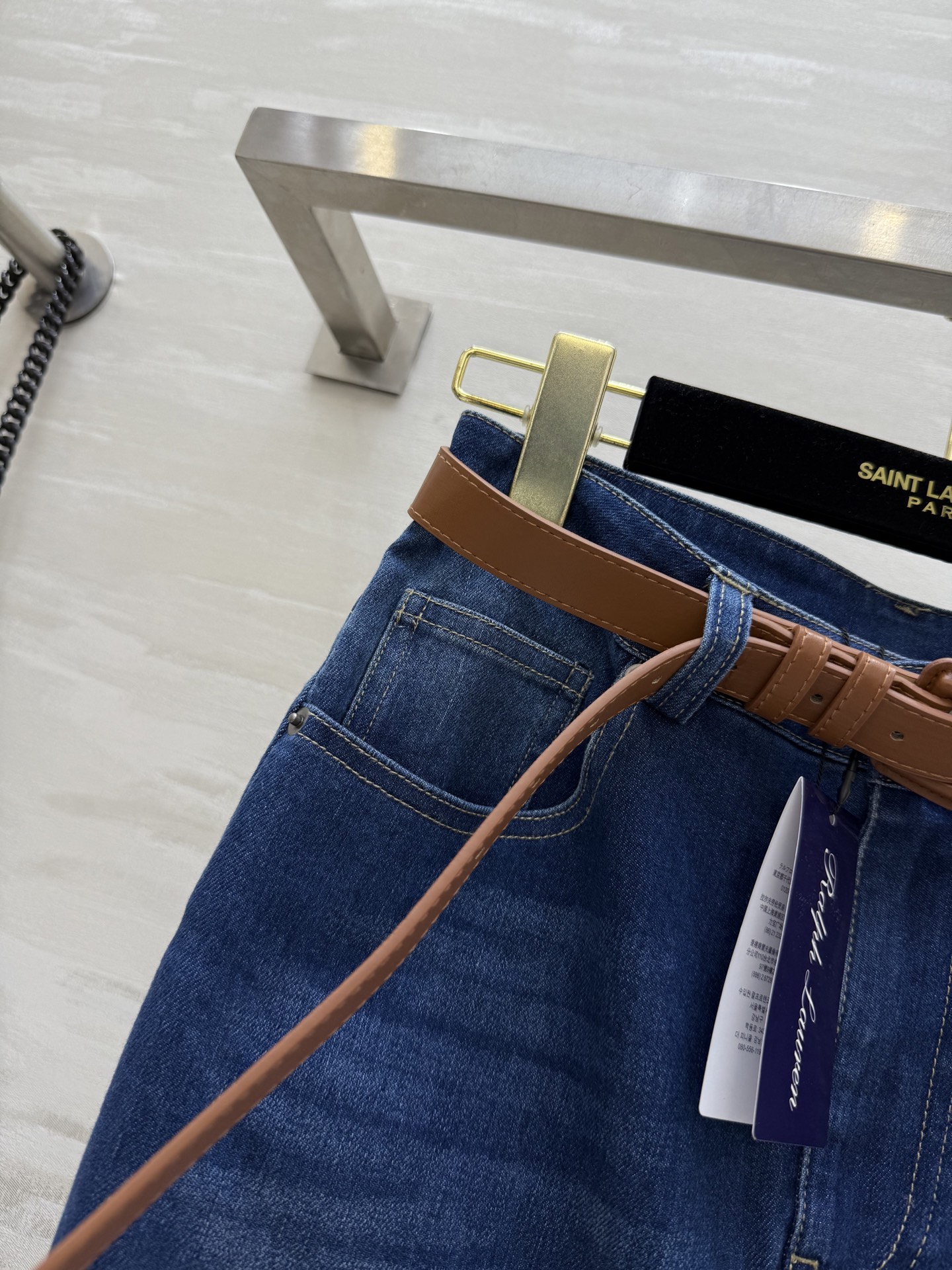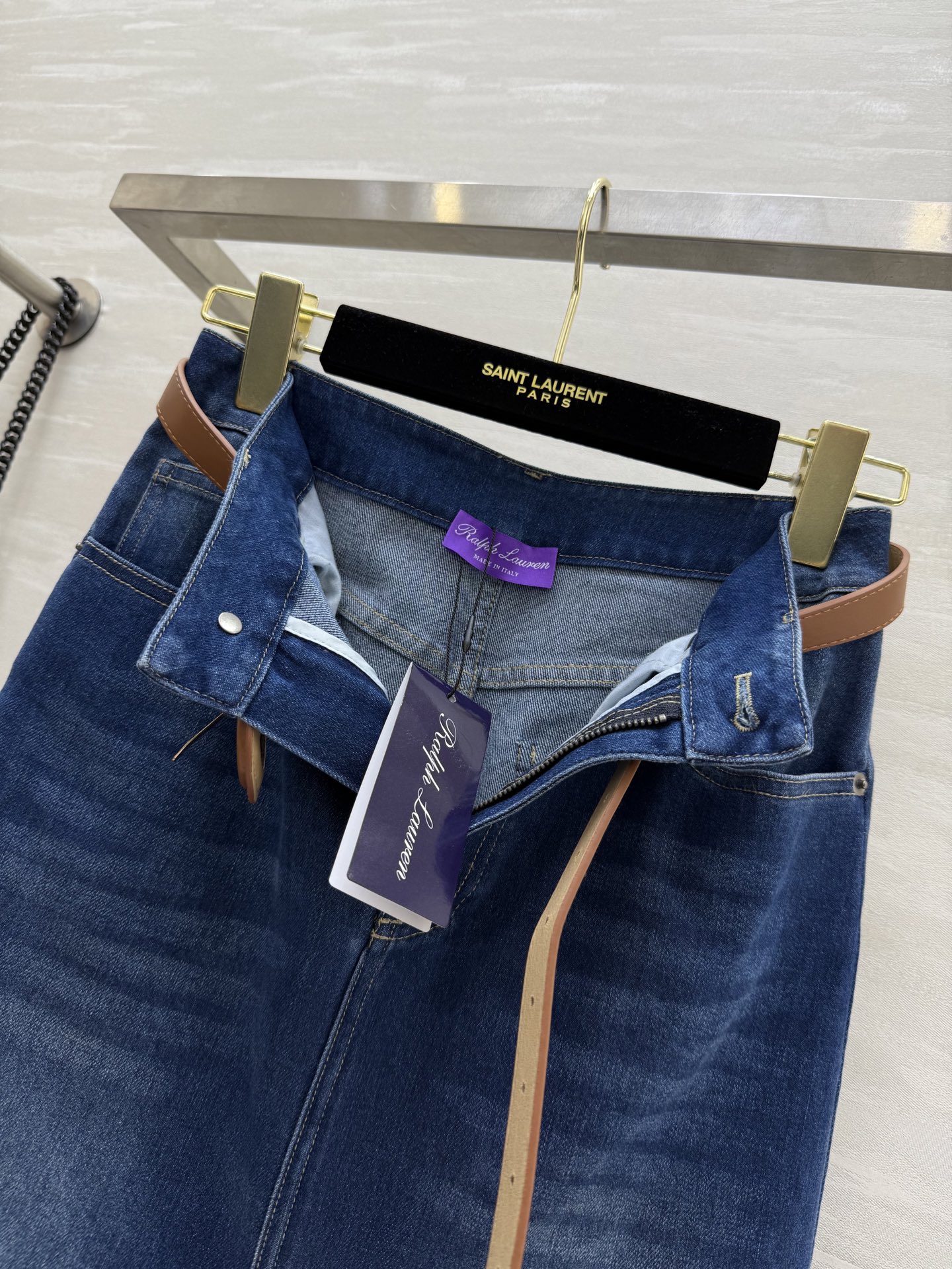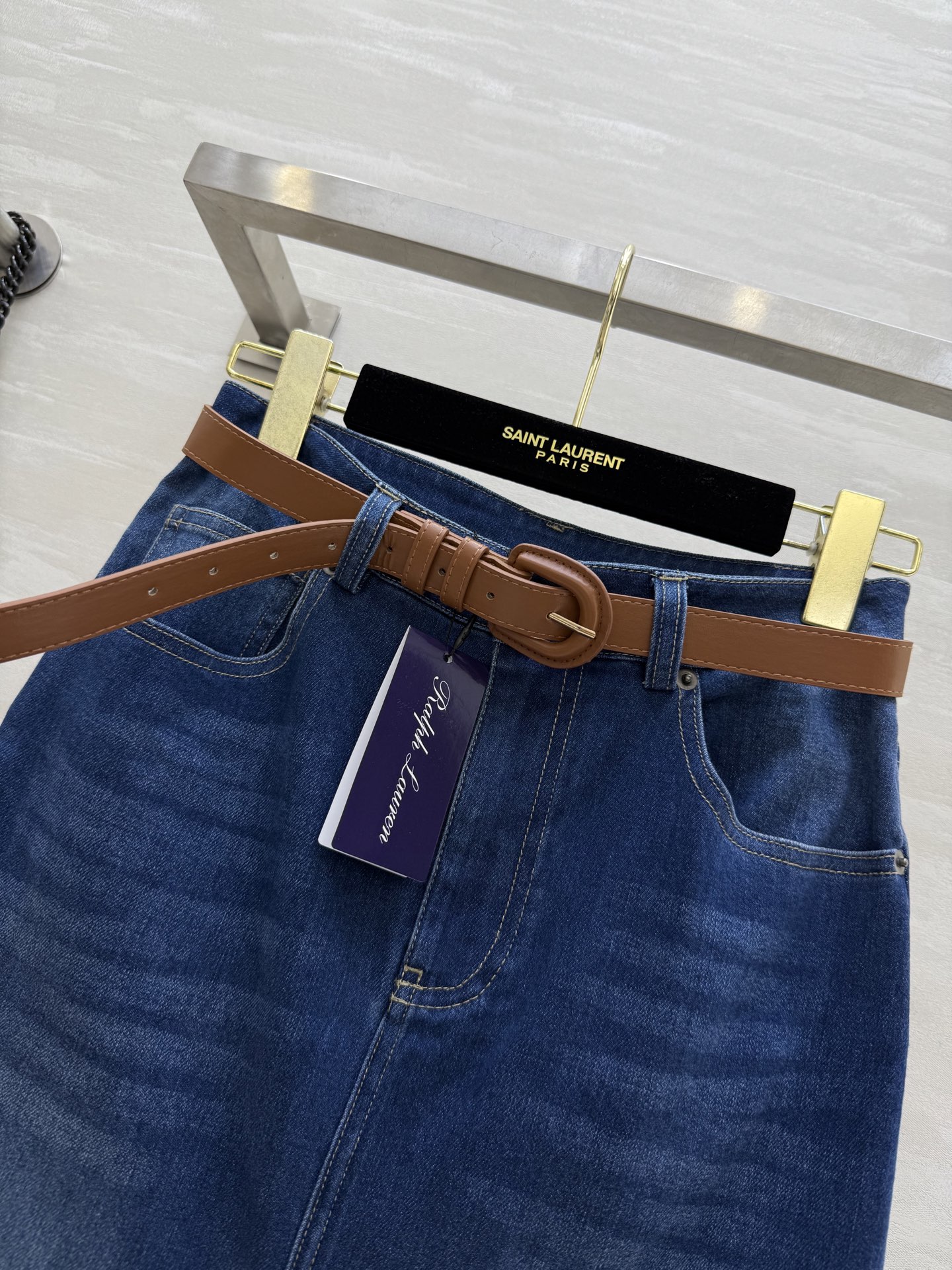 Elevate your denim game with this Ralph Lauren midi skirt. Distressed finish, front slit, and included belt make it a chic choice. Available in S, M, L.