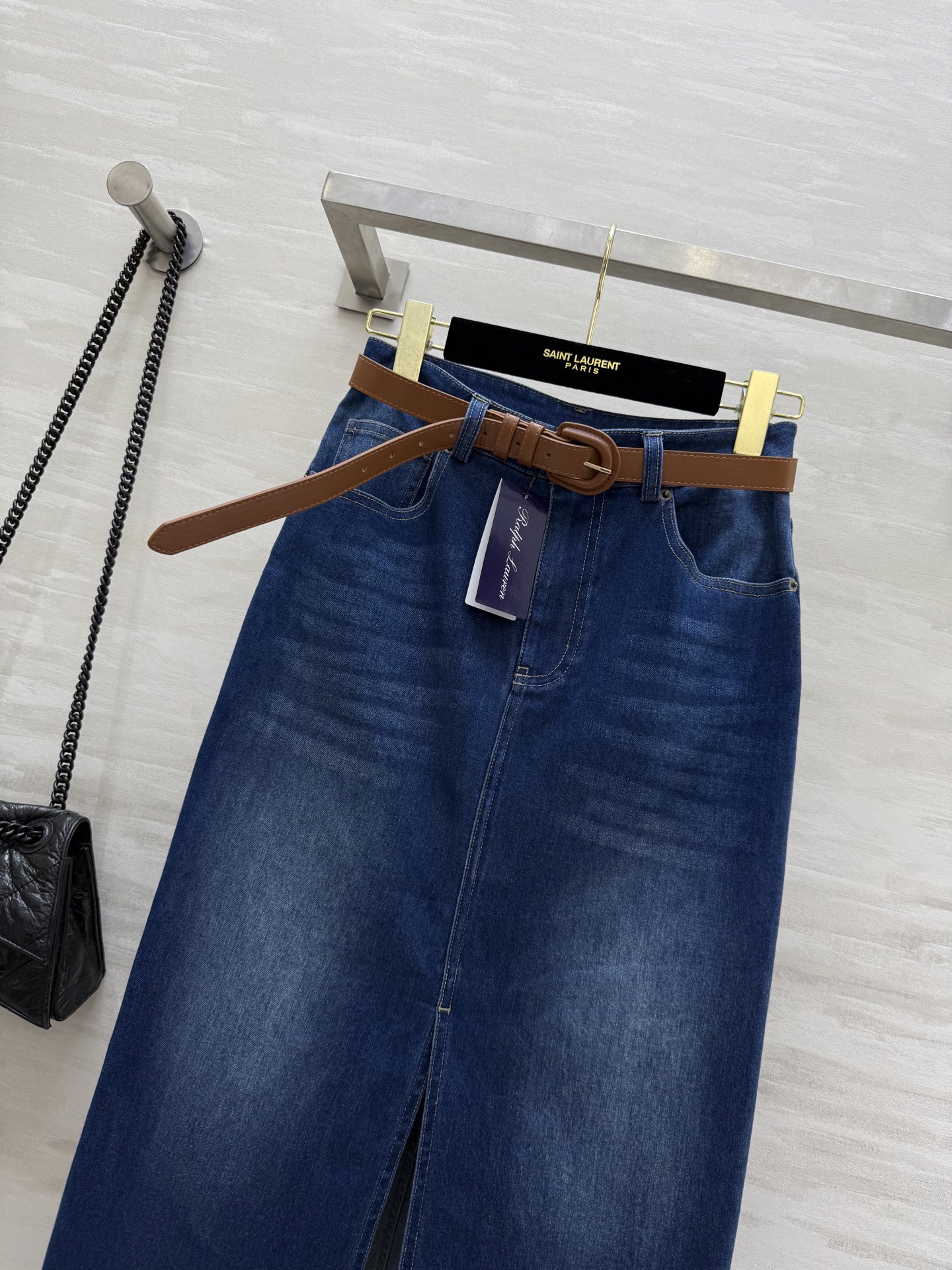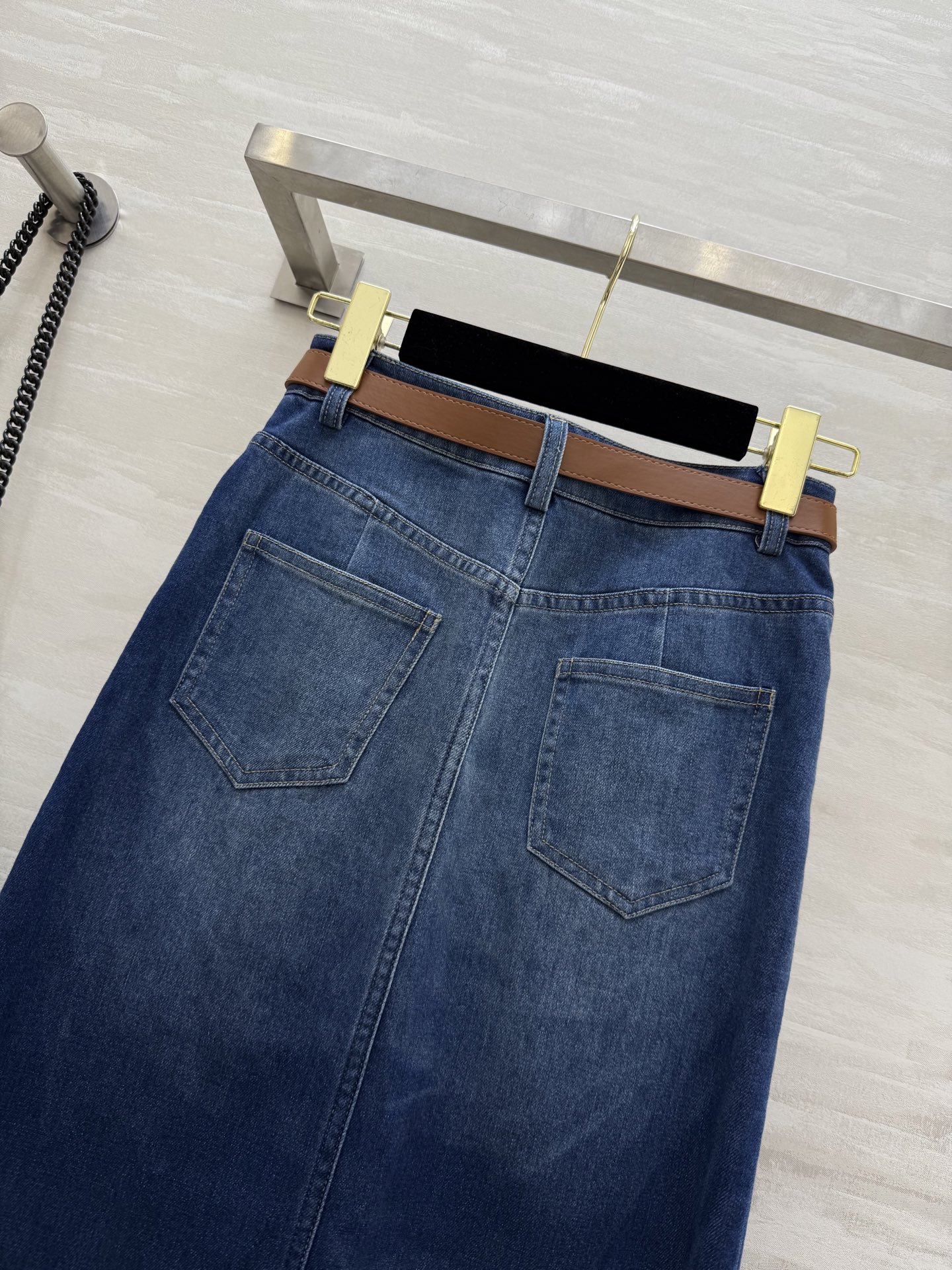 This skirt is so stylish and comfortable. The denim is high-quality, and I love the way it looks with the belt. The front slit is a nice detail that sets it apart from other denim skirts.