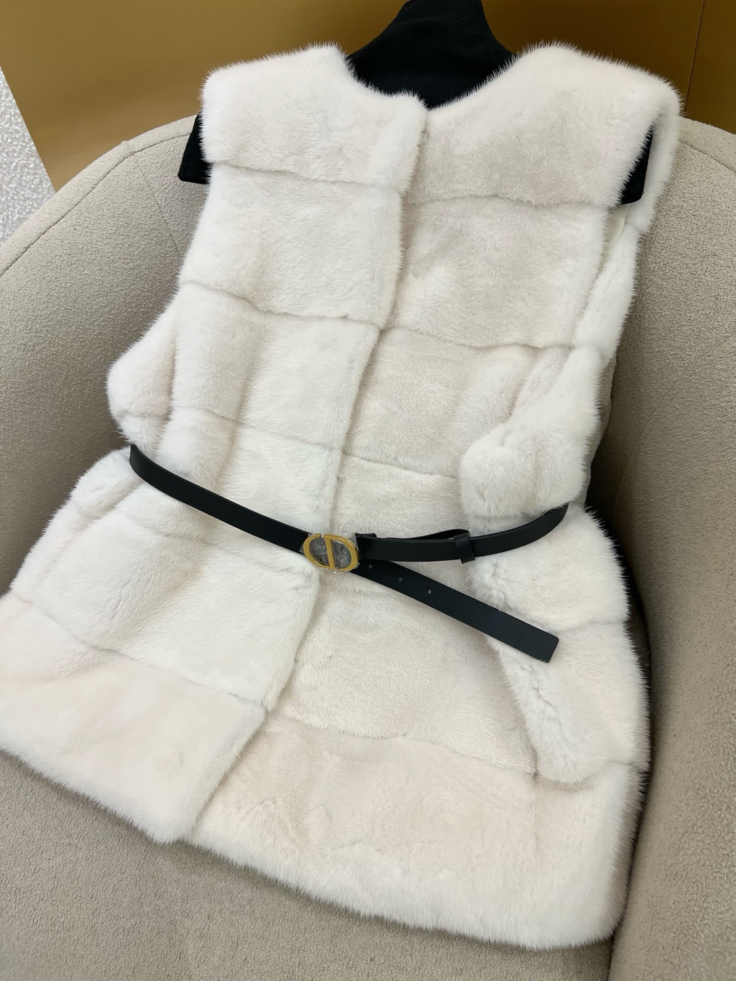 Elevate your style with this luxurious pearl white mink fur vest. Features a modern horizontal design and comes with a stylish black belt. Perfect for any occasion!