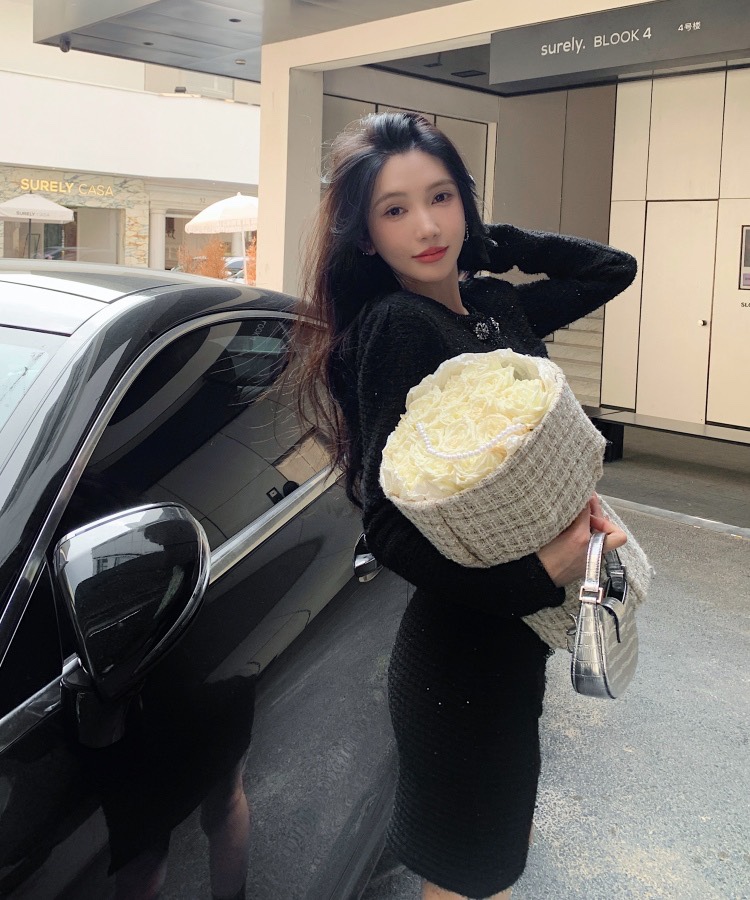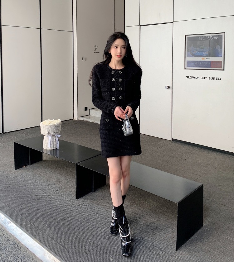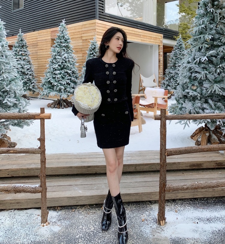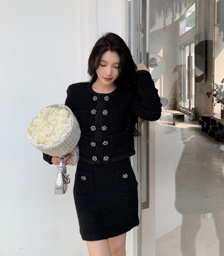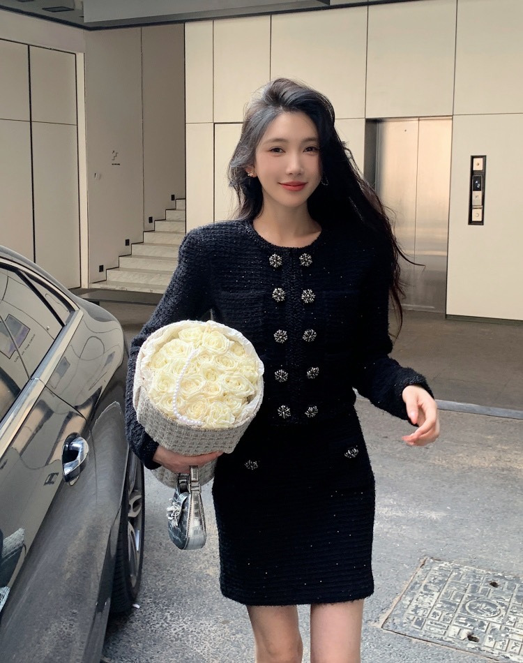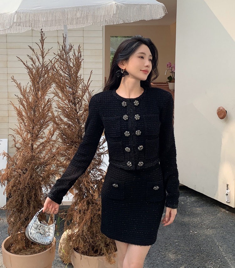 This knit cardigan and skirt set is inspired by the elegant designs of Self-Portrait and the classic style of Chanel, offering a sophisticated and fashionable ensemble.