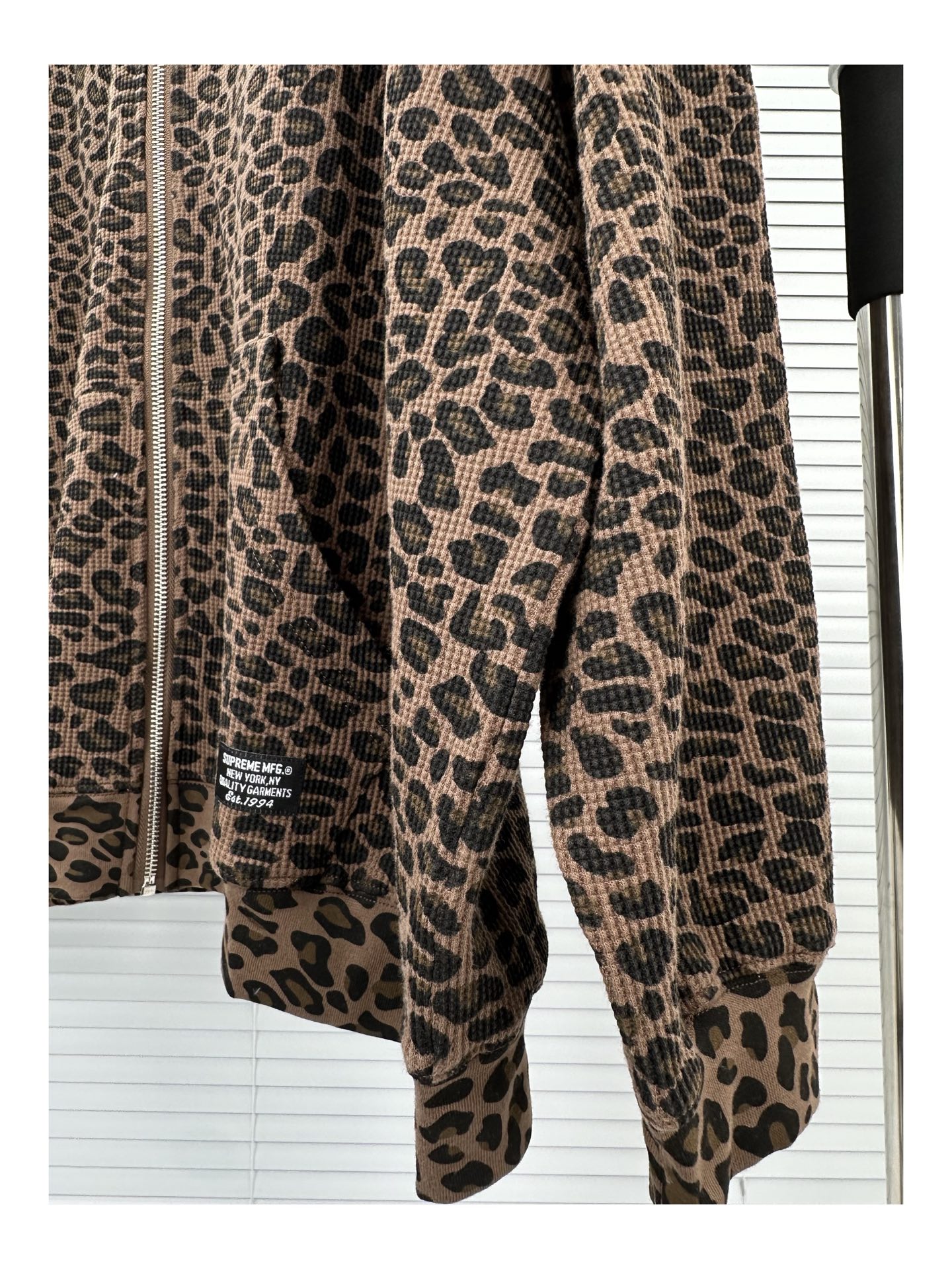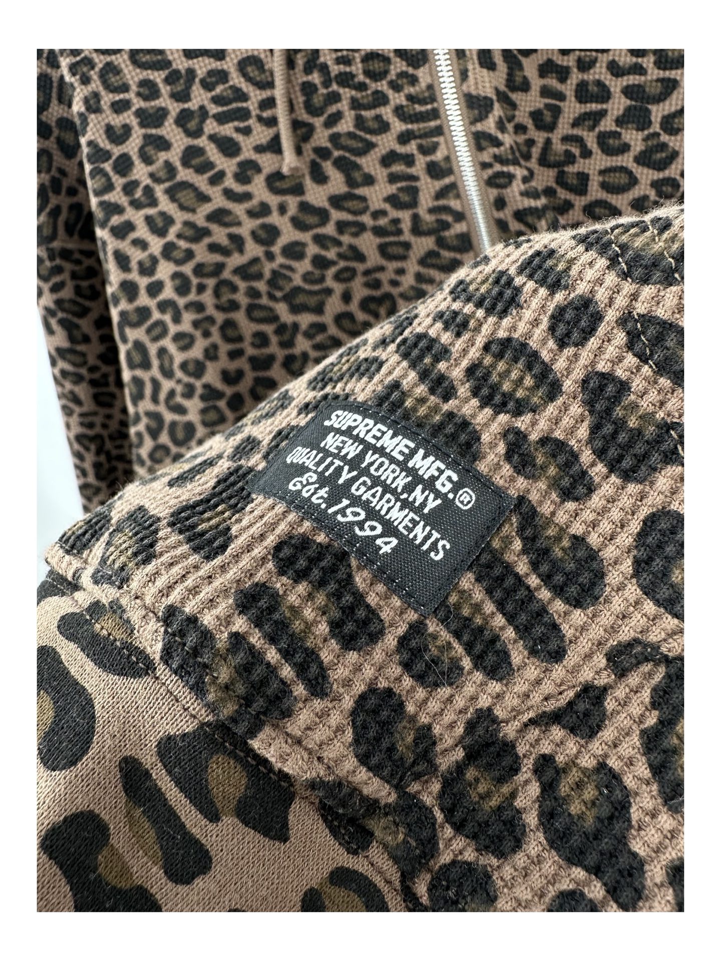 Stay warm and stylish with this Supreme Thermal Hooded Zip Up. Featuring a unique leopard print and waffle knit material.