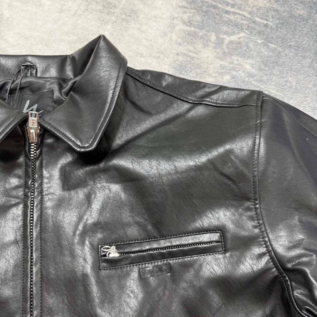 Elevate your style with this Supreme x Yohji Yamamoto leather jacket. Features unique sleeve prints, a zip closure, and a tailored fit.