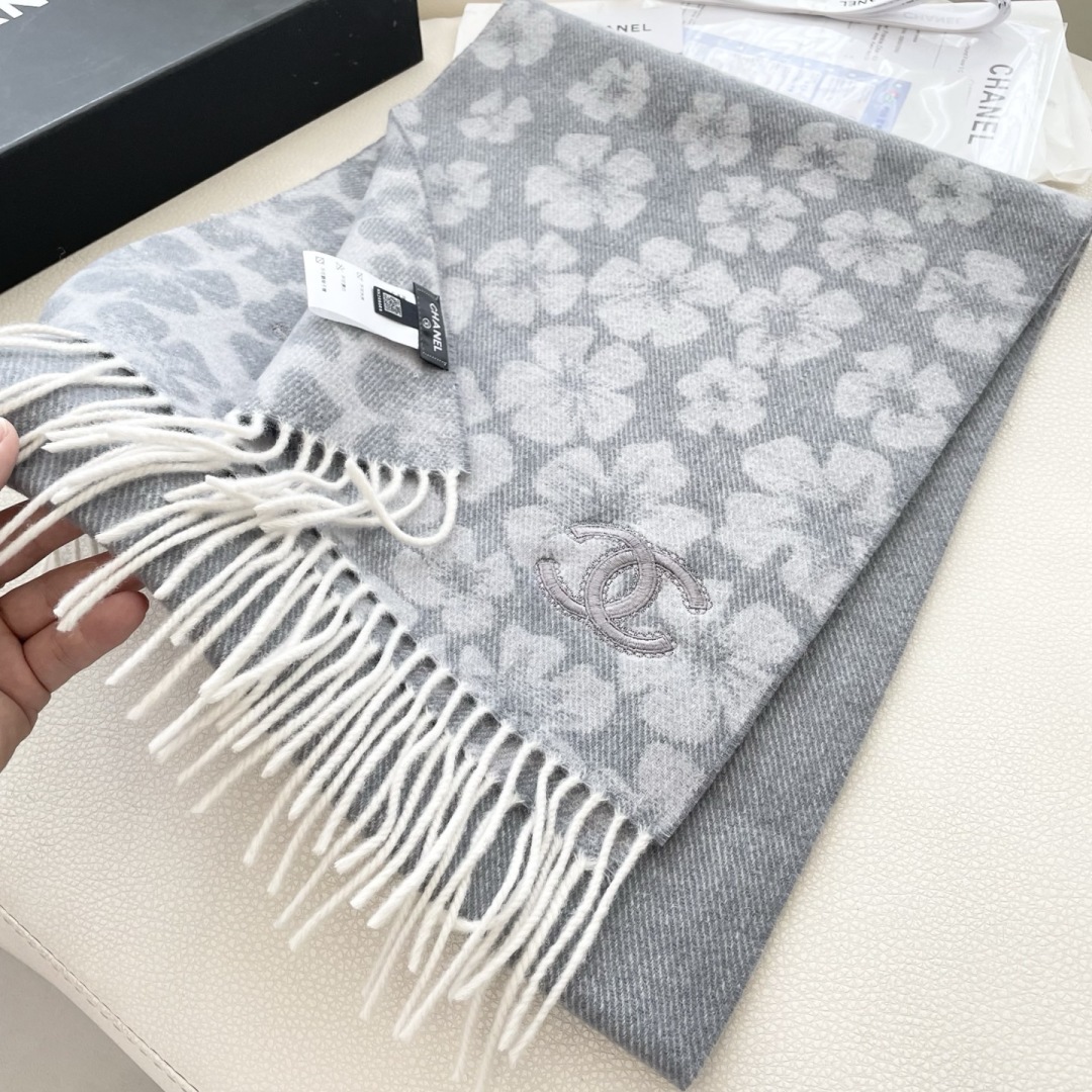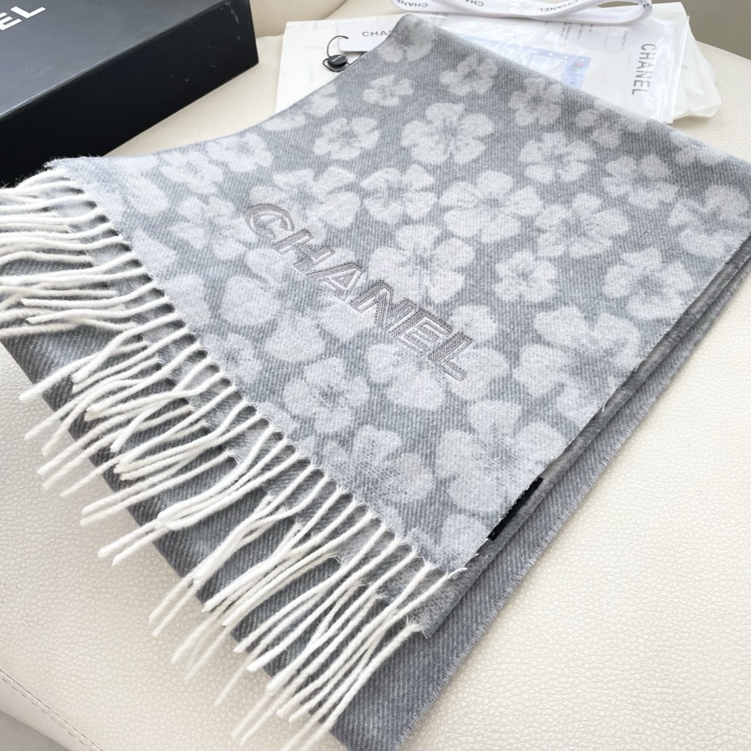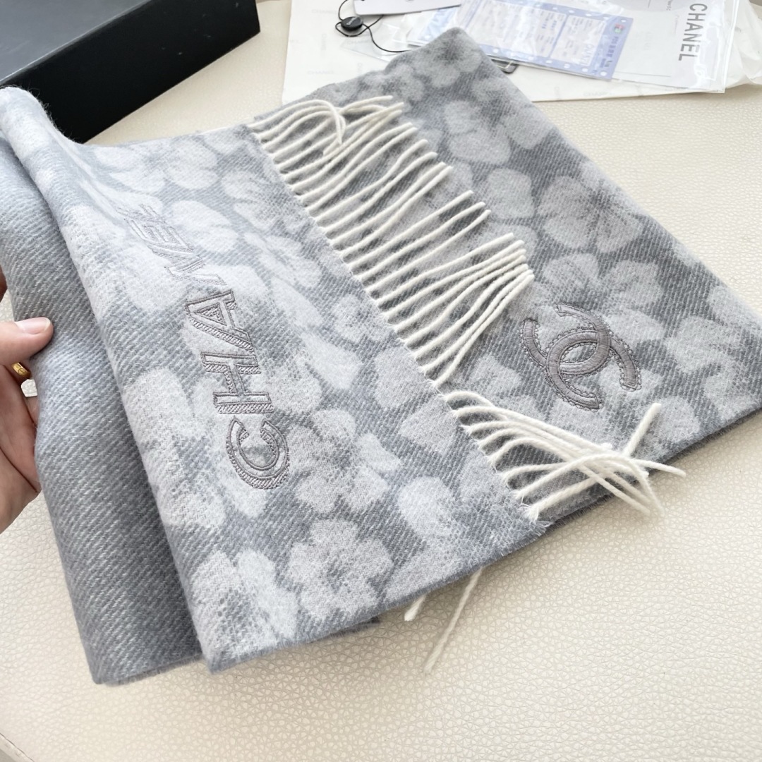 Chanel Gray Cashmere Scarf with Floral Pattern and Fringed Edges, 35 x 180 cm
