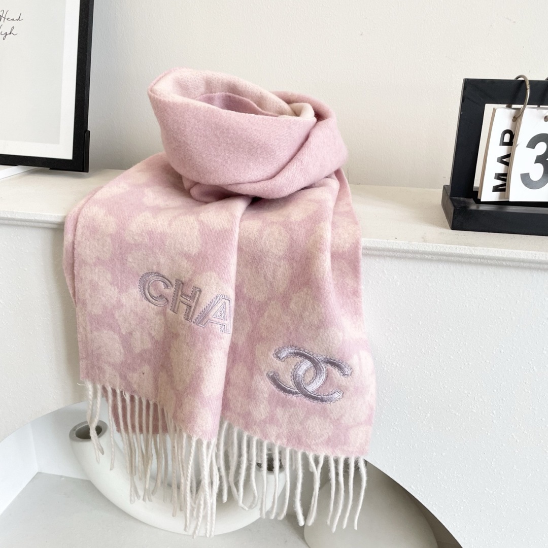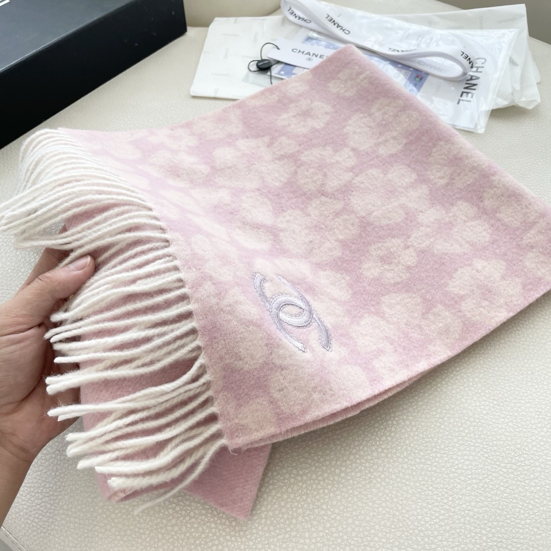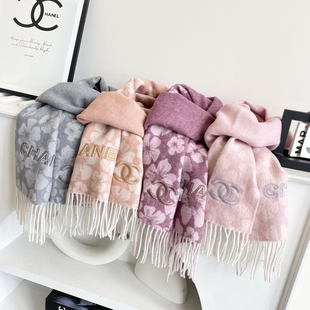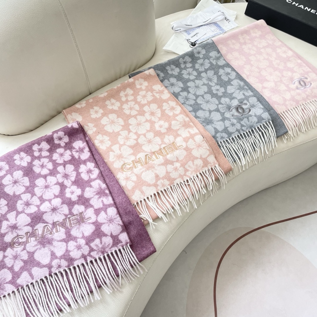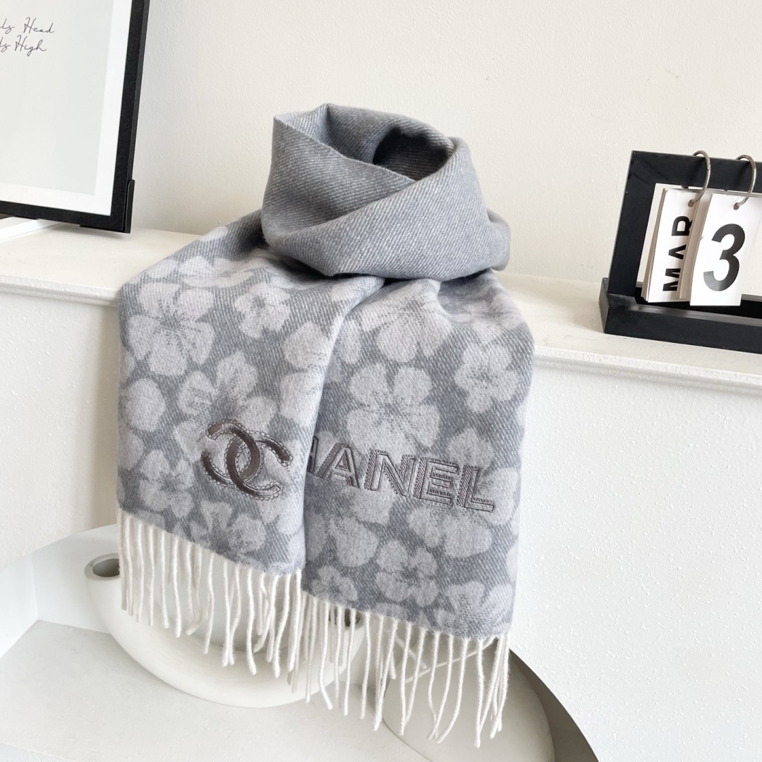 Elevate your style with this Chanel cashmere scarf. Features a chic floral pattern and fringed edges. Soft, warm, and effortlessly elegant.