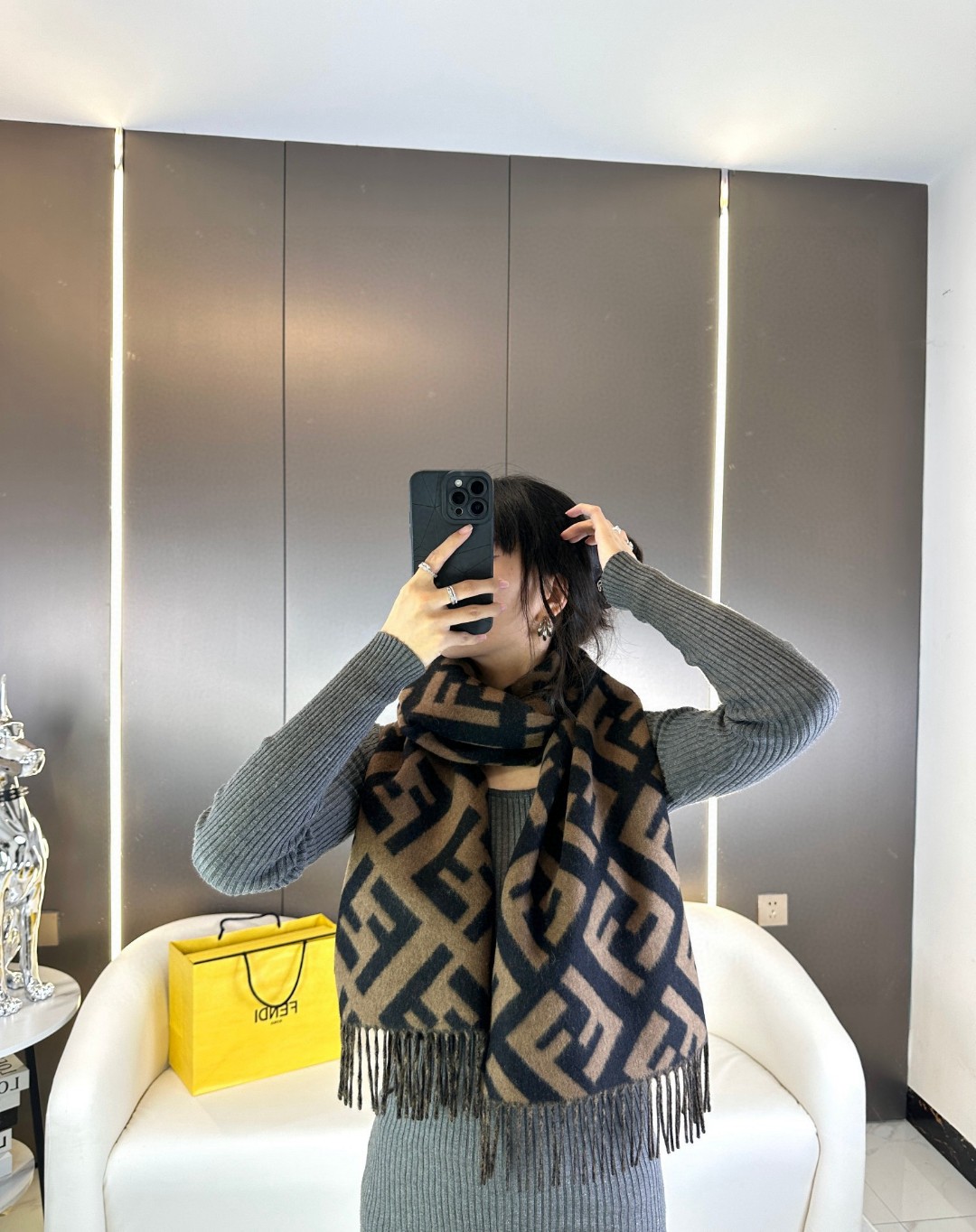 Enhance your wardrobe with the Fendi Brown Wool & Cashmere FF Motif Fringe Scarf. Its luxurious materials, iconic design, and stylish details make it a must-have accessory for any fashion-conscious individual.