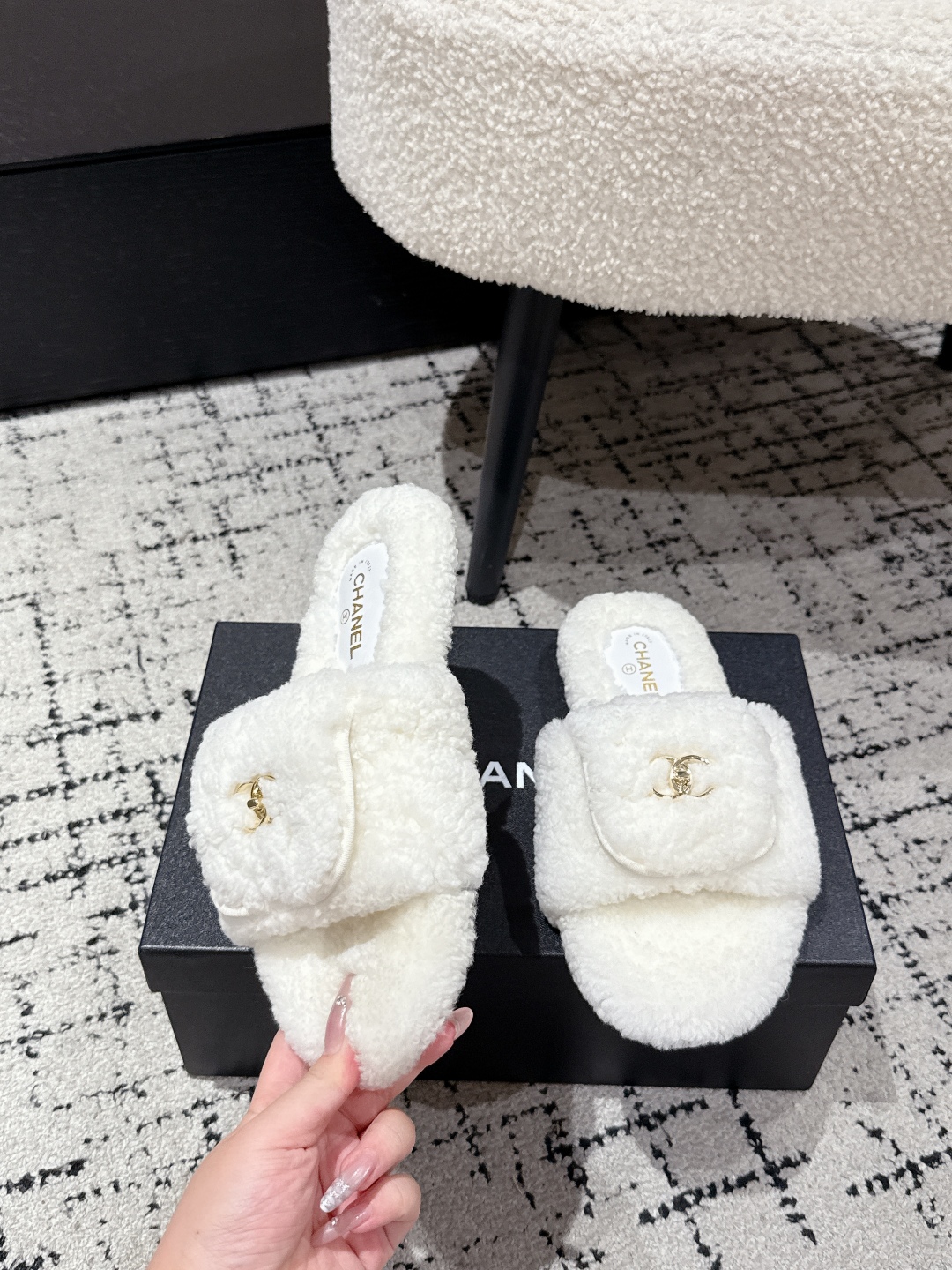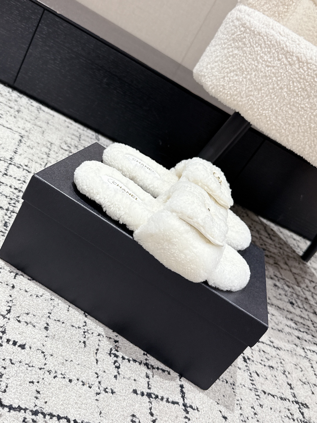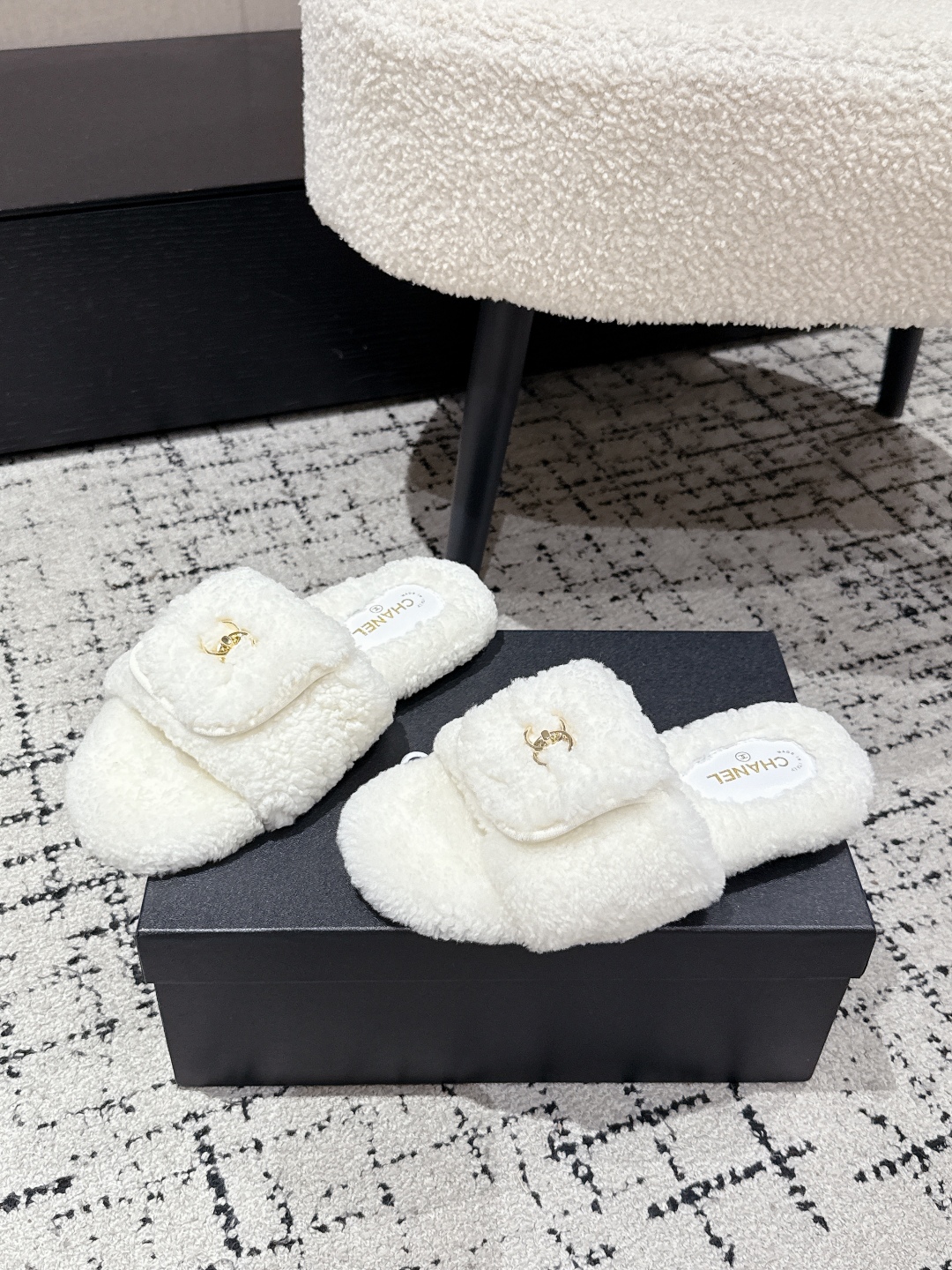 Indulge in cozy comfort with these chic Chanel shearling slides. Featuring a classic CC logo, these luxury slippers blend warmth and iconic style.