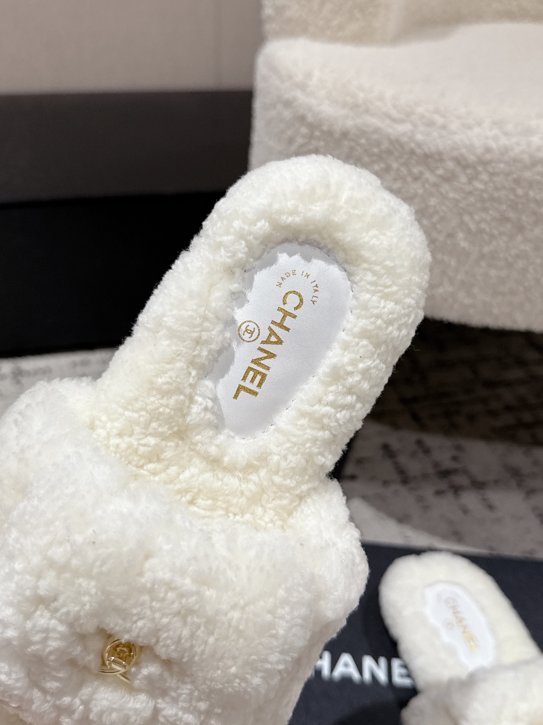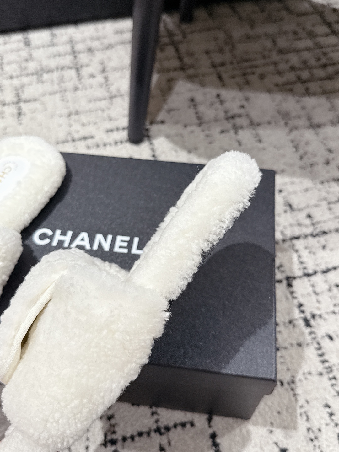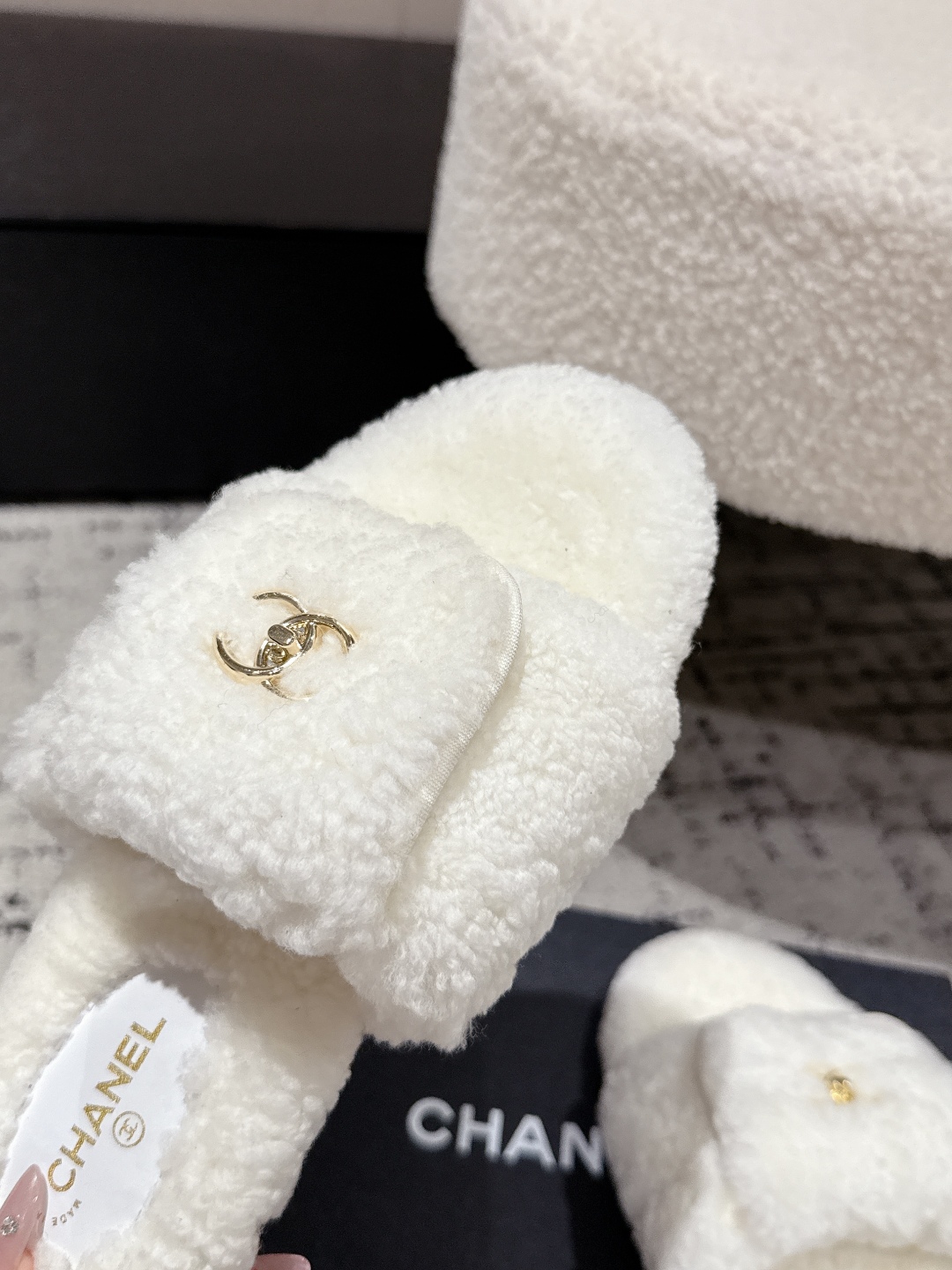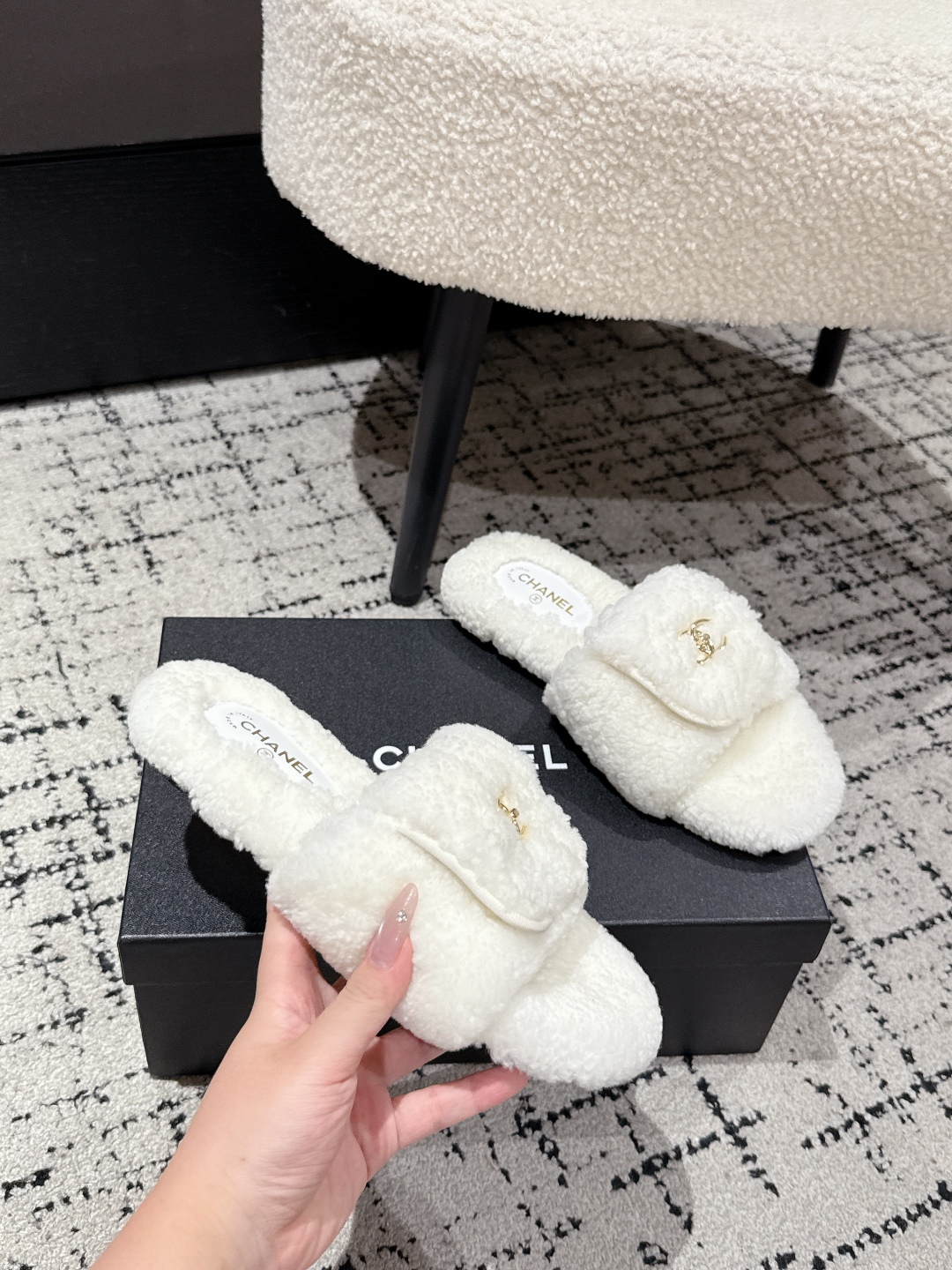 Indulge in cozy comfort with these chic Chanel shearling slides. Featuring a classic CC logo, these luxury slippers blend warmth and iconic style.