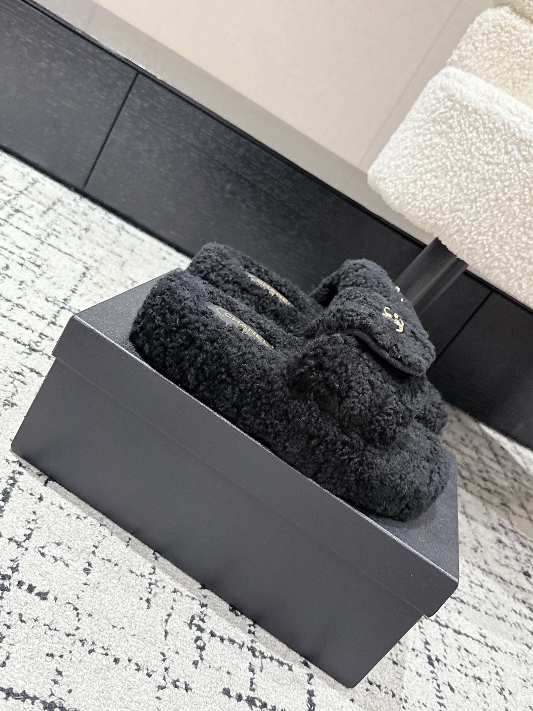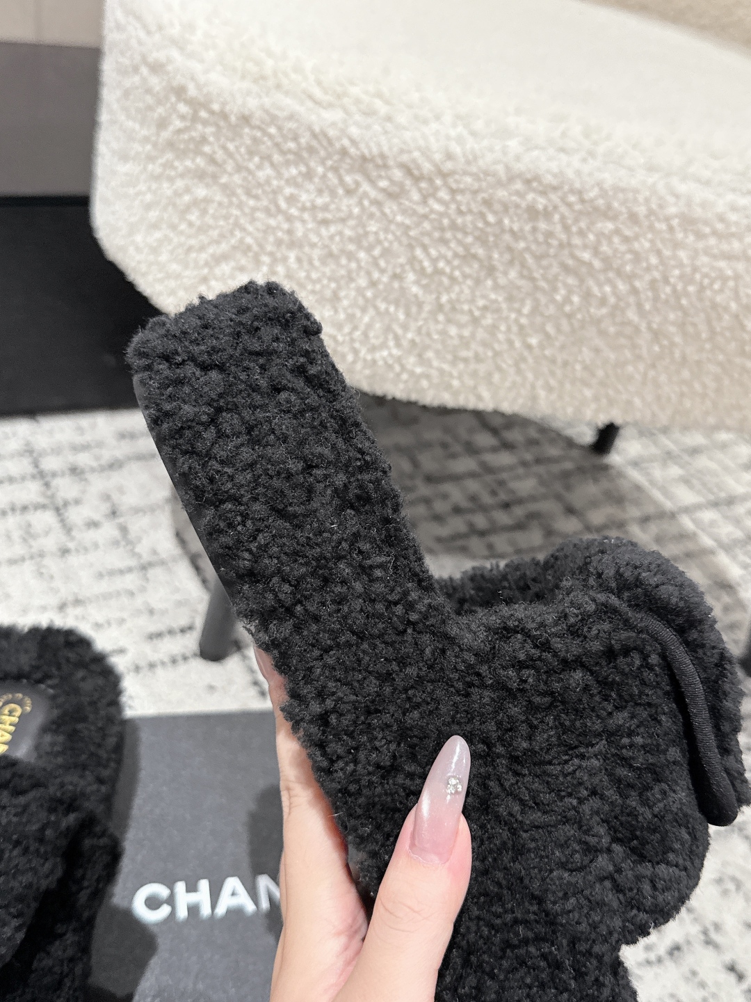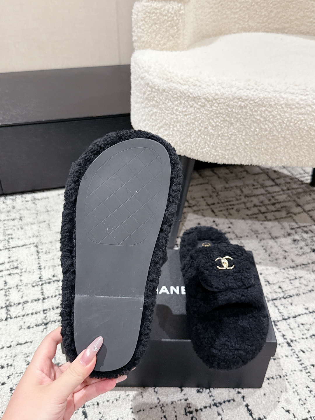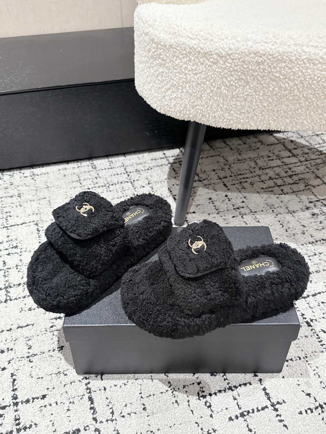 Experience the perfect blend of luxury and comfort with these Chanel shearling slippers. A must-have addition to your footwear collection.