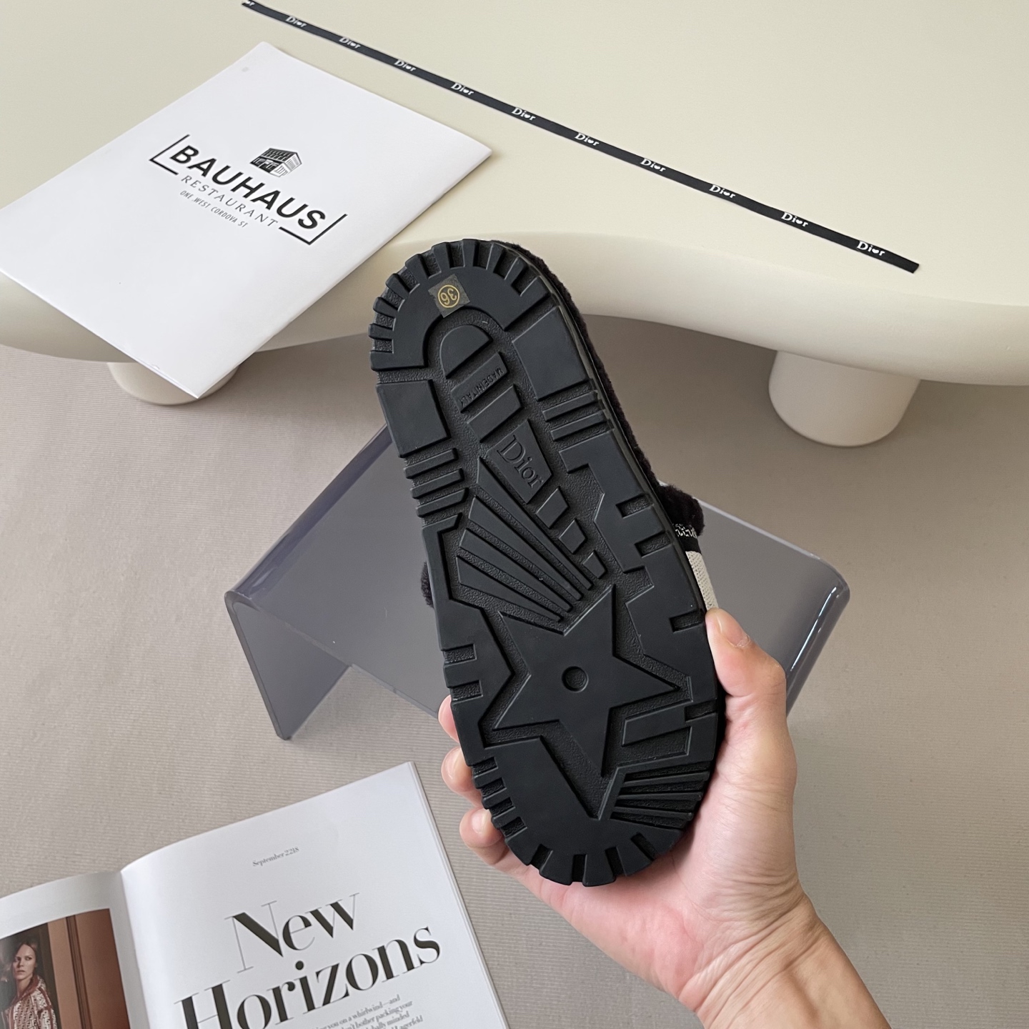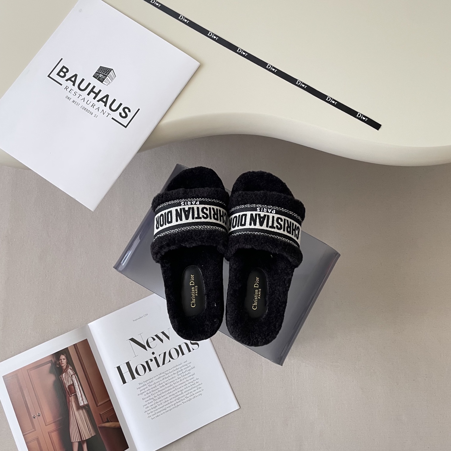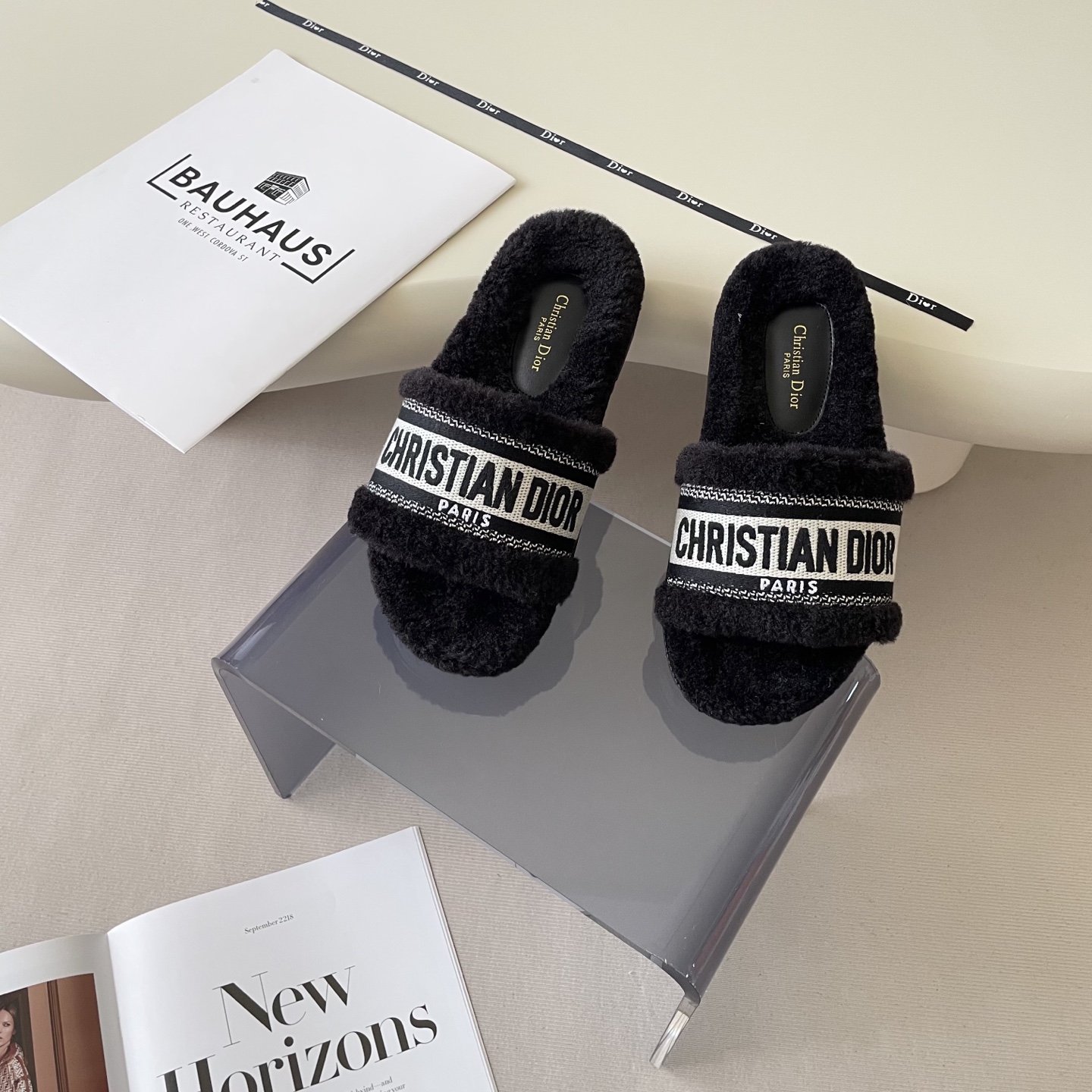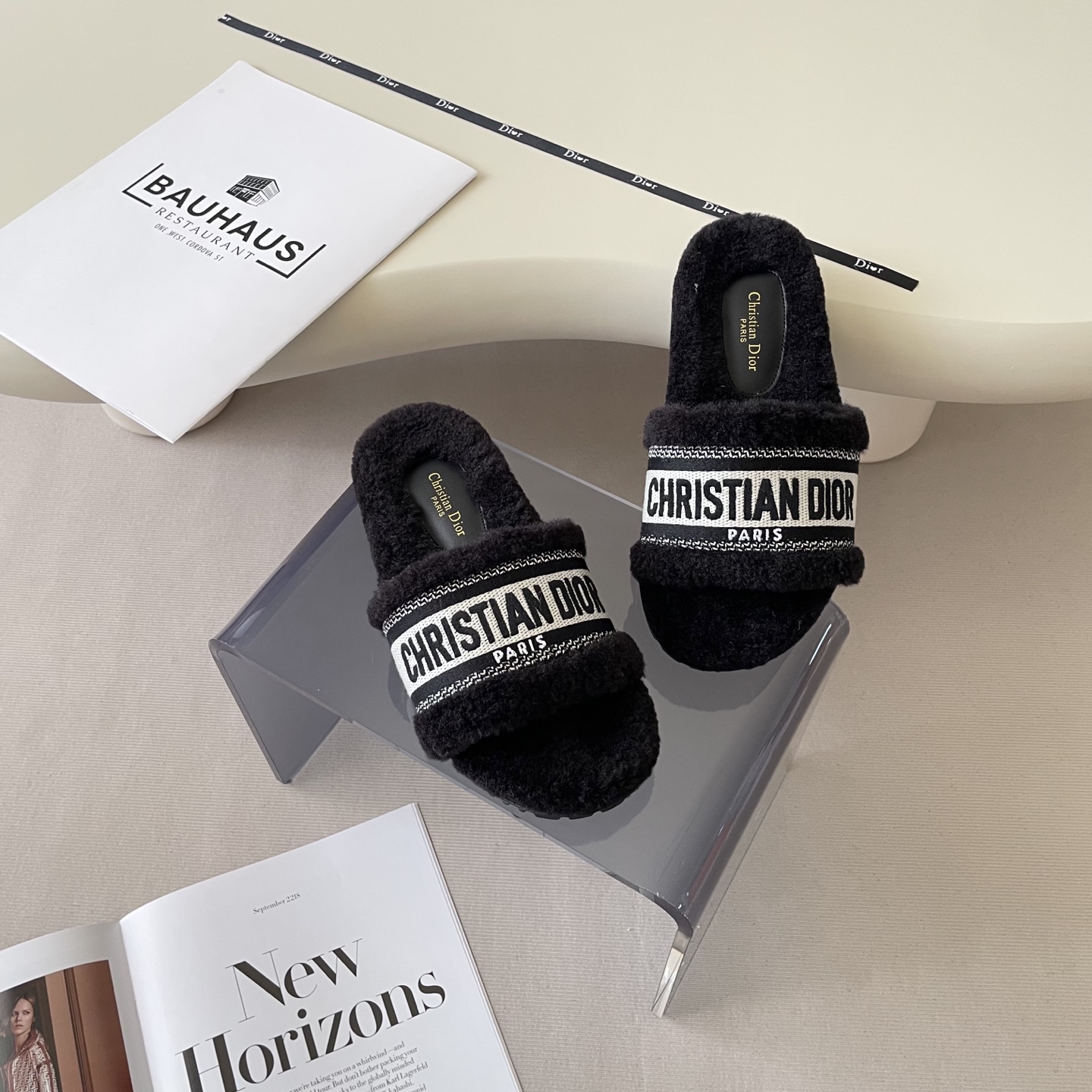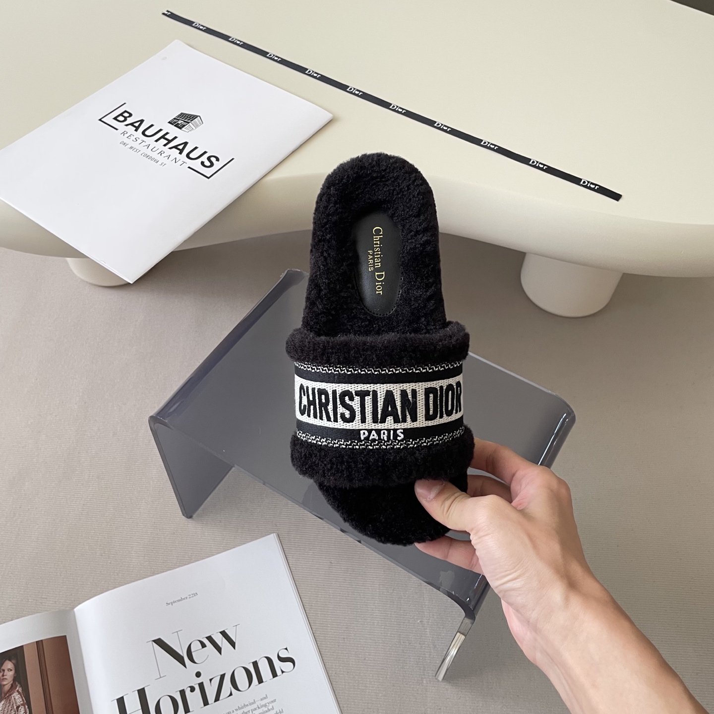 Step into luxury with these Dior lambswool slippers. Featuring exquisite embroidery and a cozy design, they're a must-have for fall and winter.