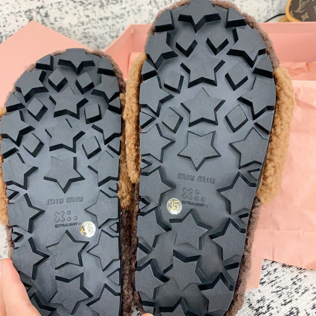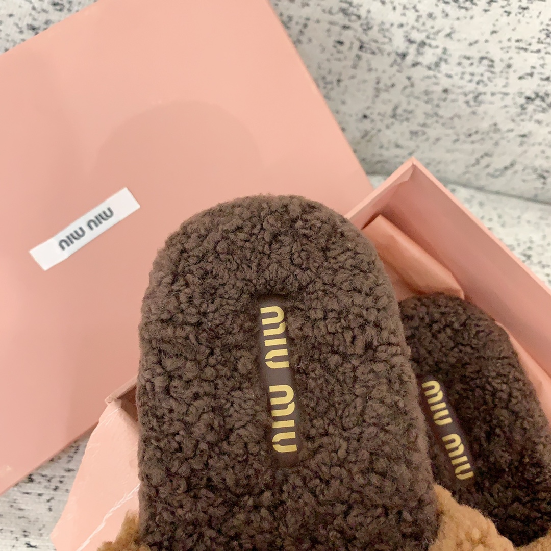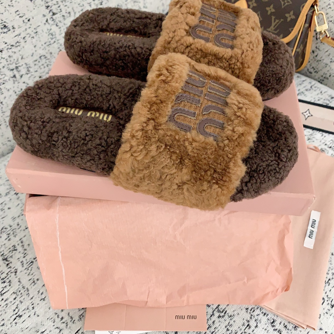 Miu Miu Women's Shearling Wool Slippers Fuzzy Warm Thick Bottom Flats
