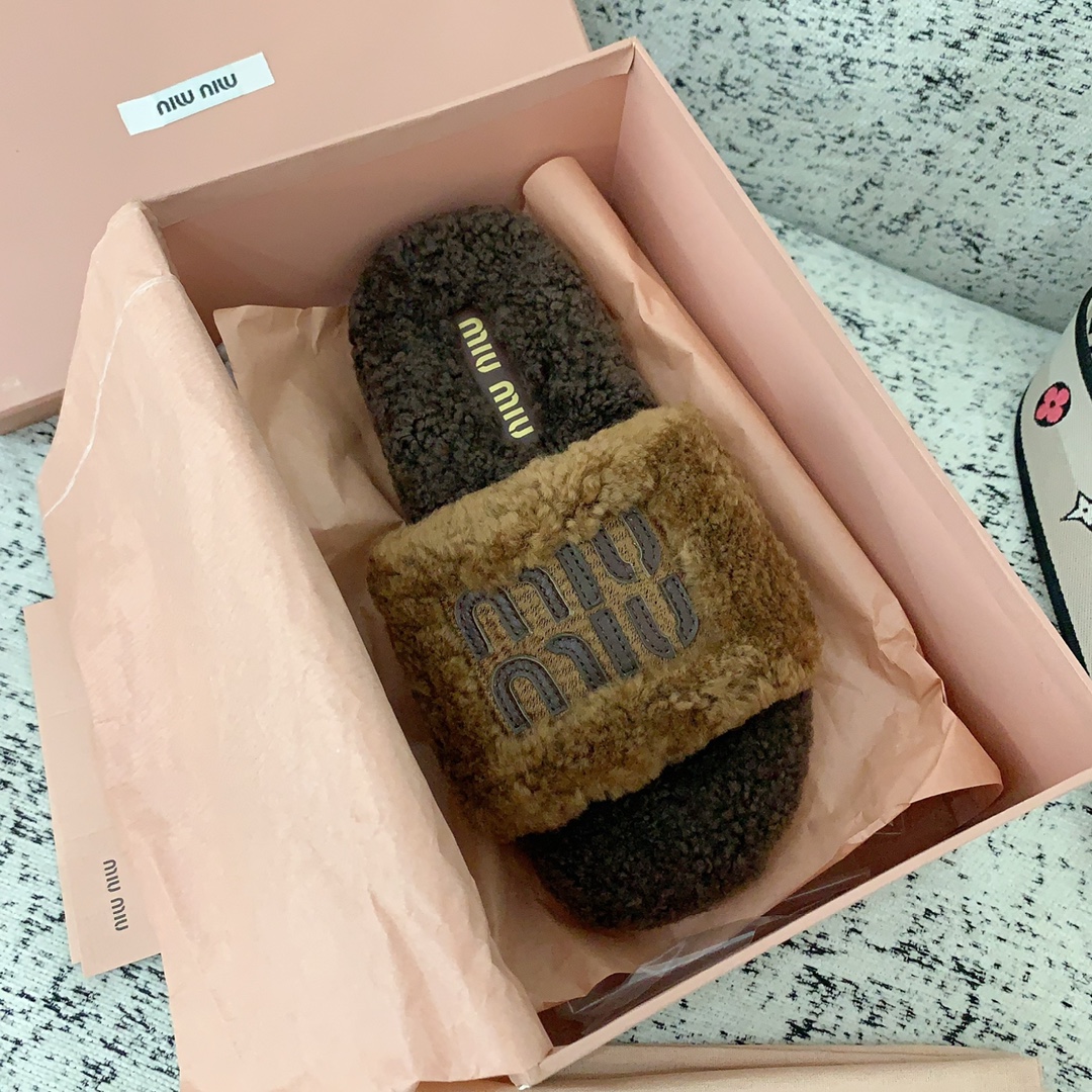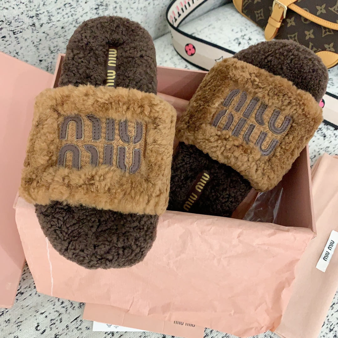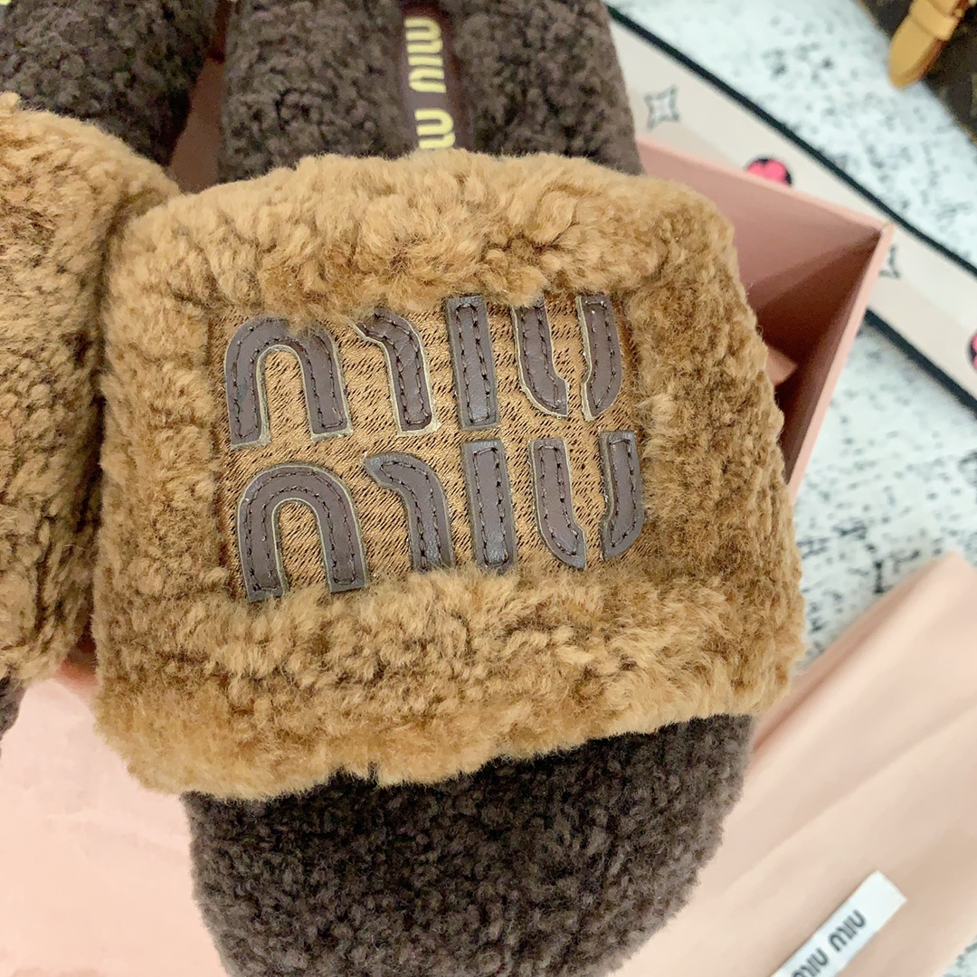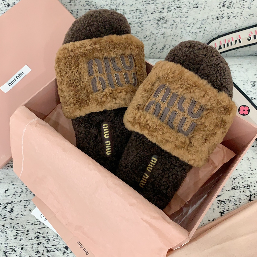Miu Miu Women's Shearling Wool Slippers Fuzzy Warm Thick Bottom Flats